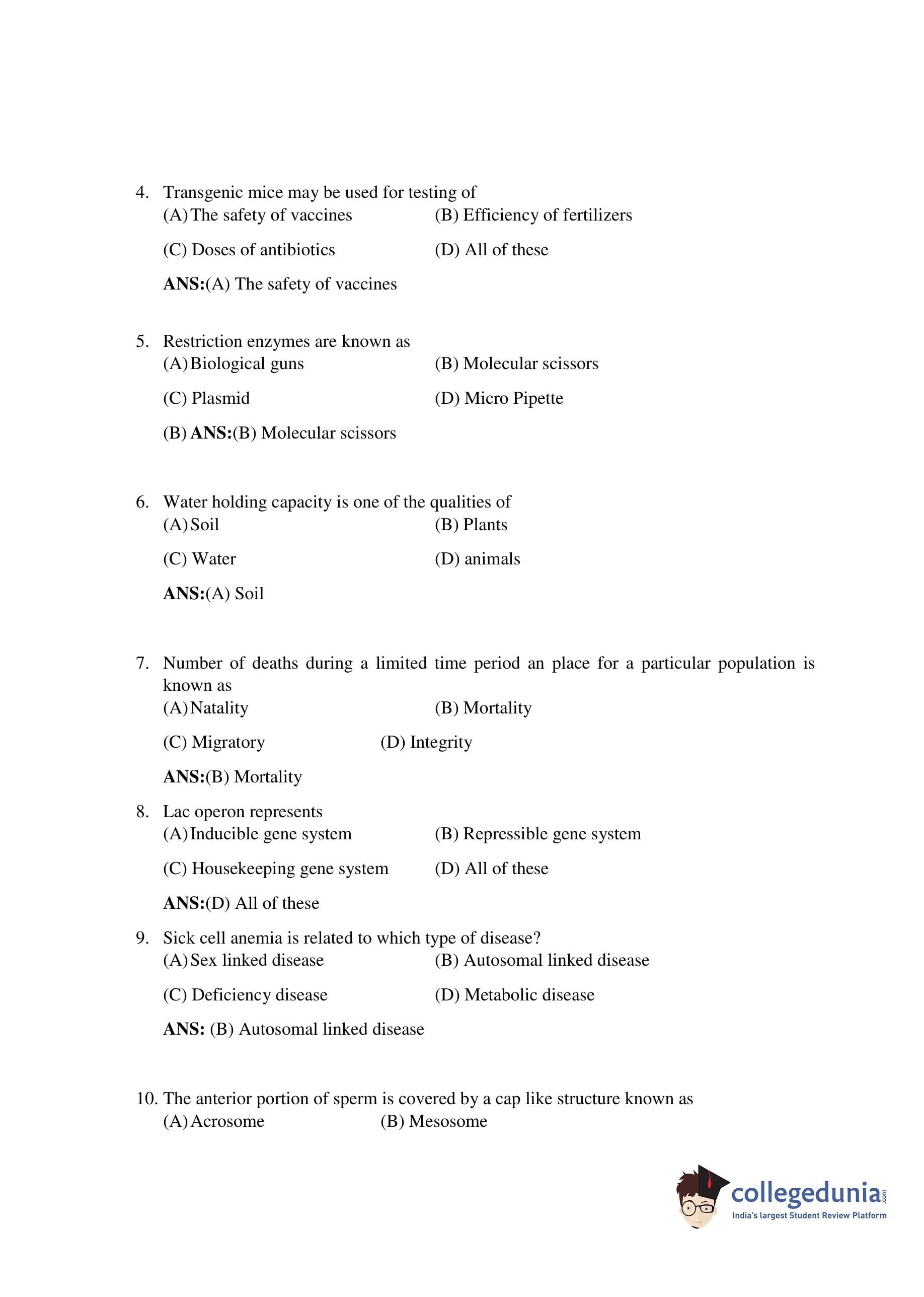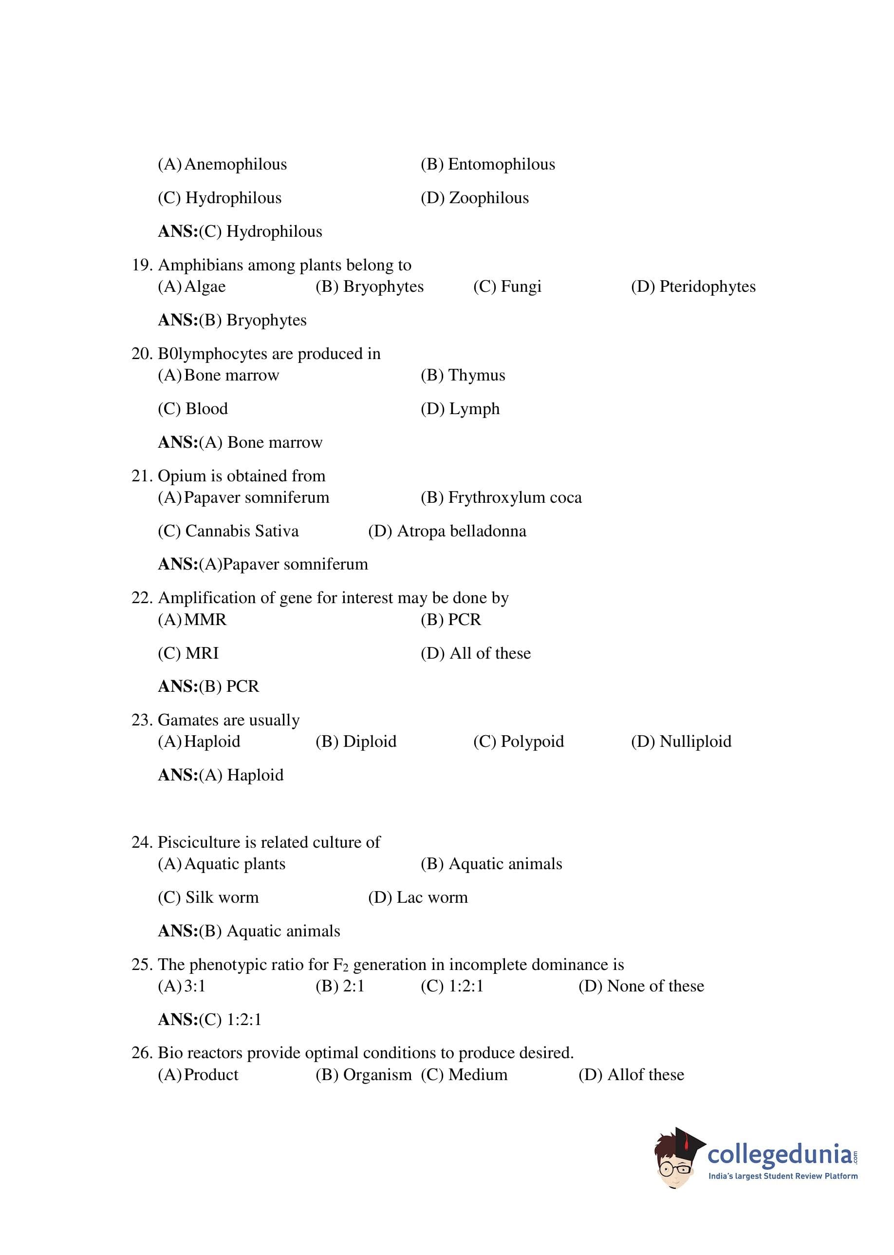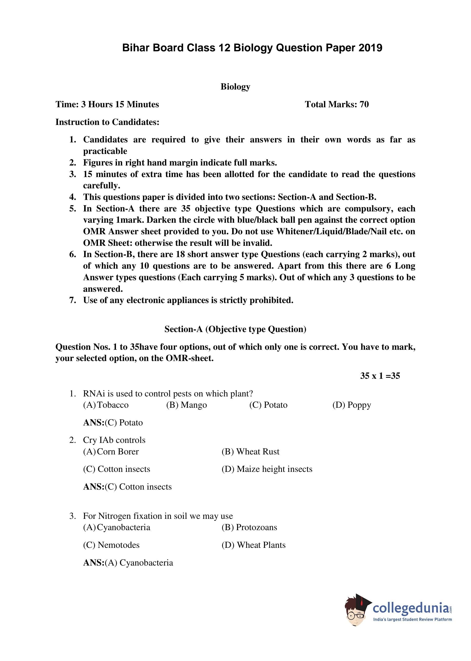 Bihar Board Class 12 Biology Question Paper 2019 with Answer Key is available for download. The exam was conducted by the BSEB on February 6 in the Morning Session 9:30 AM to 12:45 PM. The medium of paper was English. The question paper comprised a total of 59 questions divided among 2 sections.