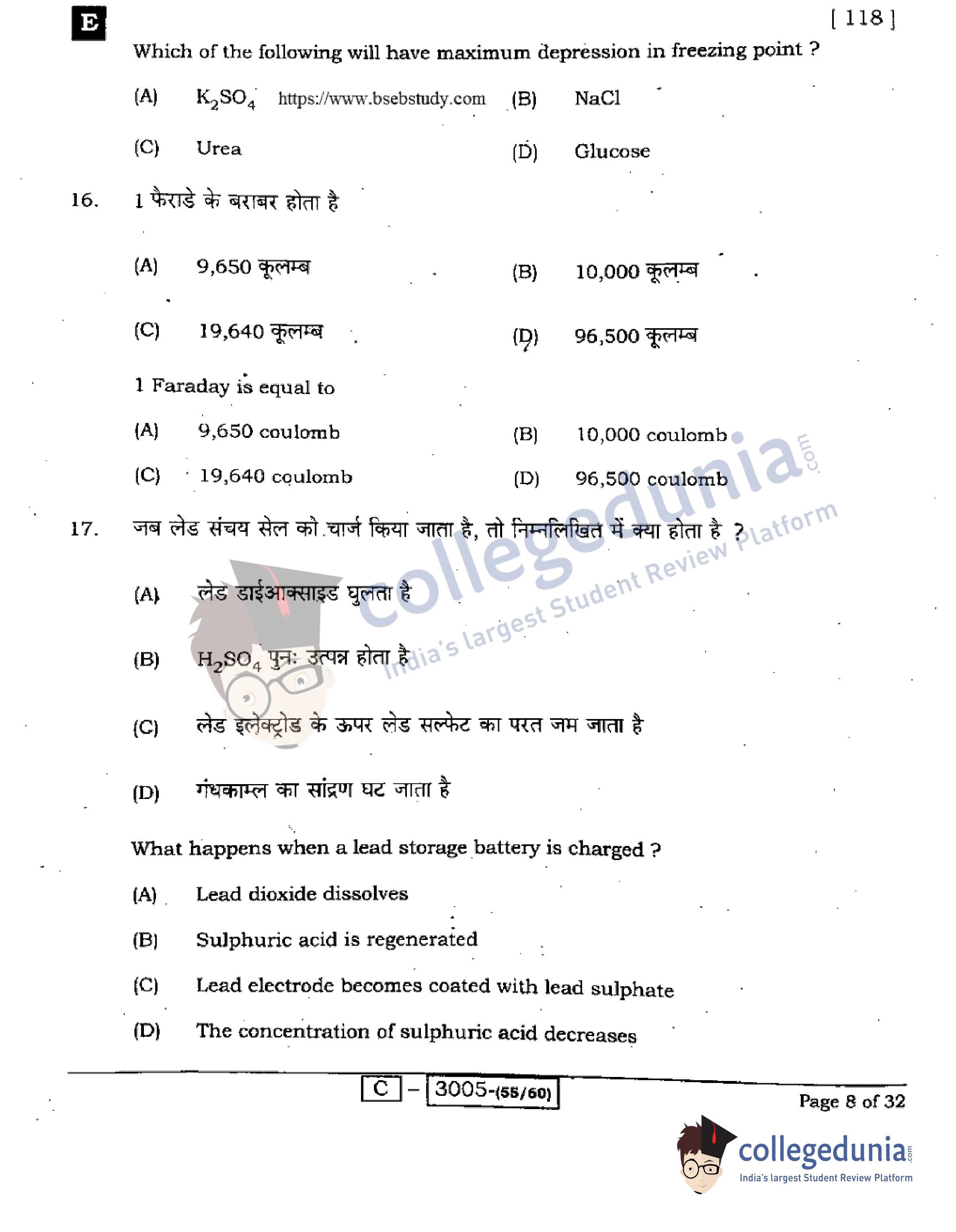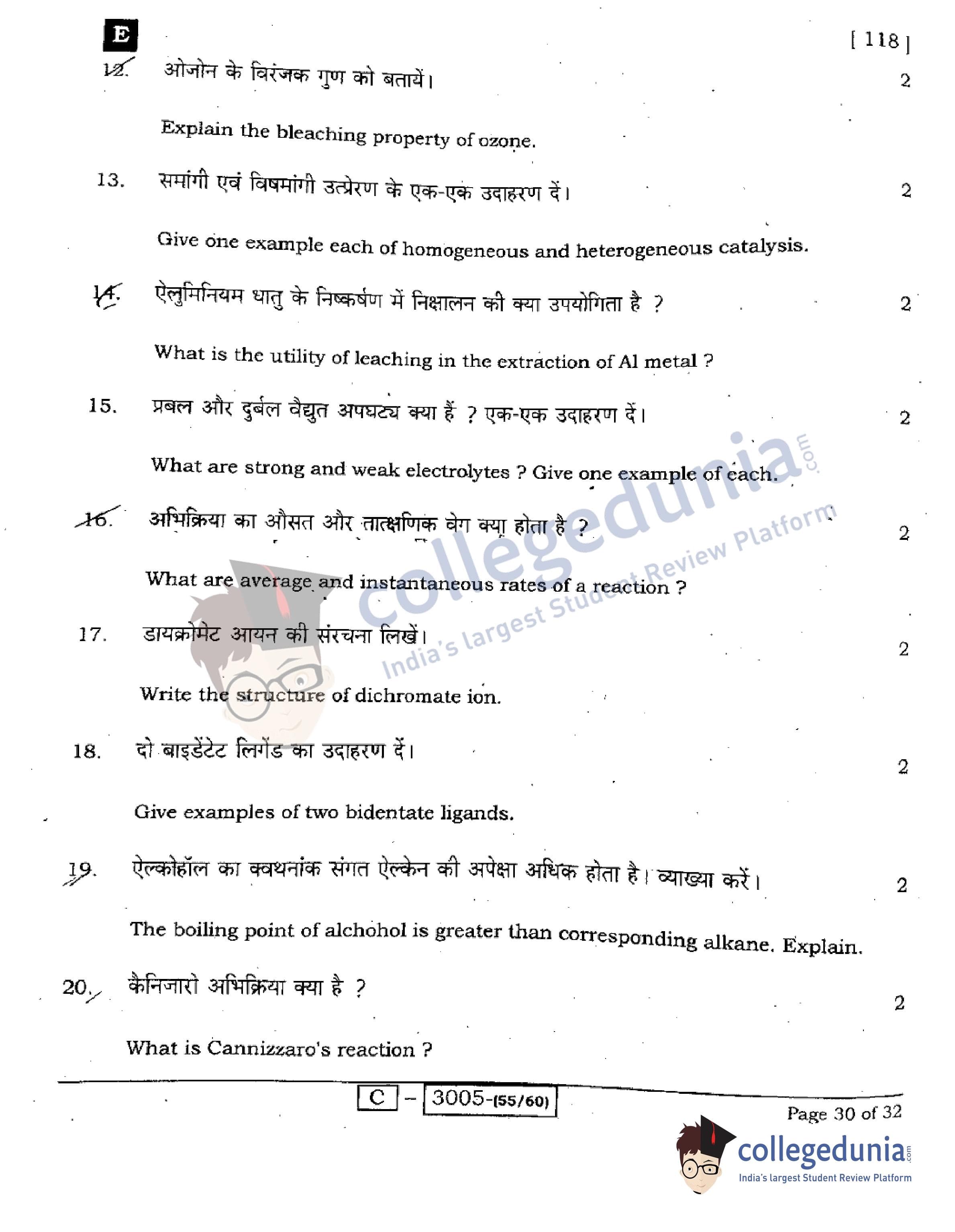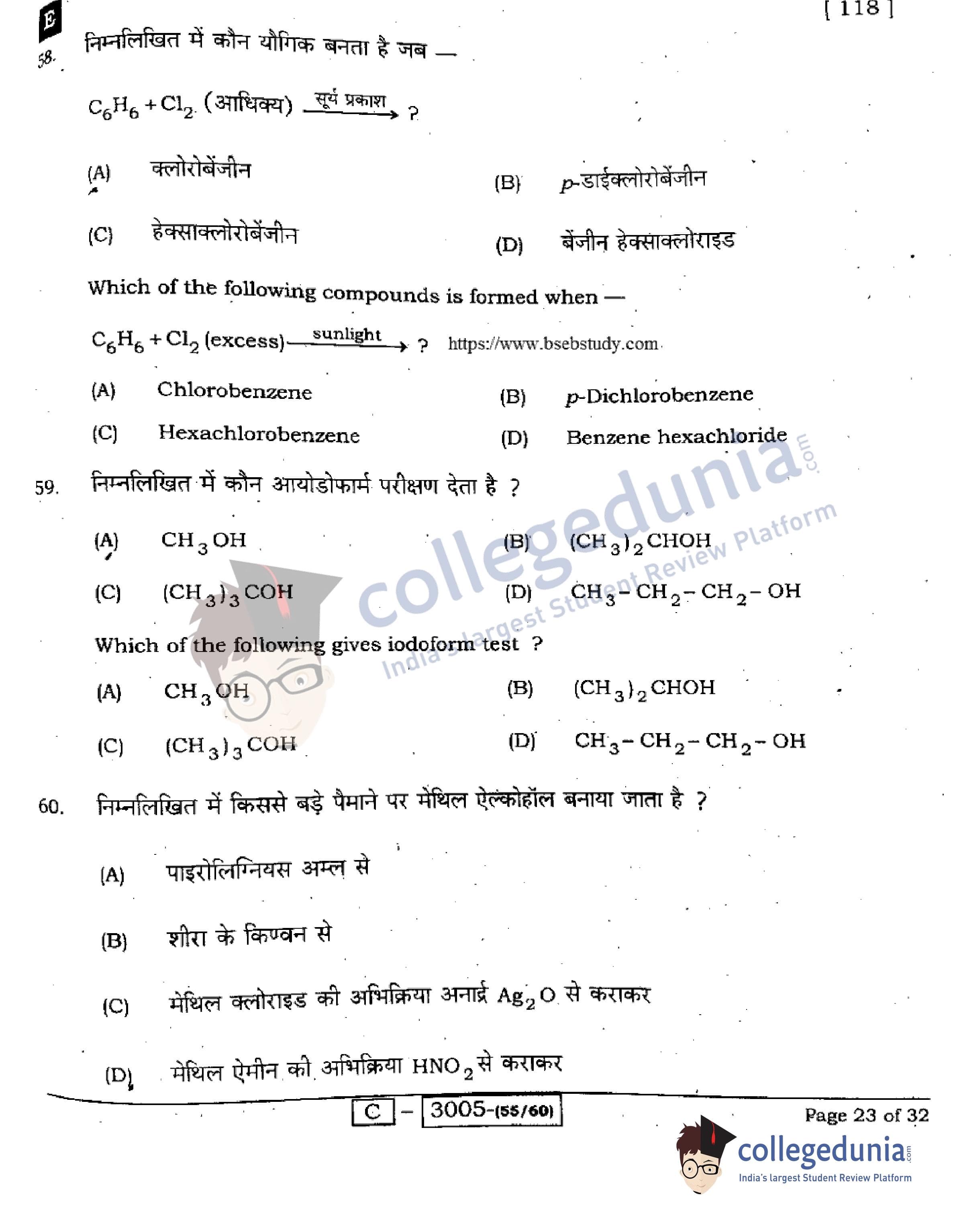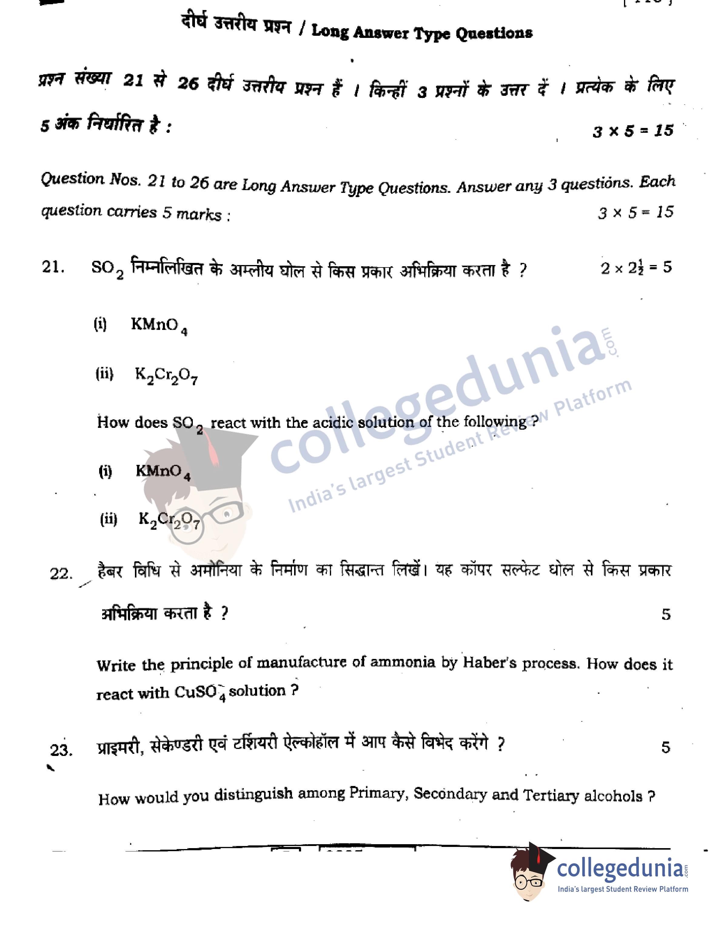 Bihar Board Class 12 Chemistry (Elective) Question Paper 2022 with Answer Key Set E is available for download. The exam was conducted by the BSEB . The medium of paper was English and Hindi. The question paper comprised a total of 96 questions divided among 2 sections.