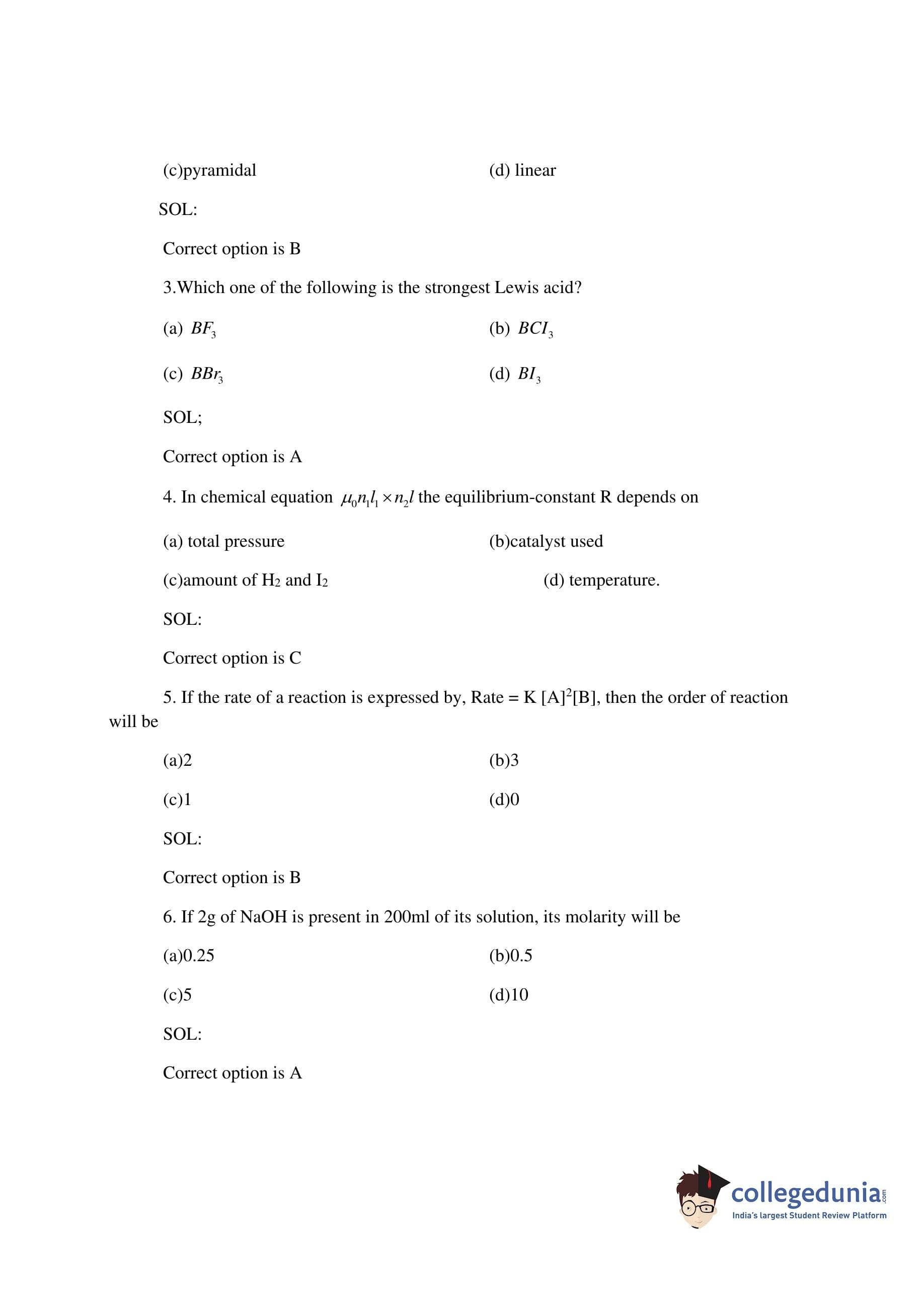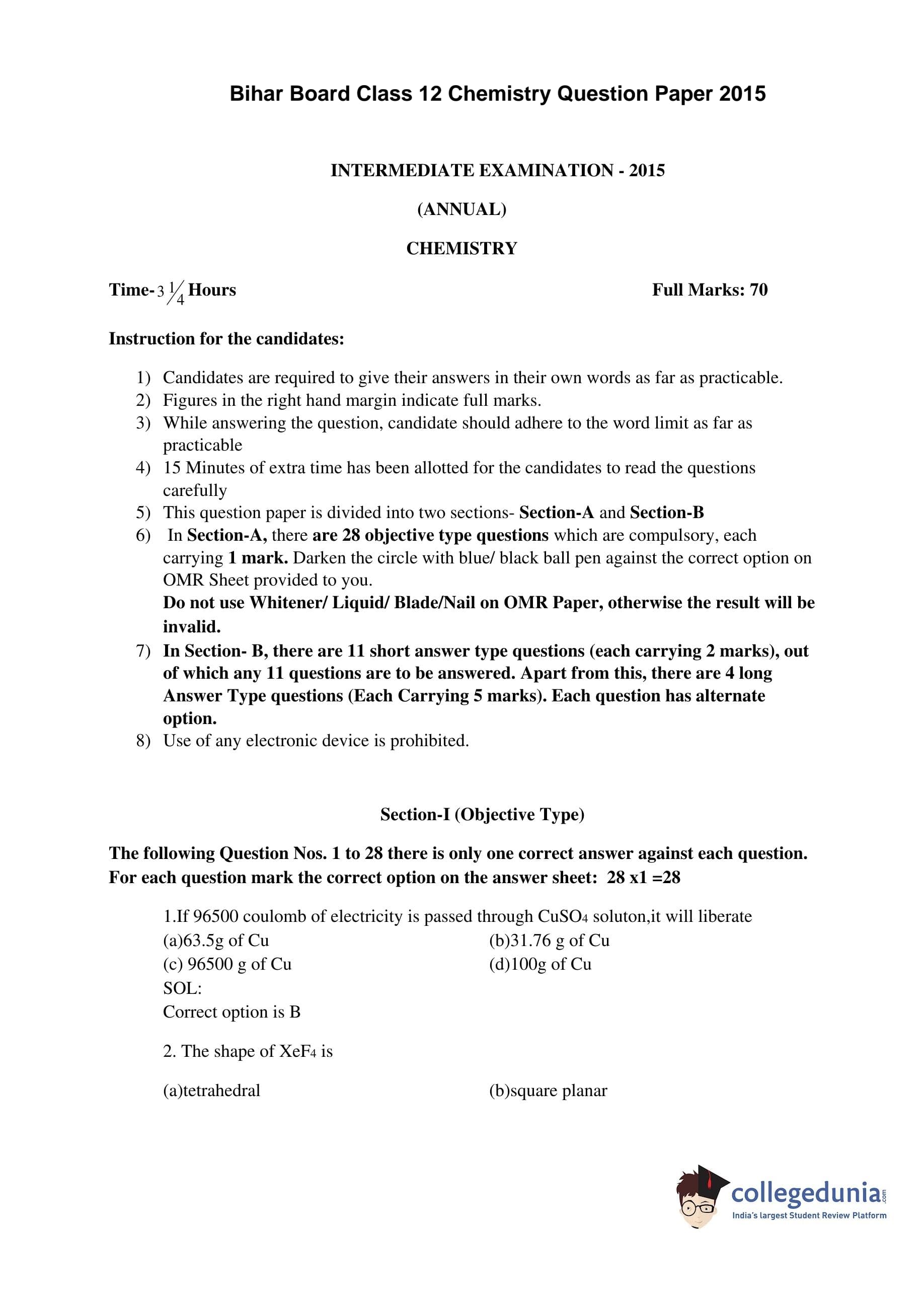 Bihar Board Class 12 Chemistry Question Paper 2015 with Answer Key is available for download. The exam was conducted by the BSEB. In terms of difficulty level, Bihar Board Class 12 Chemistry paper was of level. The question paper comprised a total of questions.