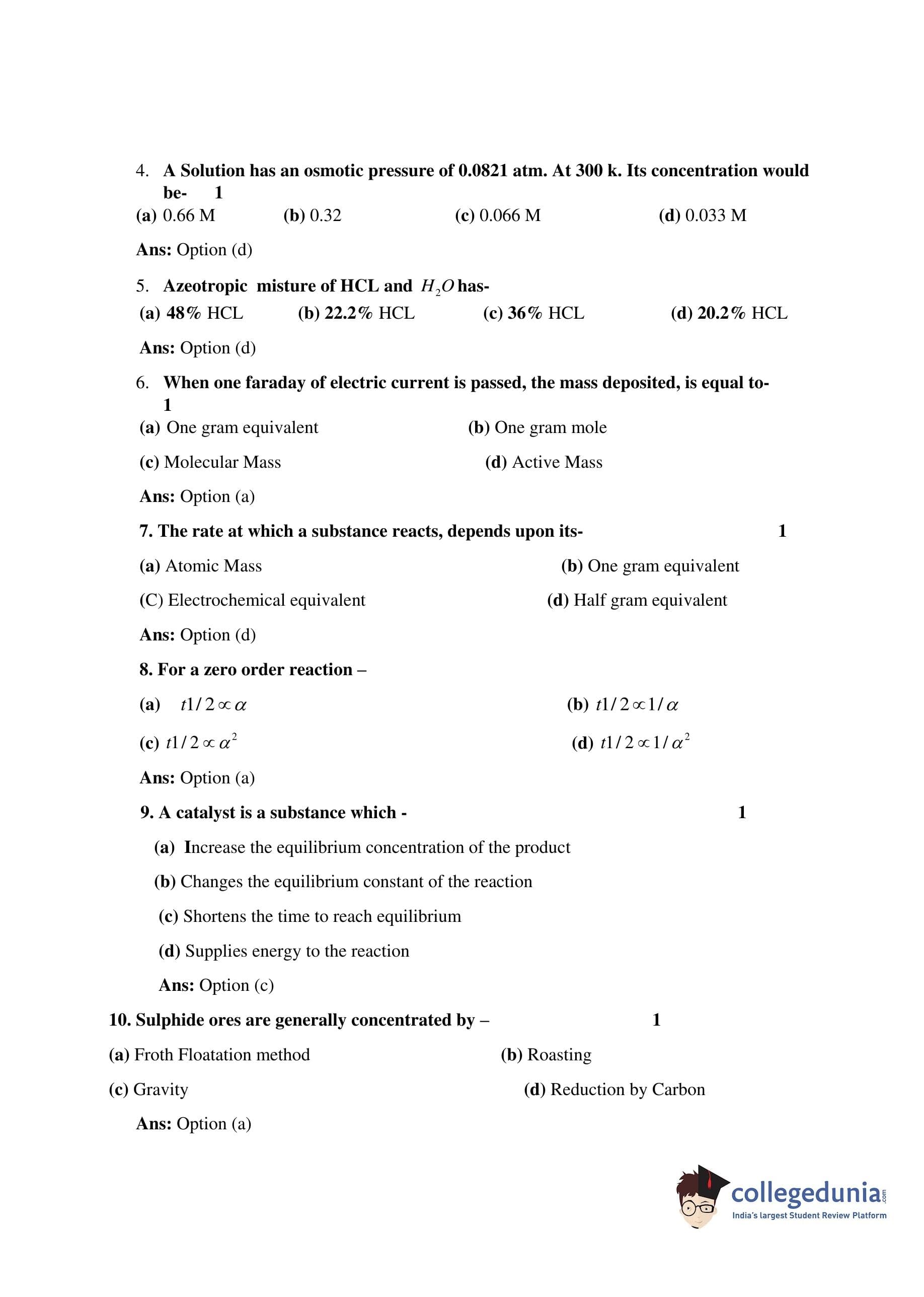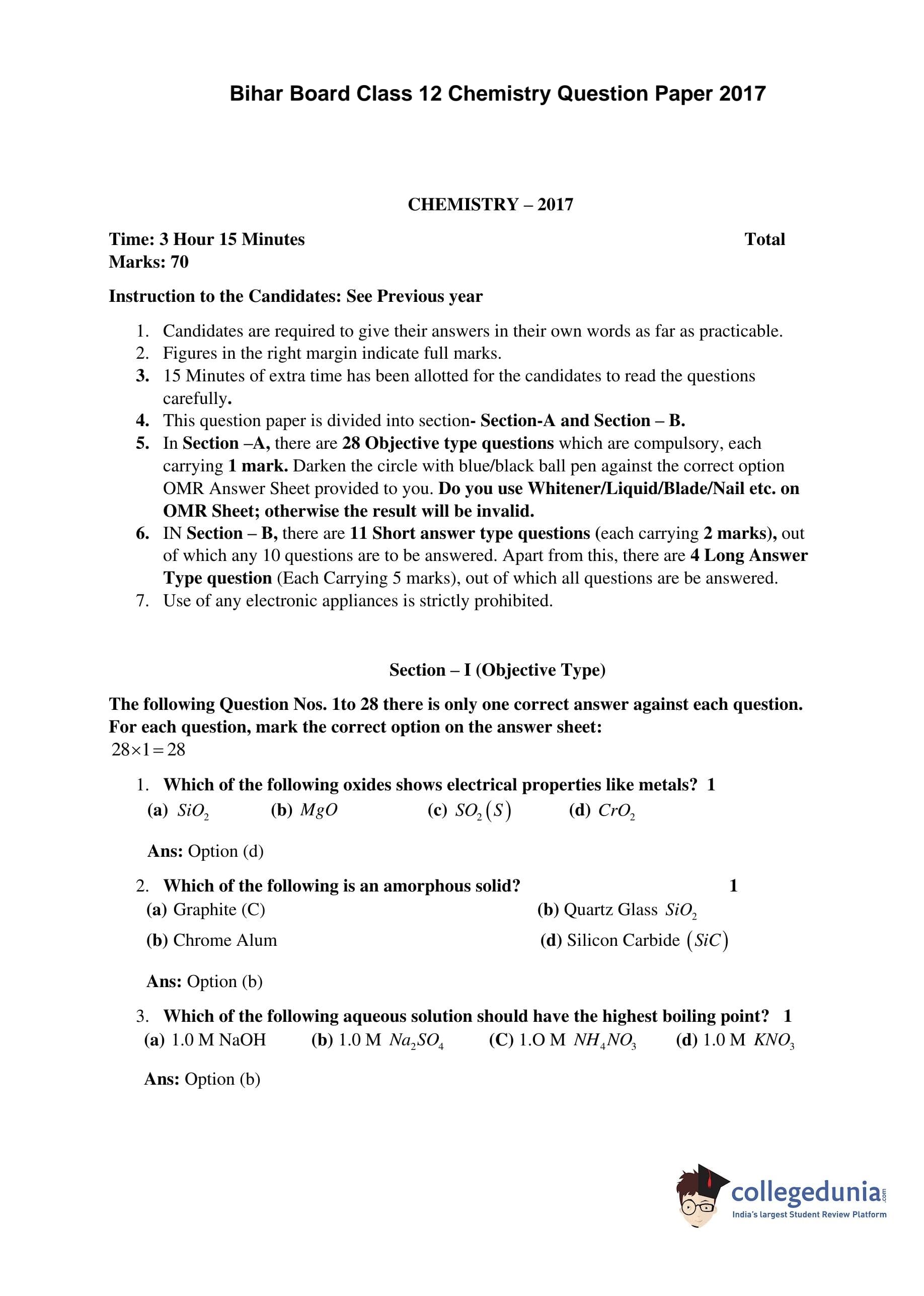 Bihar Board Class 12 Chemistry Question Paper 2017 with Answer Key (February 18 )