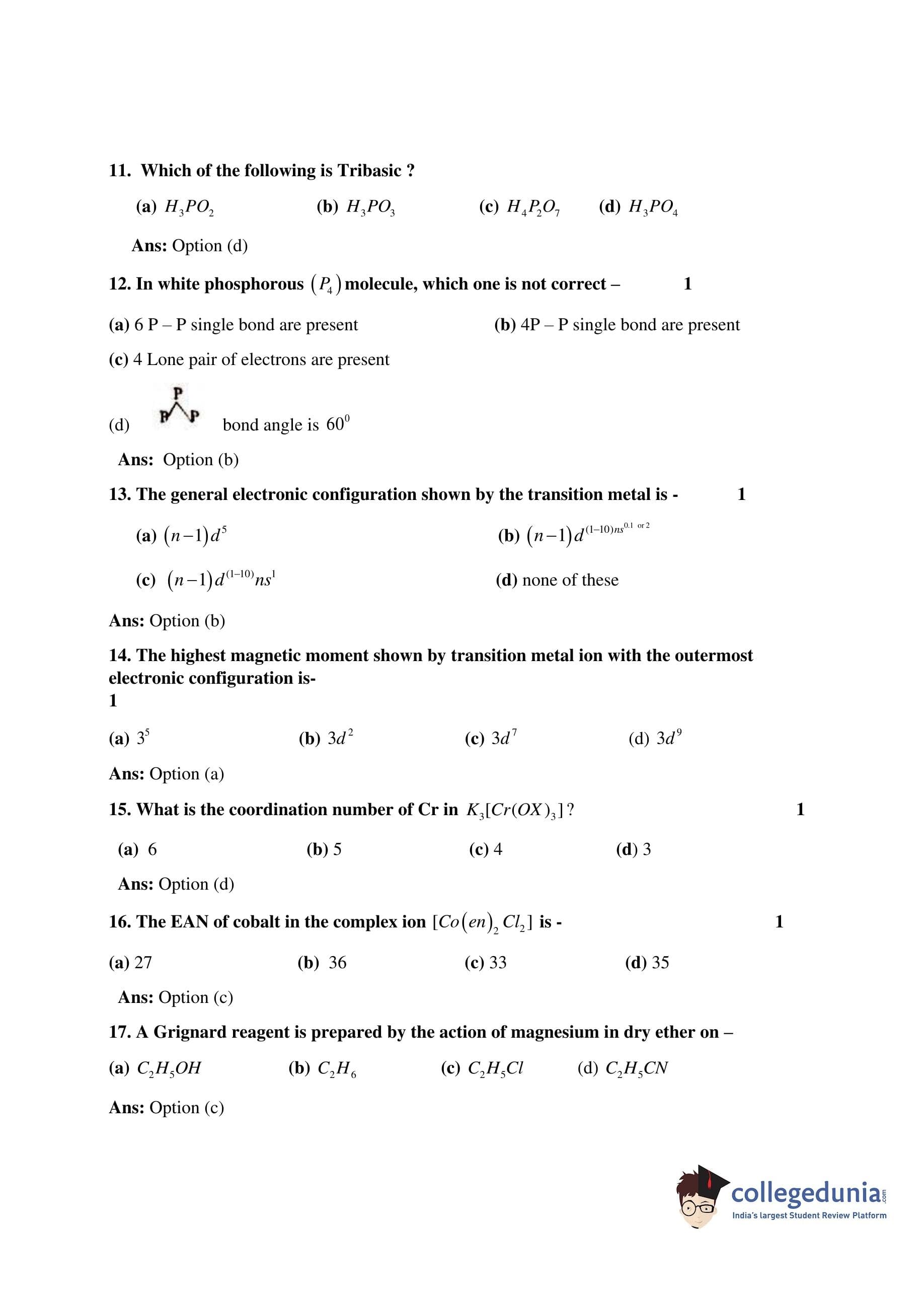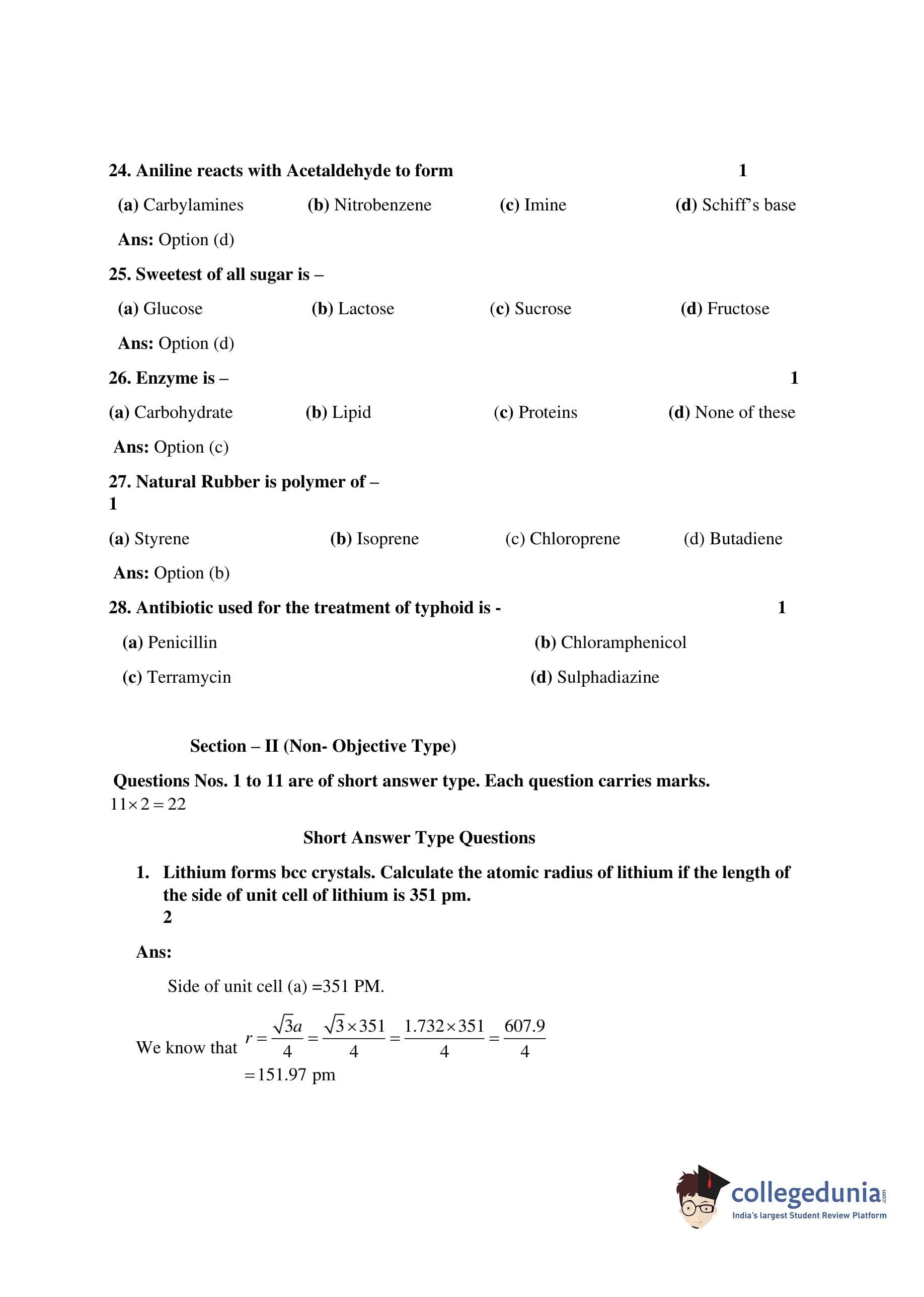 Bihar Board Class 12 Chemistry Question Paper 2017 with Answer Key is available for download. The exam was conducted by the BSEB on February 18 in the Morning Session 9:45 AM to 1 PM. The medium of paper was English. The question paper comprised a total of 39 questions divided among 2 sections.