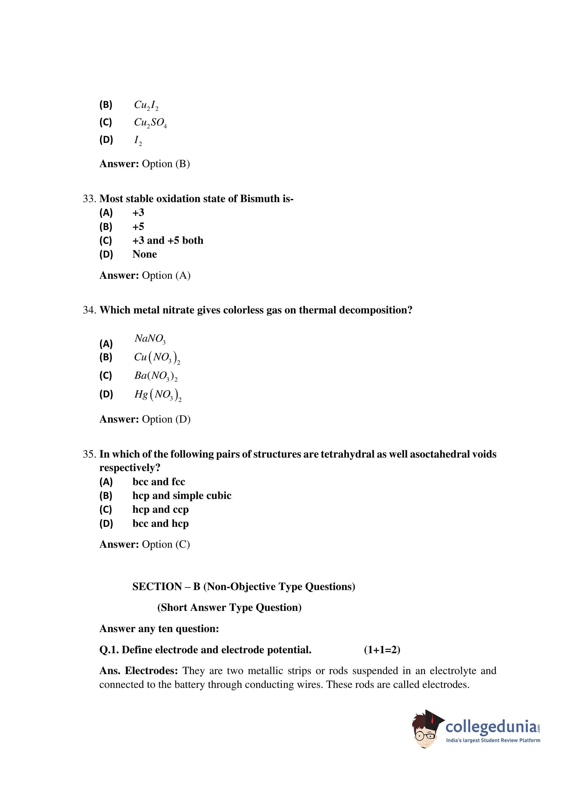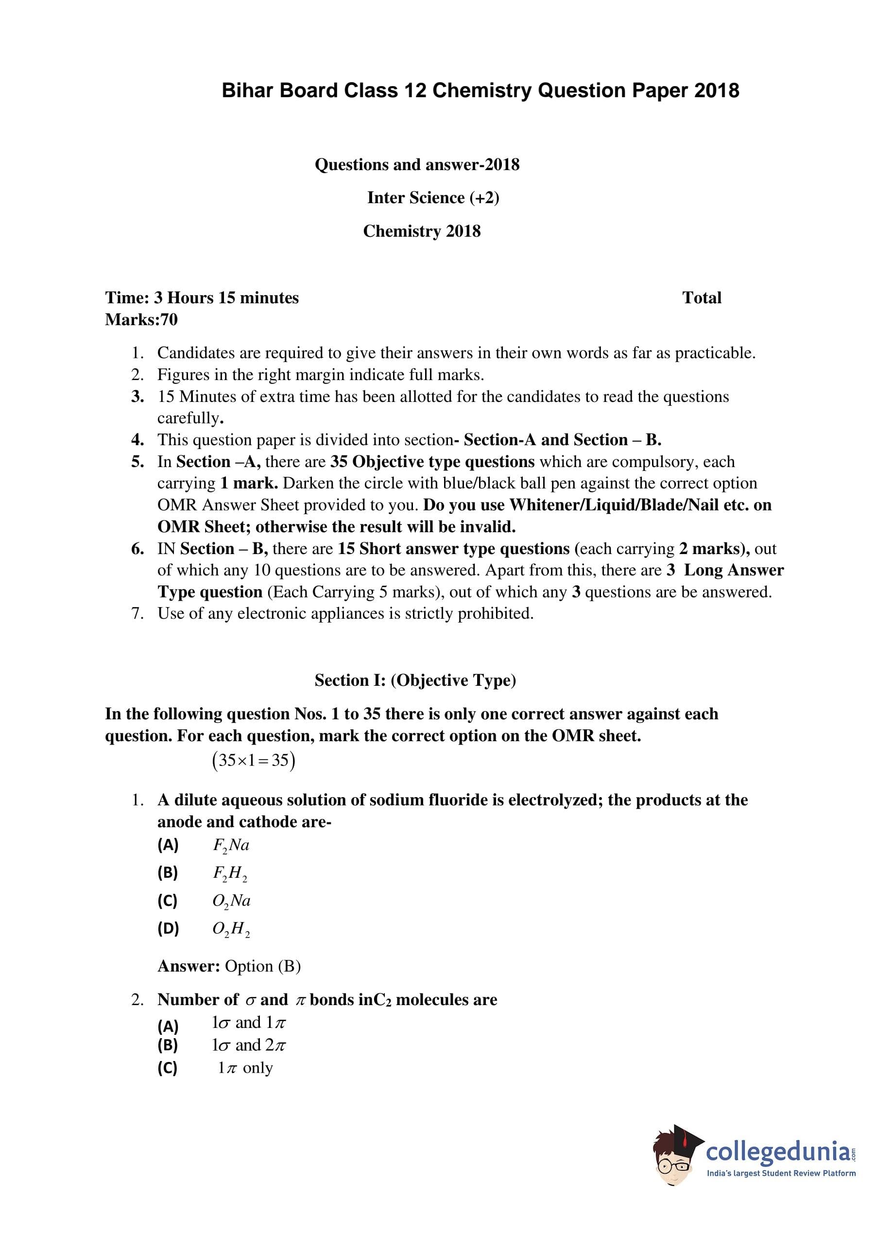 Bihar Board Class 12 Chemistry Question Paper 2018 with Answer Key is available for download. The exam was conducted by the BSEB on February 10 in the Morning Session 9:45 AM to 1 PM. The medium of paper was English. The question paper comprised a total of 50 questions divided among 2 sections.