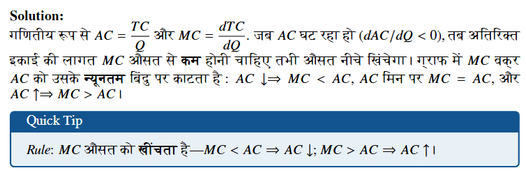 लाभ‑अधिकतम संतुलन के लिए आवश्यक (first‑order) शर्त \(MR=MC\) है। पर्याप्त (second‑order) शर्त—उस बिंदु पर \(MC\) बढ़ती (उर्ध्वमुख) हो, अर्थात \(MC\) वक्र \(MR\) को नीचे से काटे। केवल \(MR=MC\) कह देने से अधिकतम/न्यूनतम में भेद स्पष्ट नहीं होता। Quick Tip: Rule of thumb: \(MR=MC\) & \(dMC/dQ>0\) (या \(MC\) cuts \(MR\) from below) ⇒ स्थिर संतुलन।