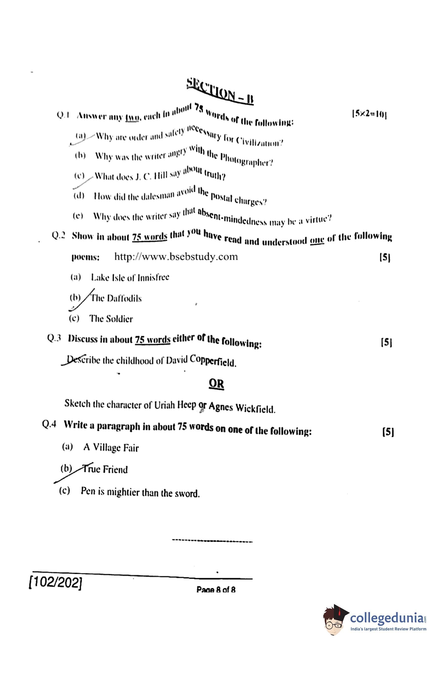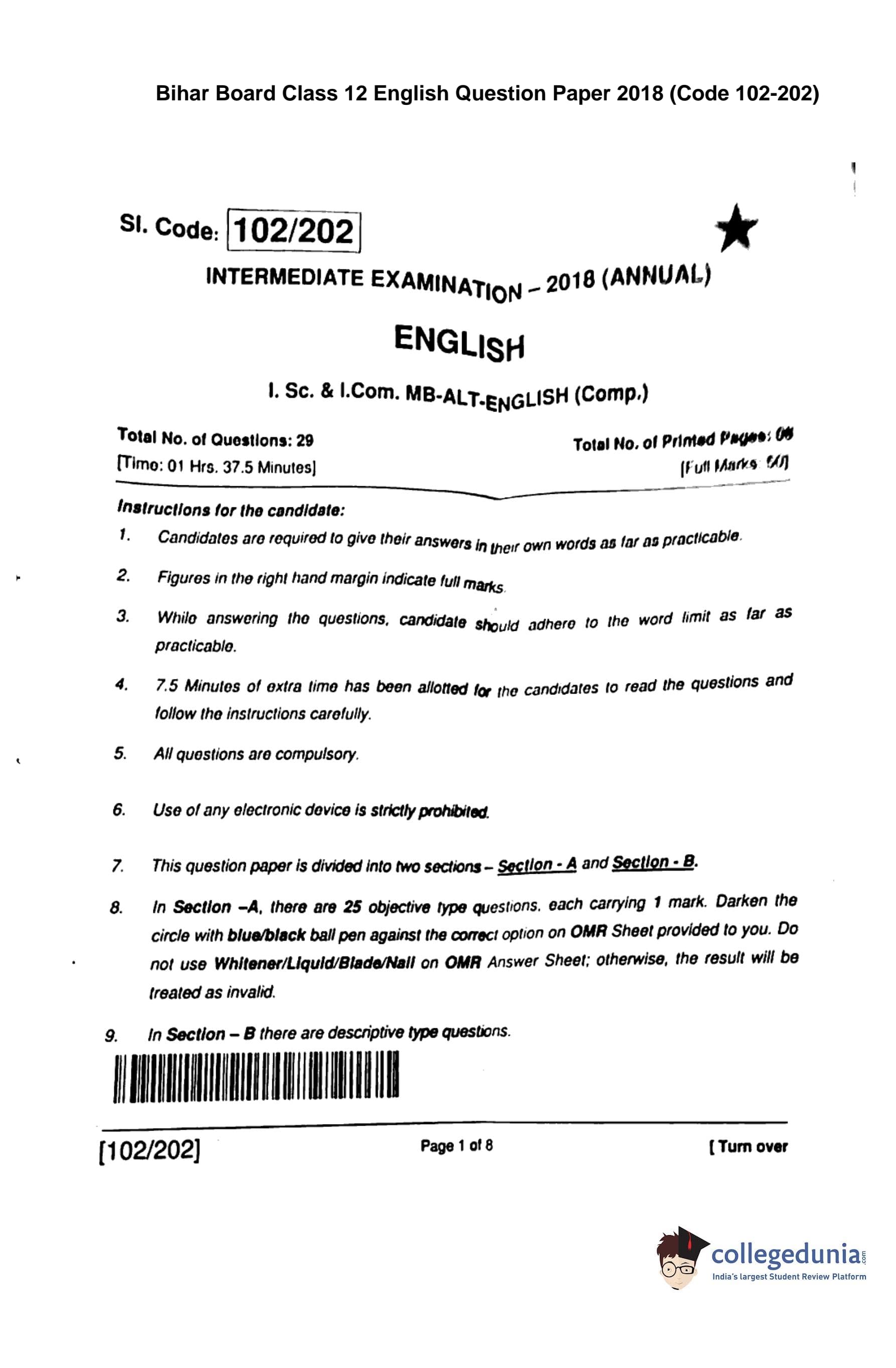 Bihar Board Class 12 English Question Paper 2018 with Answer Key Code 102-202 is available for download. The exam was conducted by the BSEB on February 13 in the Morning Session 9:45 AM to 1 PM. The medium of paper was English. The question paper comprised a total of 29 questions divided among 2 sections.