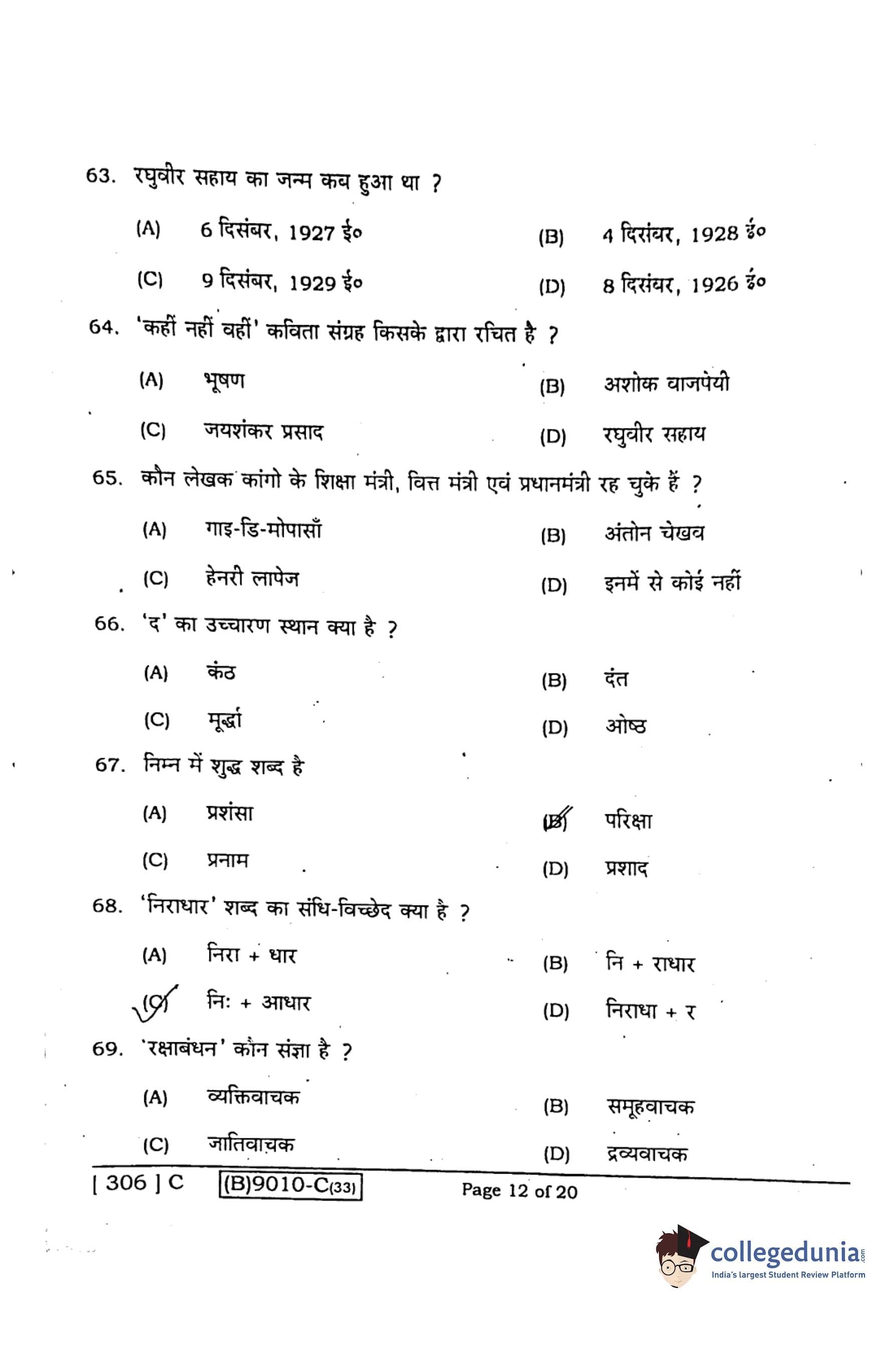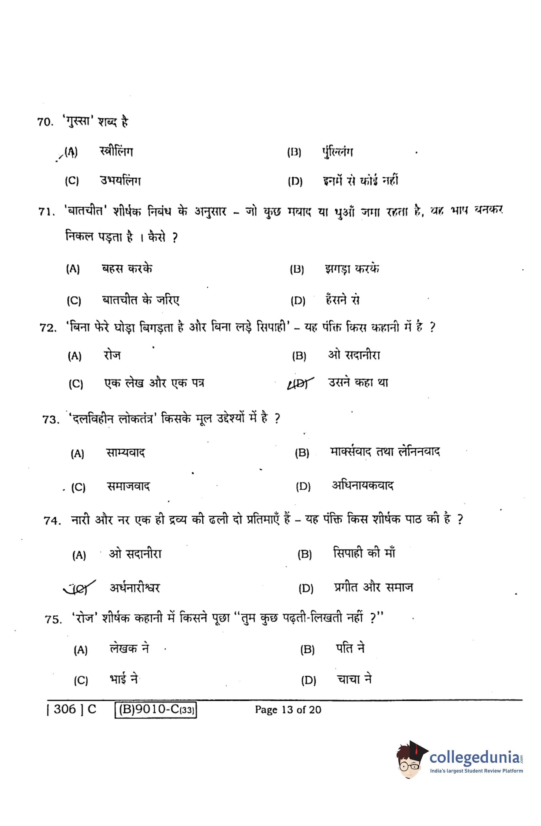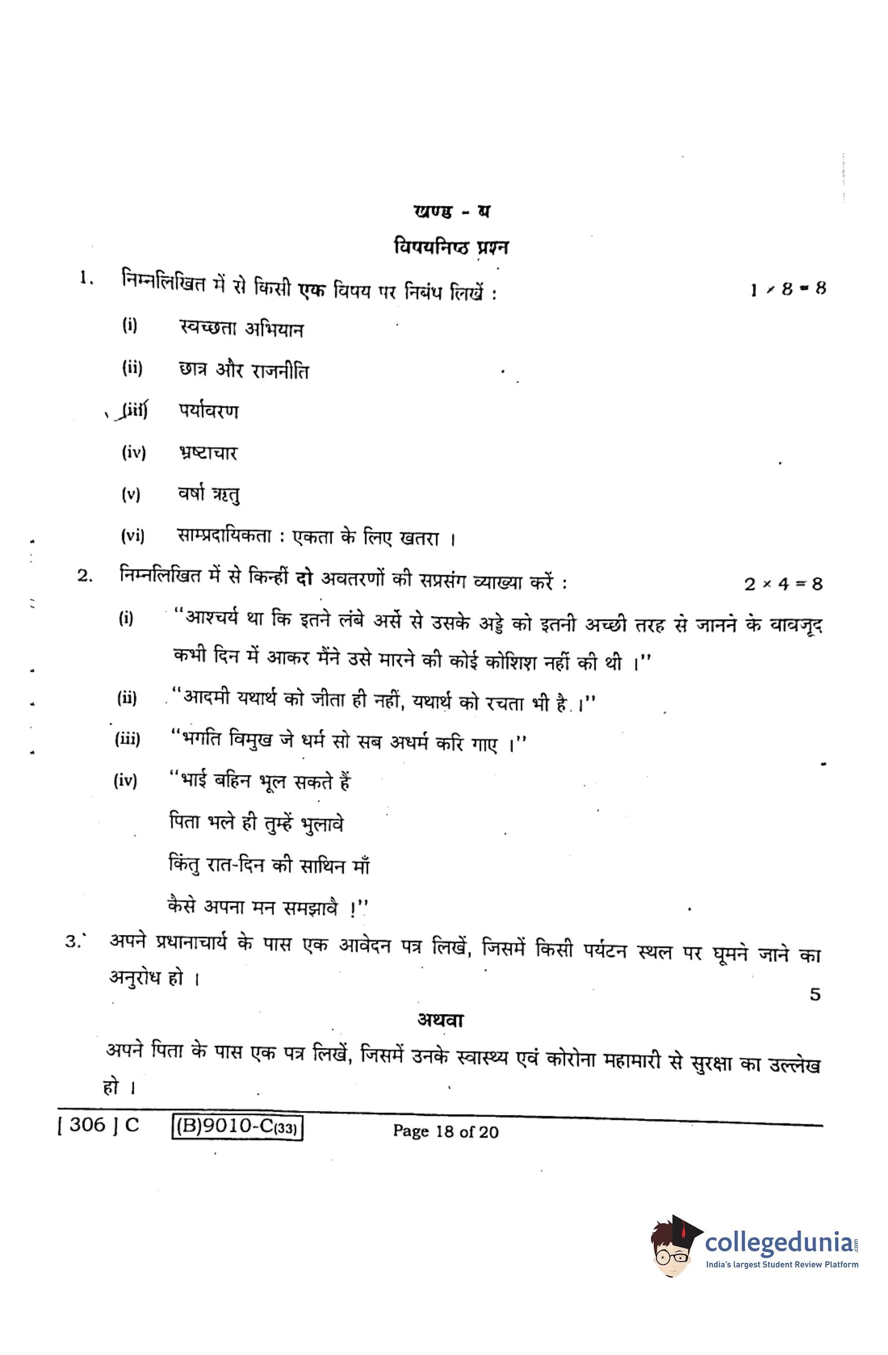 Bihar Board Class 12 Hindi Code 306-C Question Paper 2021 with Answer Key (Febrarury 6)