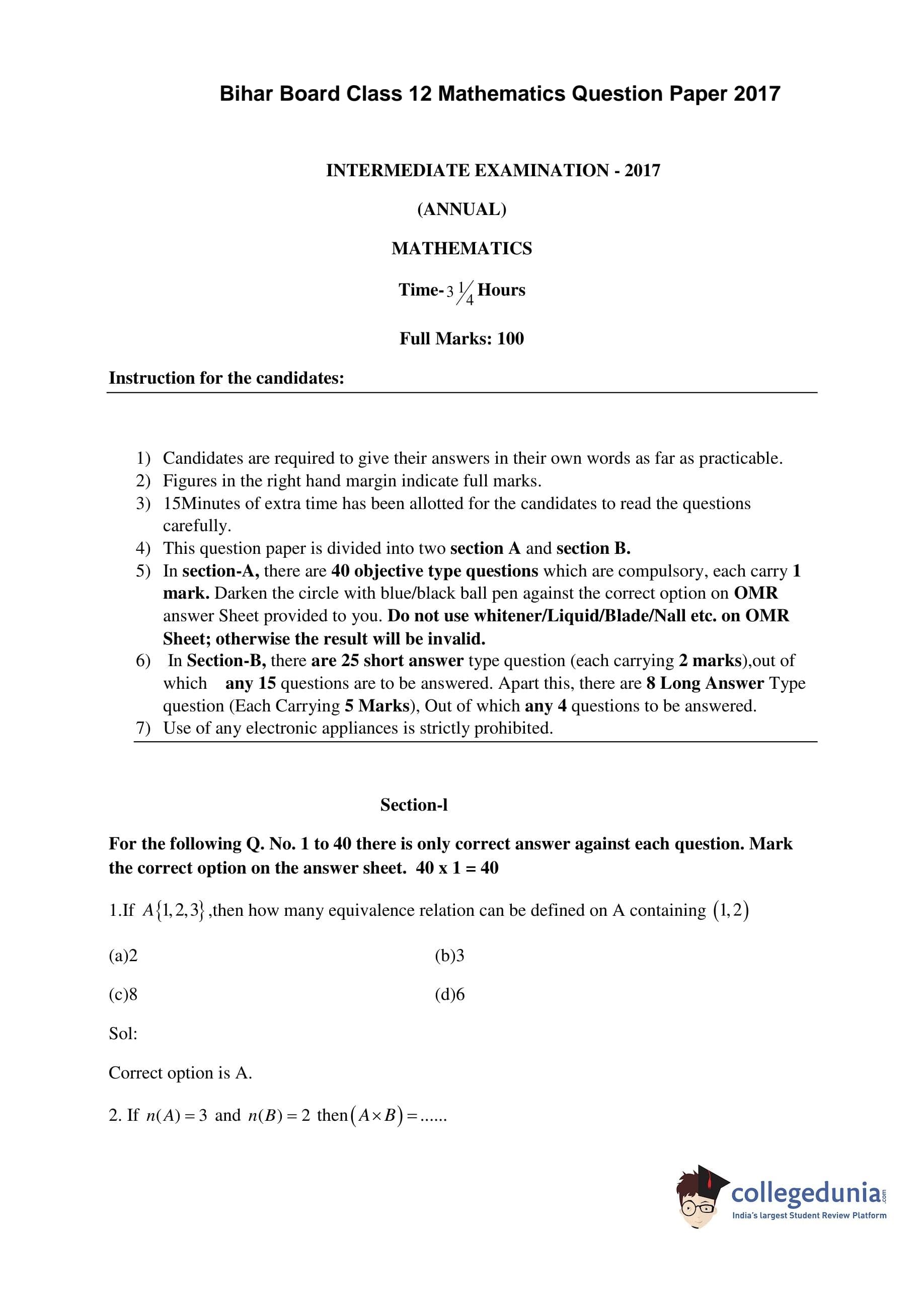 | Bihar Board Class 12 Mathematics Question Paper 2017 PDF | Bihar Board Class 12 Mathematics Answer Key 2017 PDF |