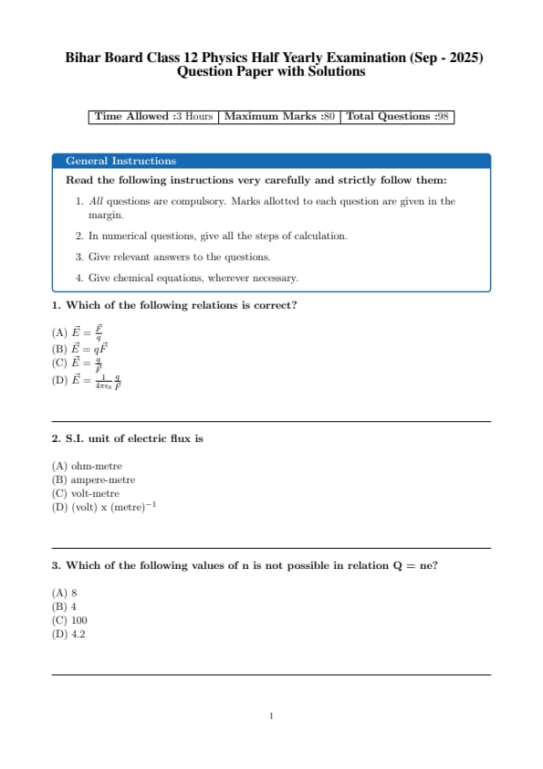 Bihar Board Class 12 Physics Half Yearly Question Paper PDF with Solutions is available for download. The Bihar School Examination Board (BSEB) conducted the Class 12 Half Yearly examination for a total duration of 3 hours 15 minutes on 19th September 2025 , and the question paper was of a total of 80 marks.