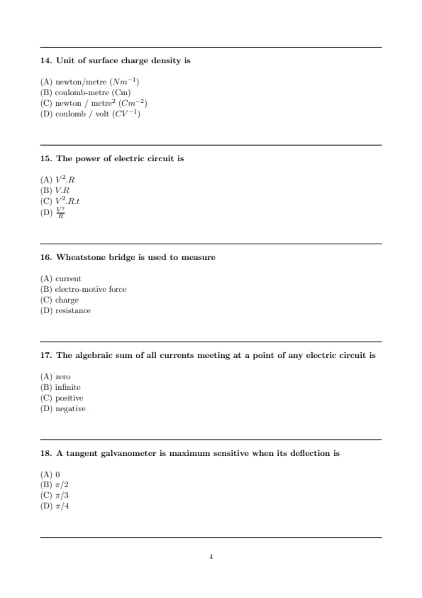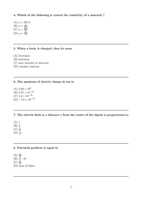 Quick Tip: Remember the units to verify the formula. Resistance (R) is in Ohms (\(\Omega\)), Area (A) is in \(m^2\), and Length (L) is in \(m\). The unit of resistivity (\(\rho\)) is Ohm-metre (\(\Omega \cdot m\)). Plugging the units into option (C): \(\frac{\Omega \cdot m^2}{m} = \Omega \cdot m\). This dimensional analysis confirms the formula is correct.