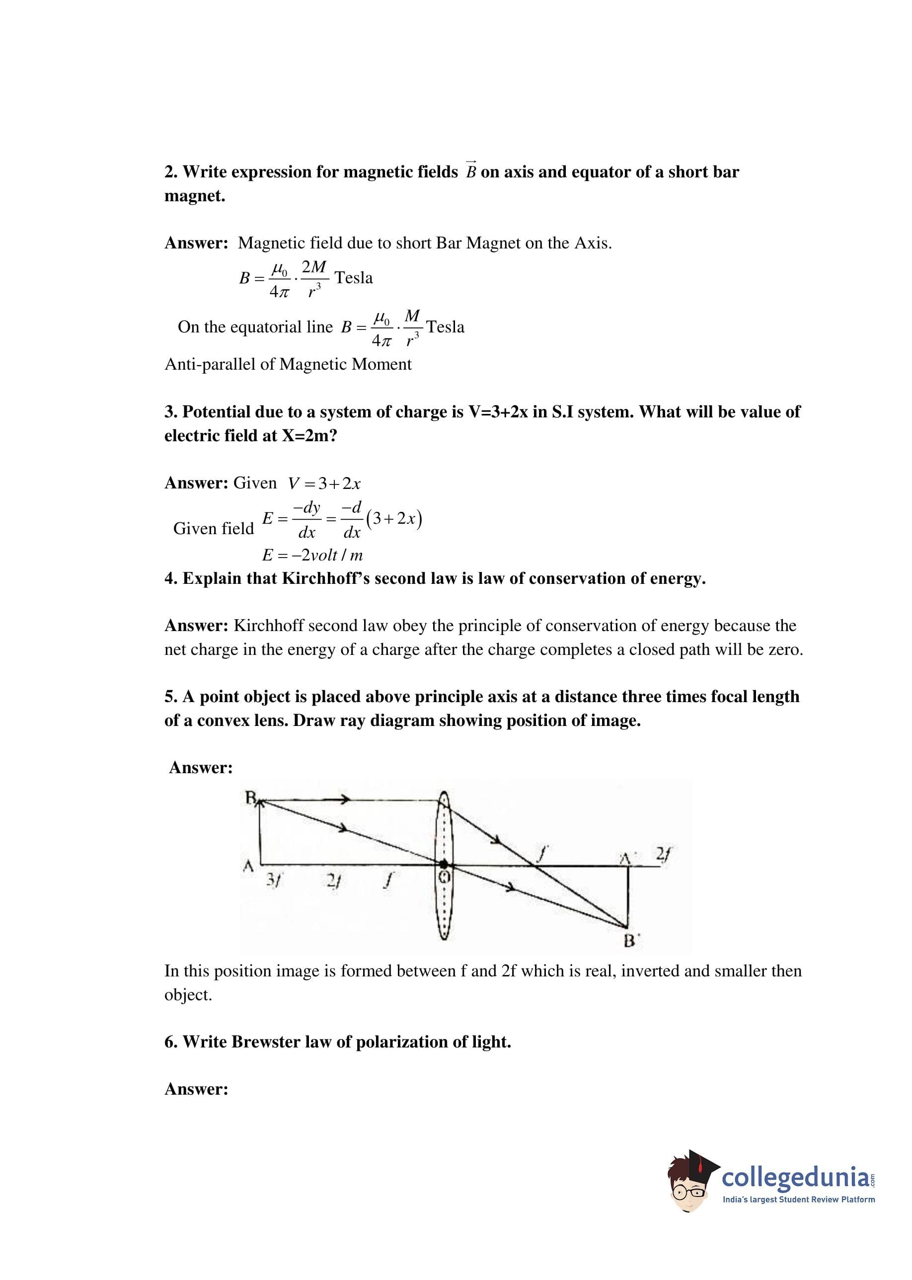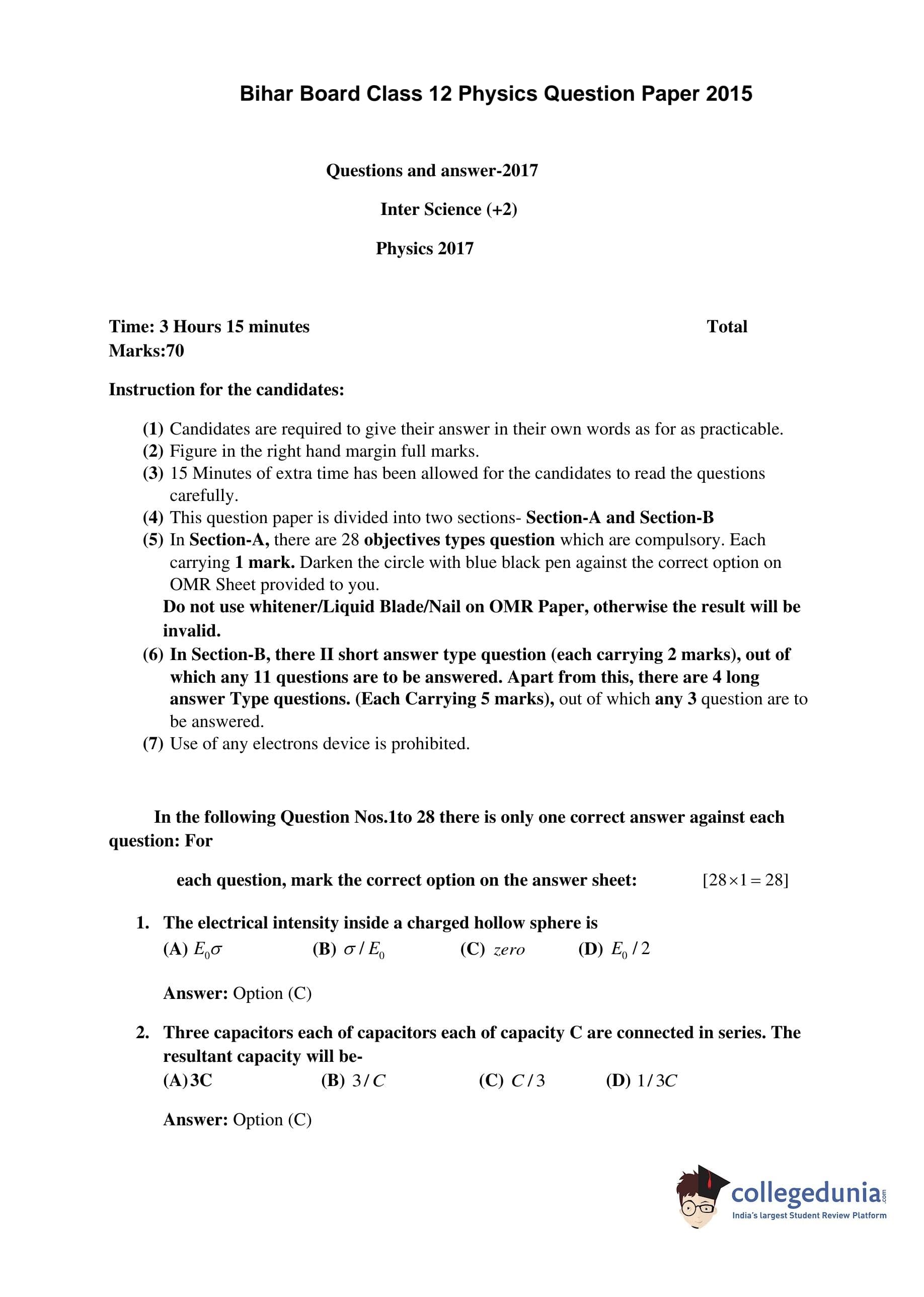 Bihar Board Class 12 Physics Question Paper 2015 with Answer Key is available for download. The exam was conducted by the BSEB .In terms of difficulty level, Bihar Board Class 12 Physics paper was of level. The question paper comprised a total of questions.