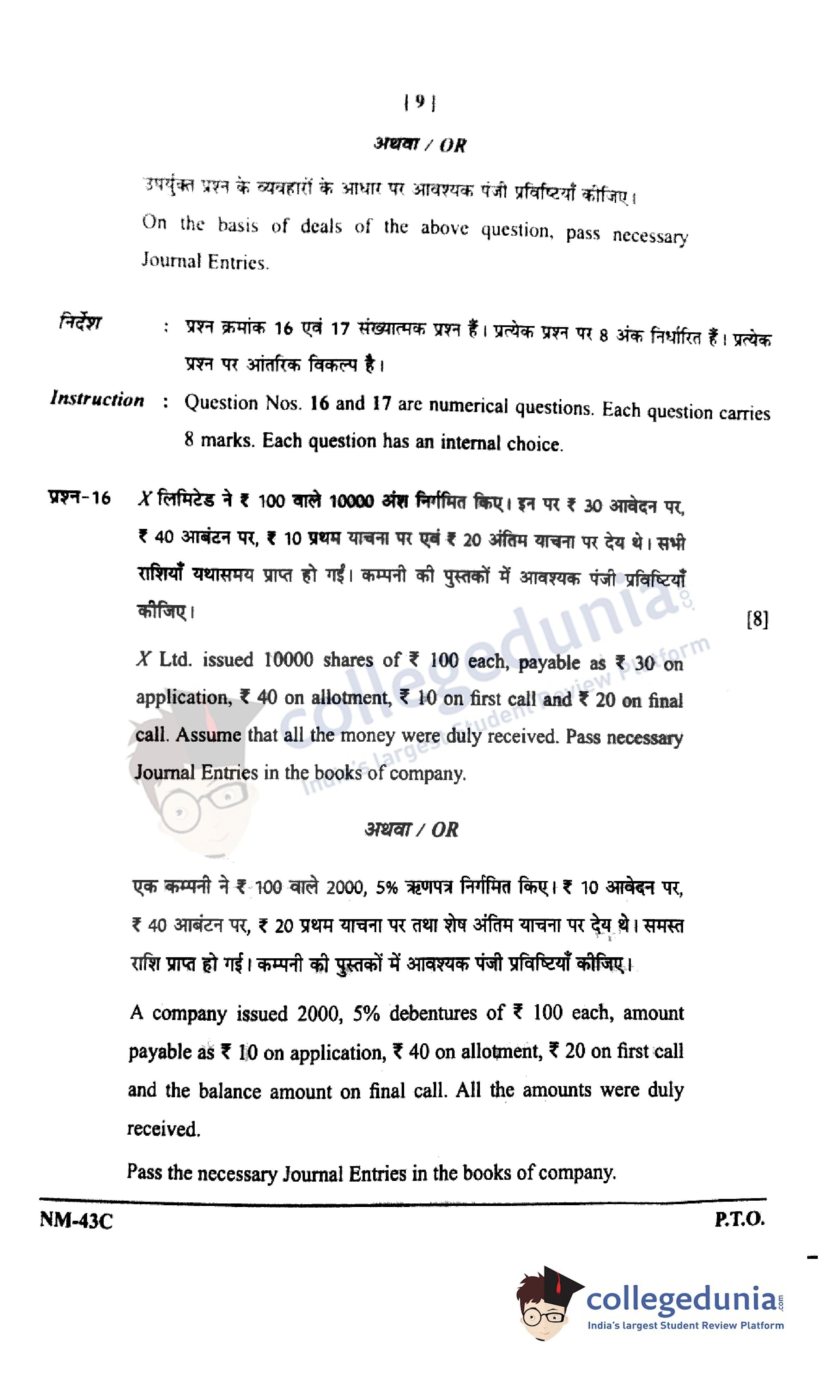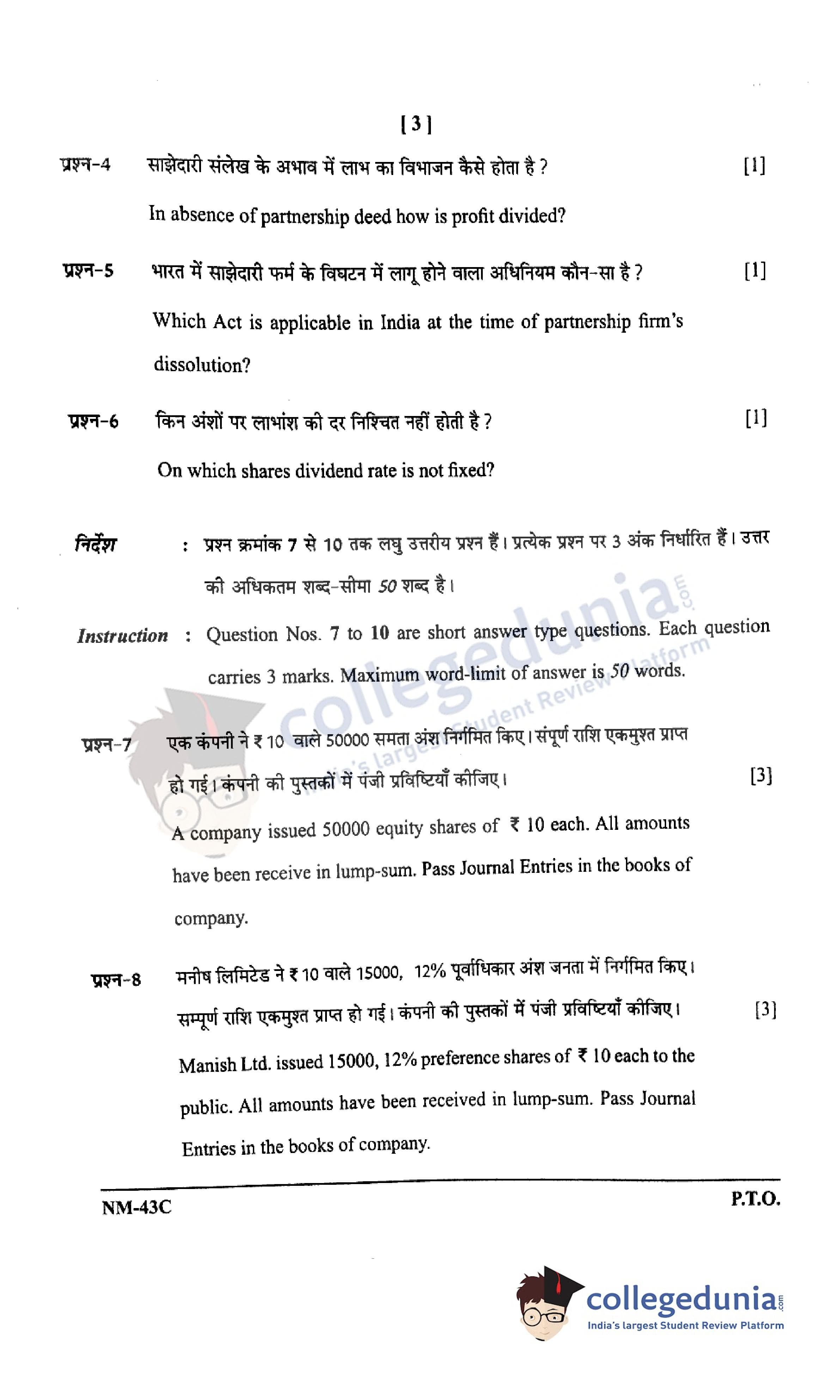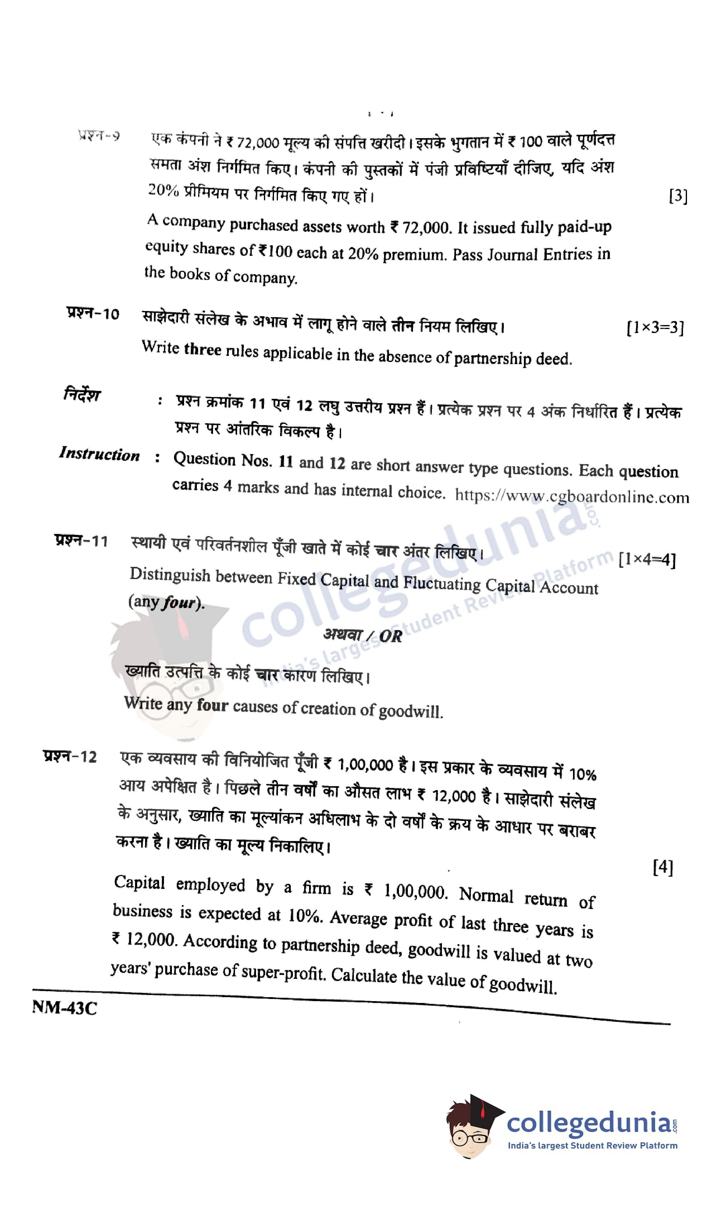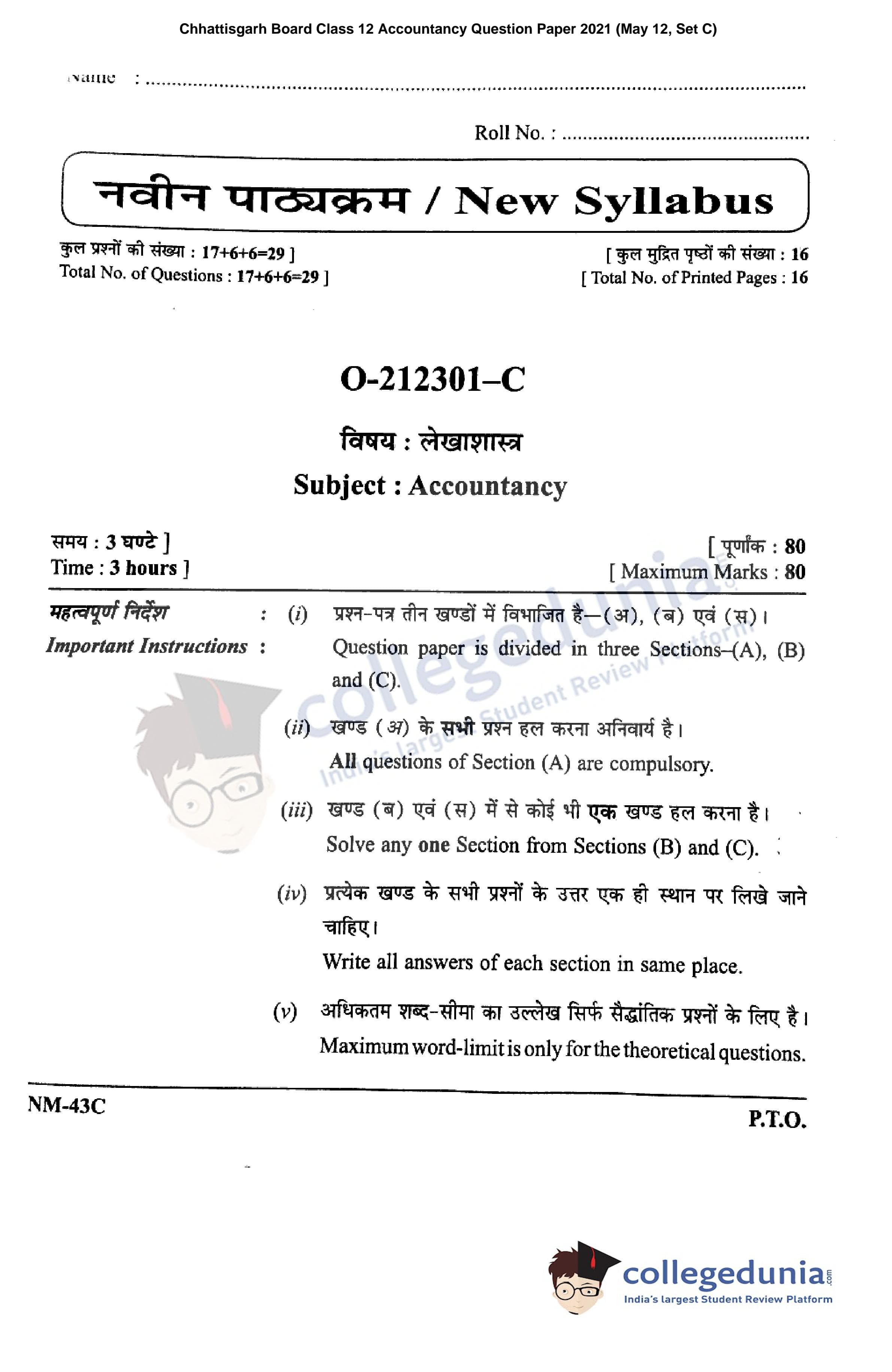 CGBSE Class 12 Accountancy Question Paper 2021 with Answer Key Set C is available for download. The exam was conducted by the CGBSE of Secondary Education (CGBSE) on May 12, 2021 in the Morning Session 9:15 AM to 12:15 PM. The medium of paper was English and Hindi. The question paper comprised a total of 29 questions divided among 3 sections.