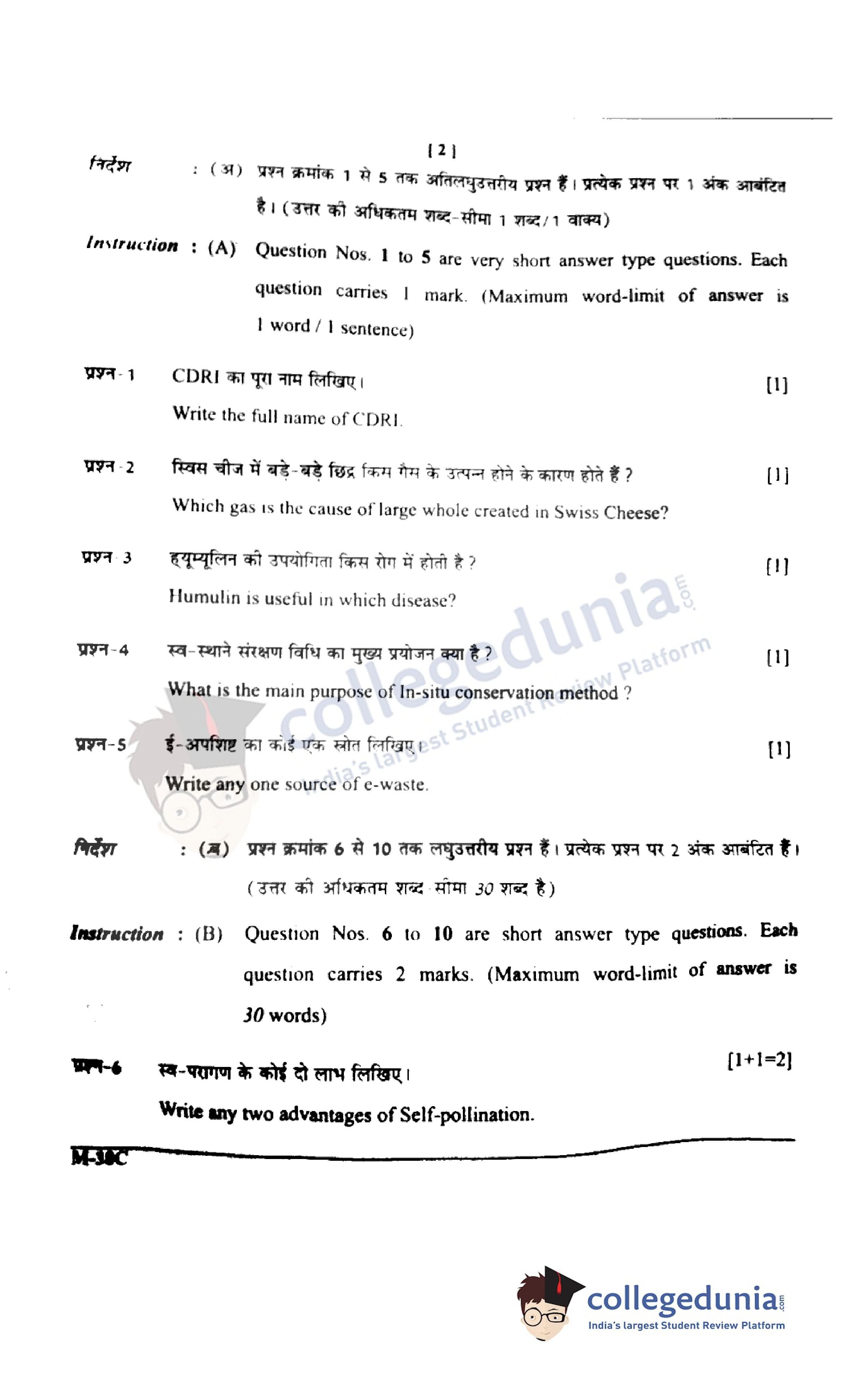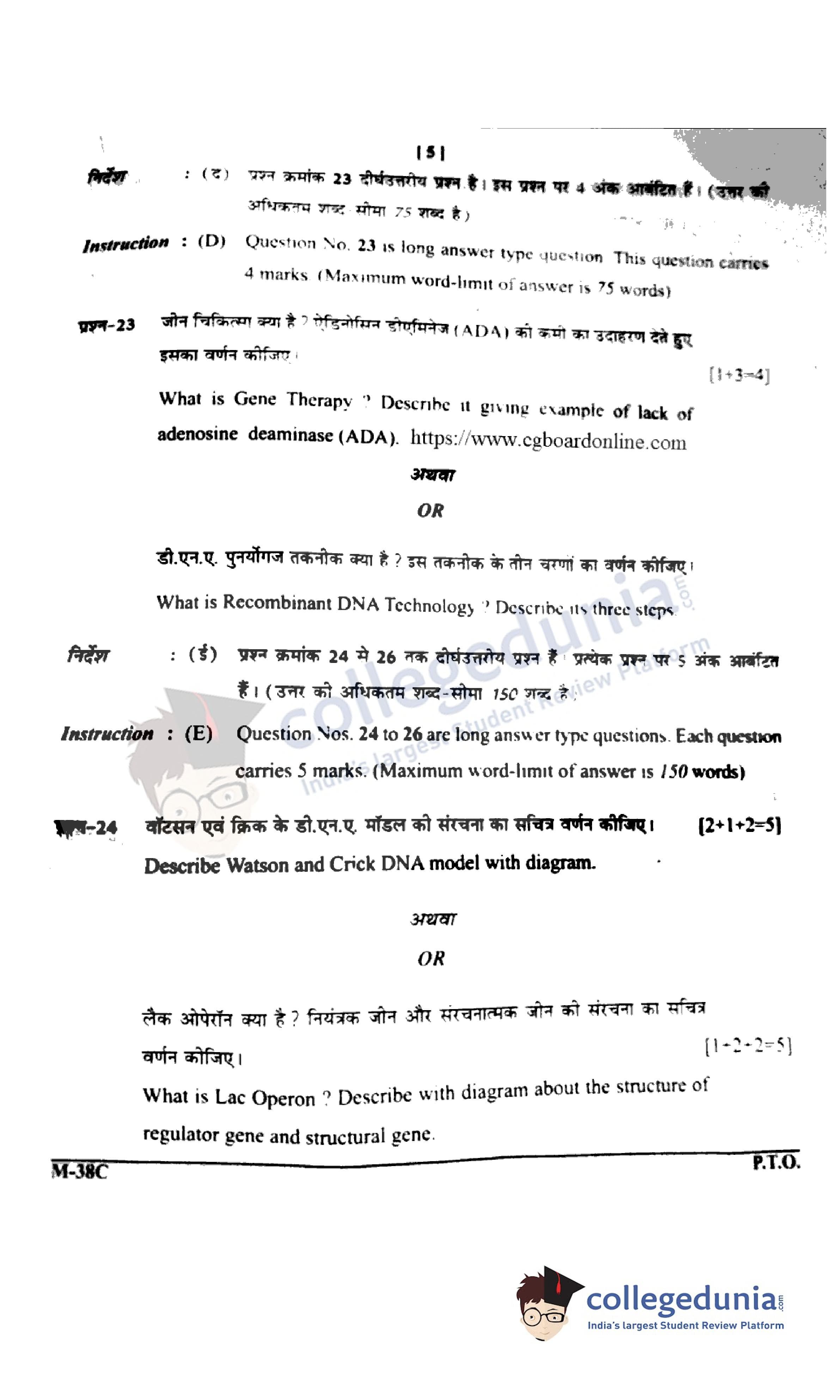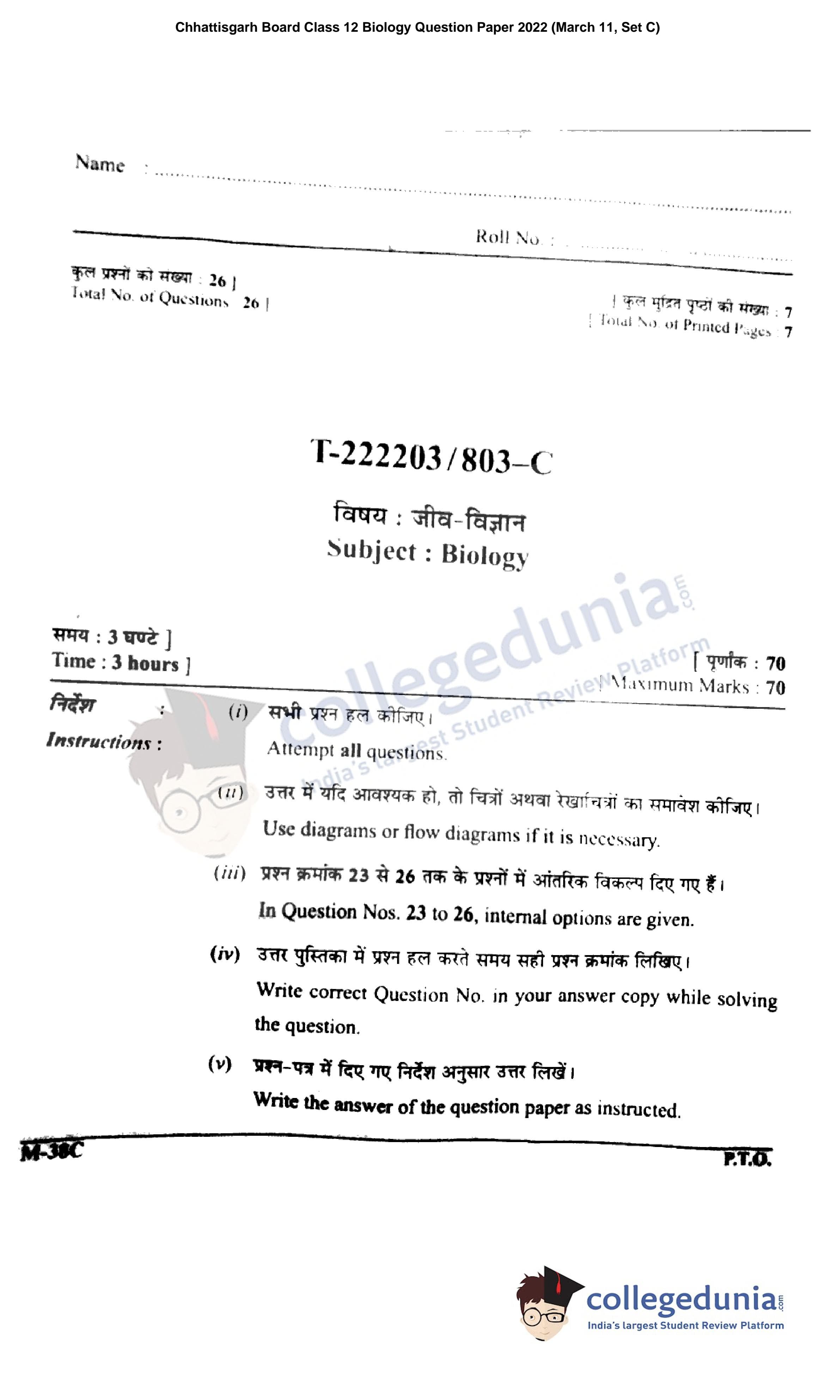 CGBSE Class 12 Biology Question Paper 2022 with Answer Key Set C is available for download. The exam was conducted by the CGBSE of Secondary Education (CGBSE) on March 11, 2022 in the Morning Session 9:15 AM to 12:15 PM. The medium of paper was English and Hindi. The question paper comprised a total of 26 questions.
