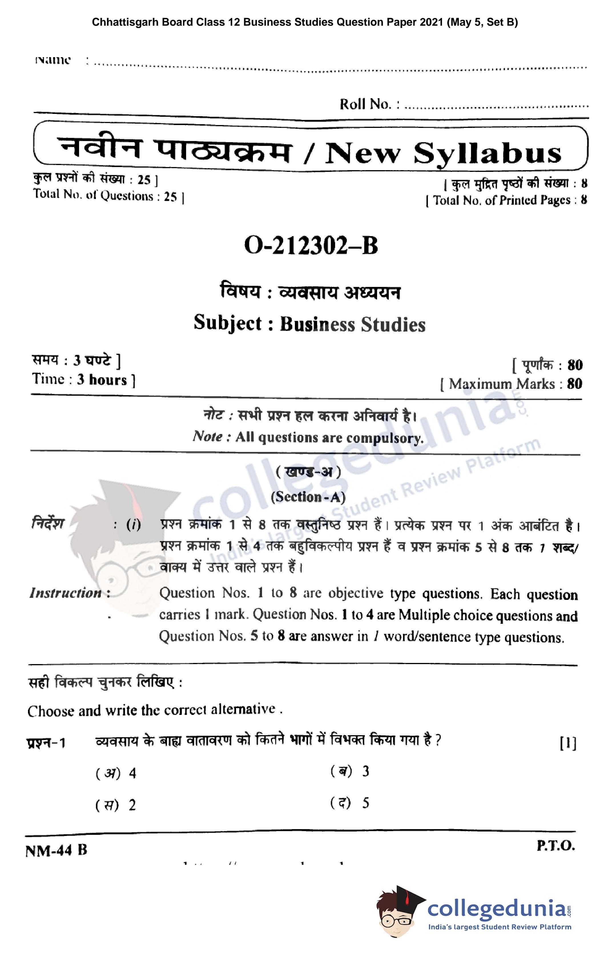 CGBSE Class 12 Business Studies Question Paper 2021 with Answer Key Set B is available for download. The exam was conducted by the Chhattisgarh Board of Secondary Education (CGBSE) on May 5, 2021 in the Morning Session 9:15 AM to 12:15 PM. The medium of paper was English and Hindi. The question paper comprised a total of 25 questions divided among 5 sections.