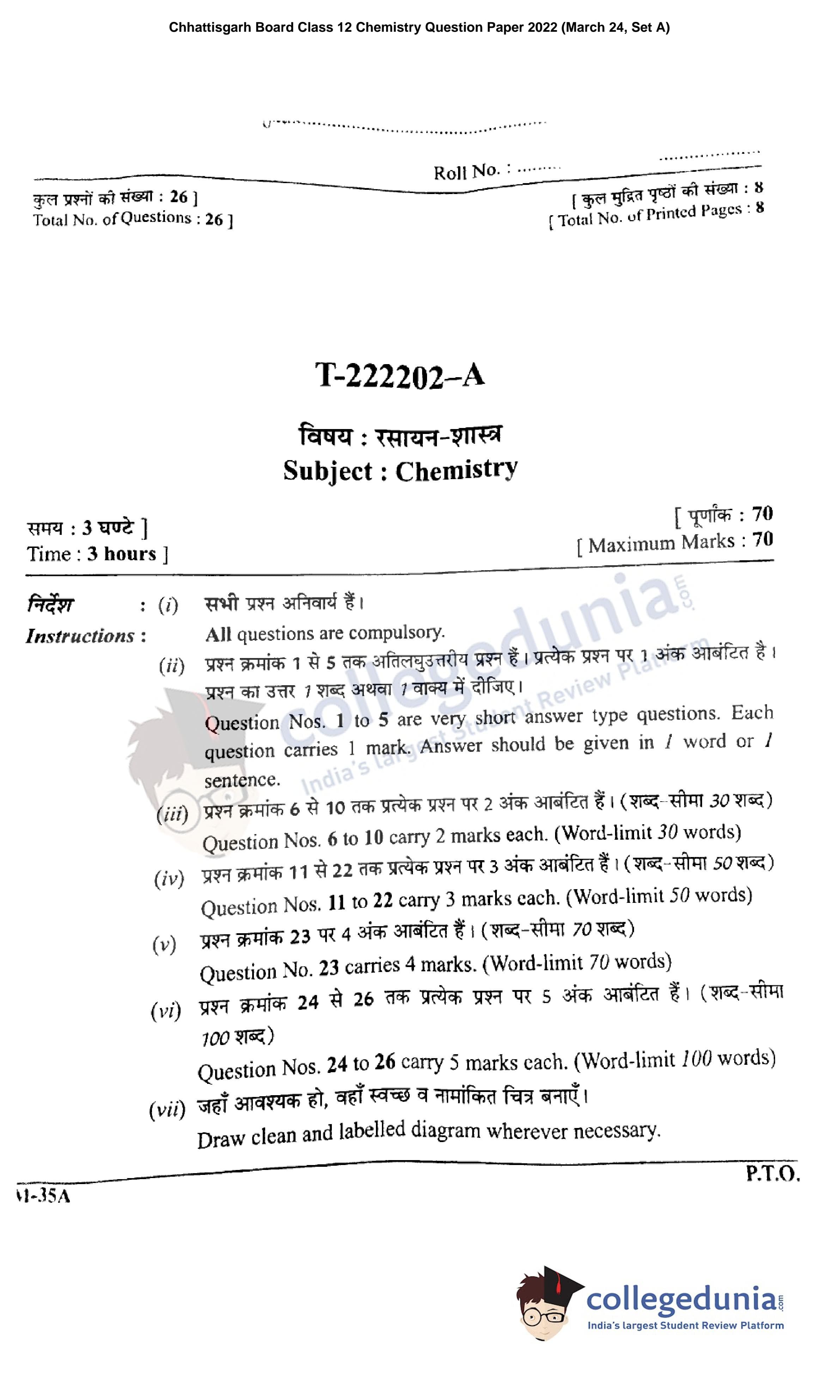 CGBSE Class 12 Chemistry Question Paper 2022 with Answer Key Set A is available for download. The exam was conducted by the CGBSE of Secondary Education (CGBSE) on March 24, 2022 in the Morning Session 9:15 AM to 12:15 PM. The medium of paper was English and Hindi. The question paper comprised a total of 26 questions.