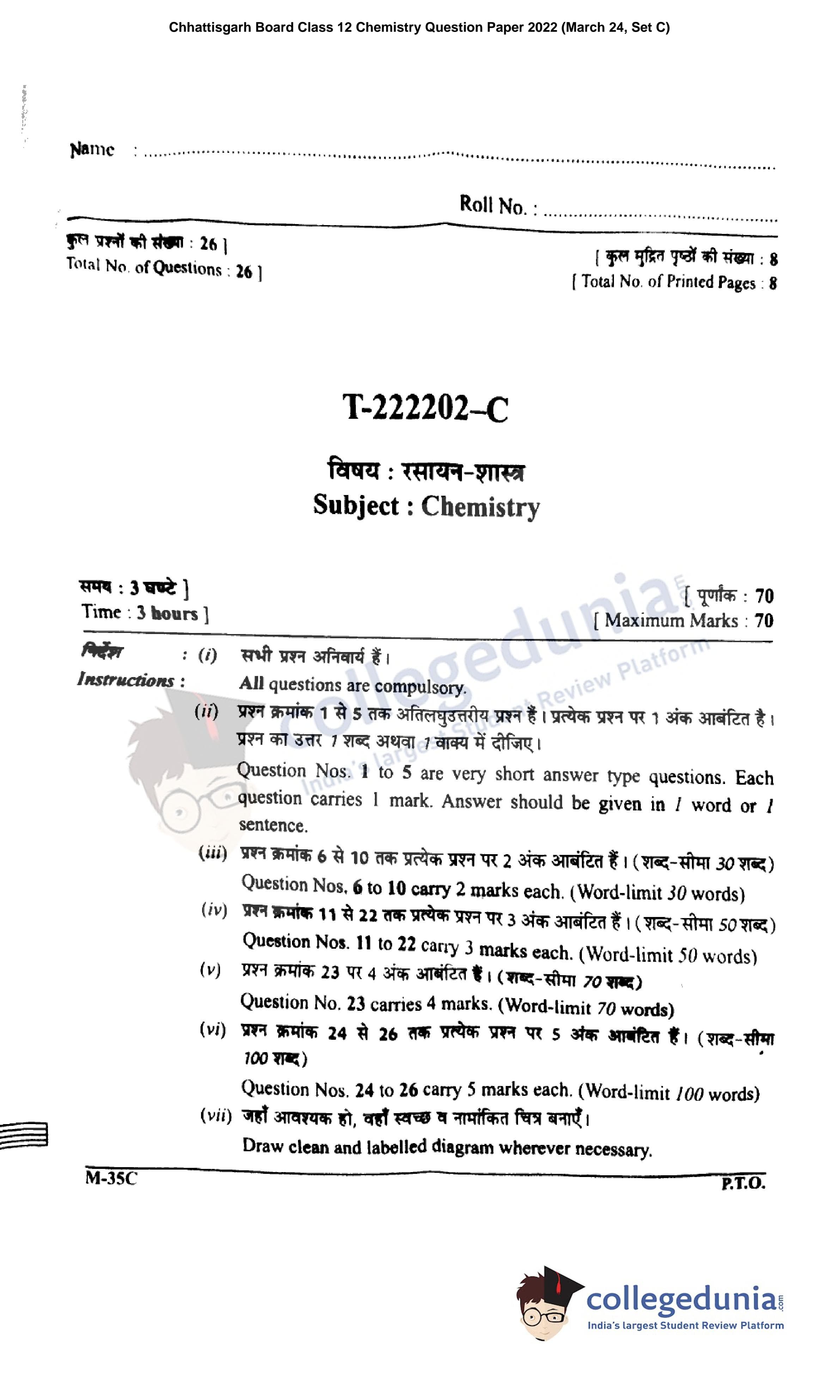 CGBSE Class 12 Chemistry Question Paper 2022 with Answer Key Set C is available for download. The exam was conducted by the CGBSE of Secondary Education (CGBSE) on March 24, 2022 in the Morning Session 9:15 AM to 12:15 PM. The medium of paper was English and Hindi. The question paper comprised a total of 26 questions.