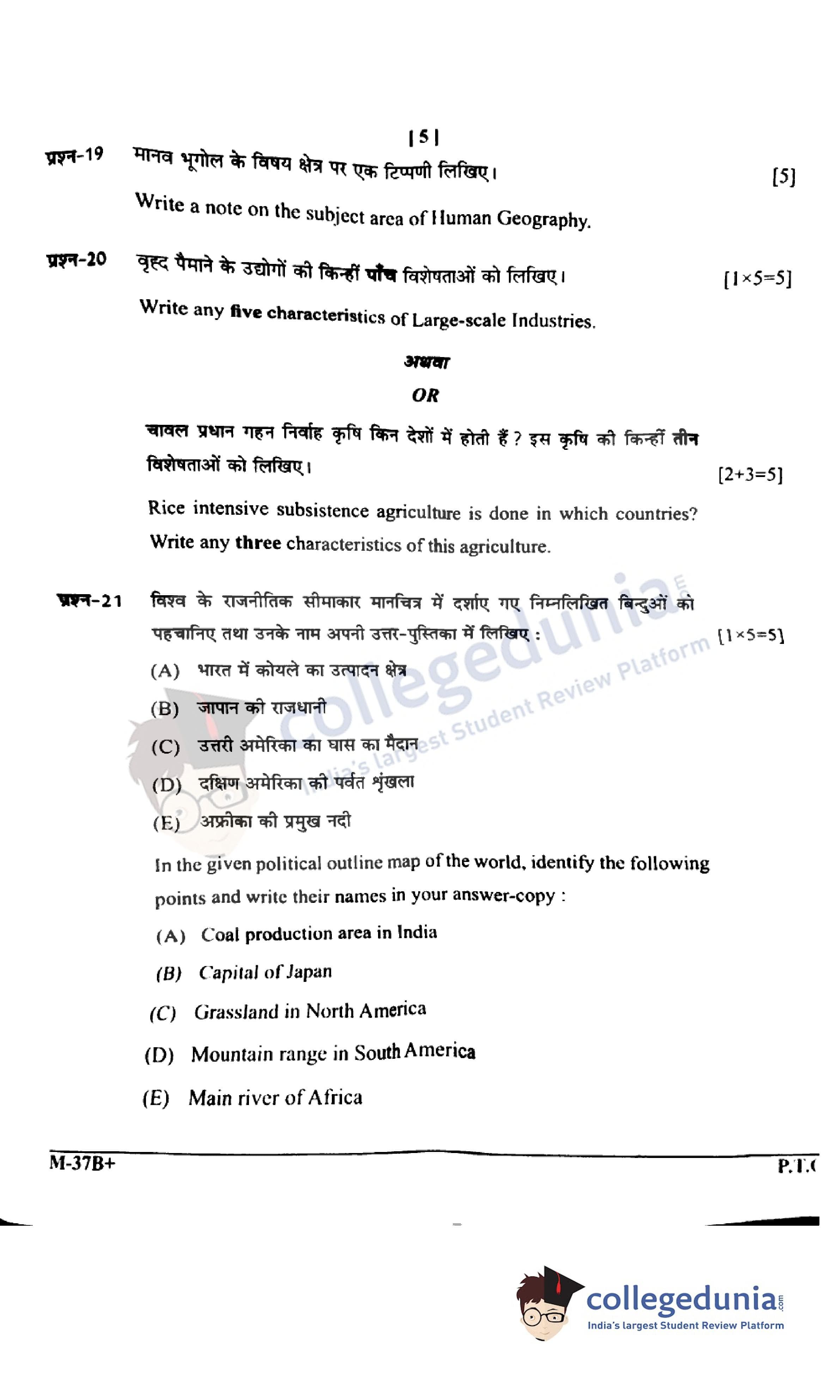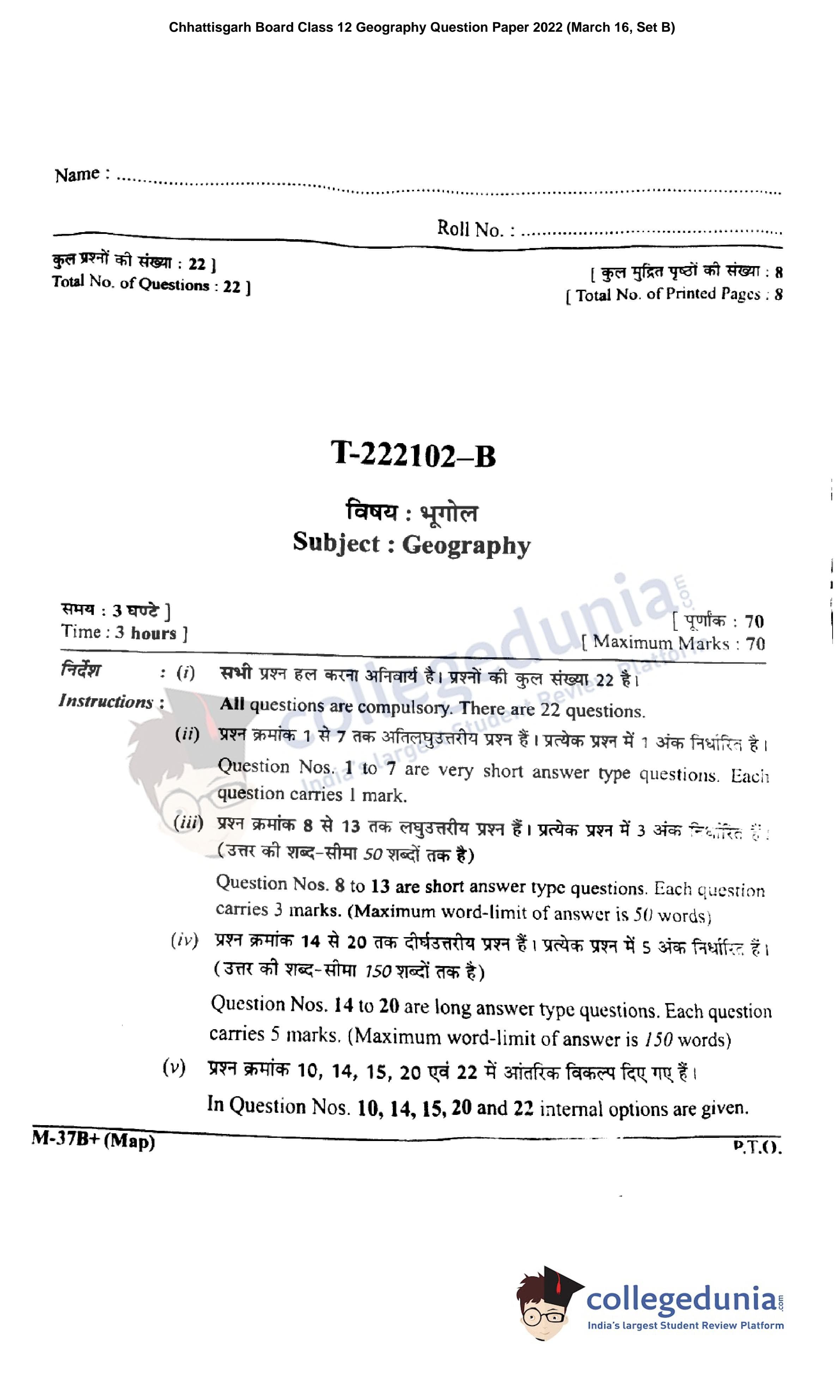 CGBSE Class 12 Geography Question Paper 2022 with Answer Key Set B is available for download. The exam was conducted by the CGBSE of Secondary Education (CGBSE) on March 16, 2022 in the Morning Session 9:15 AM to 12:15 PM. The medium of paper was English and Hindi. The question paper comprised a total of 22 questions.