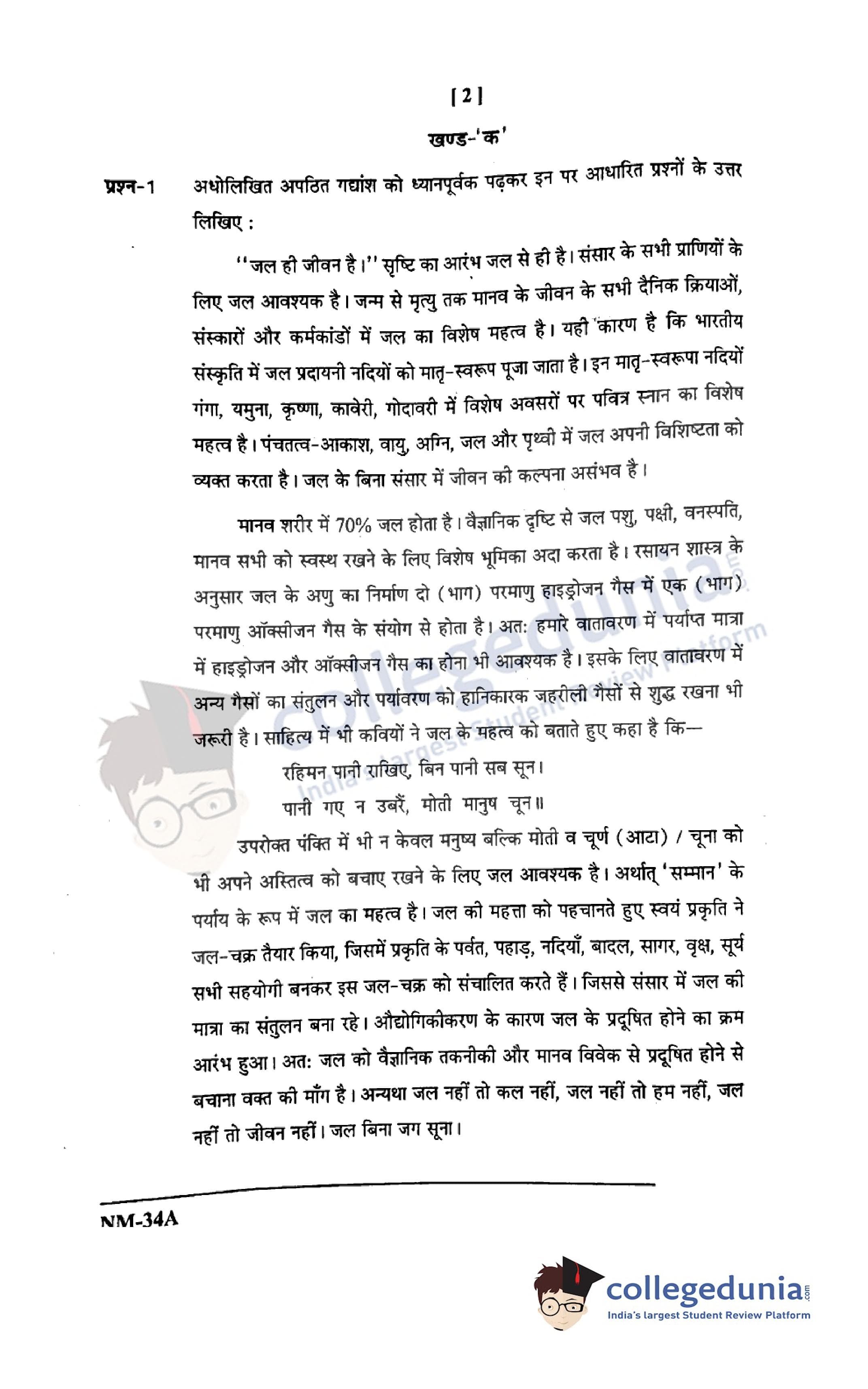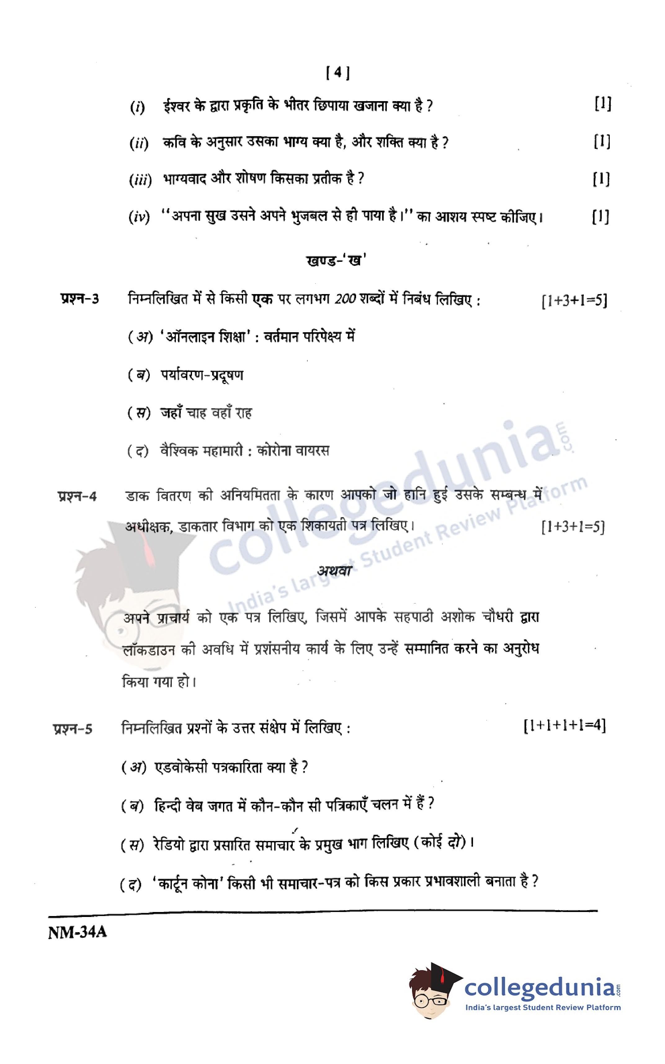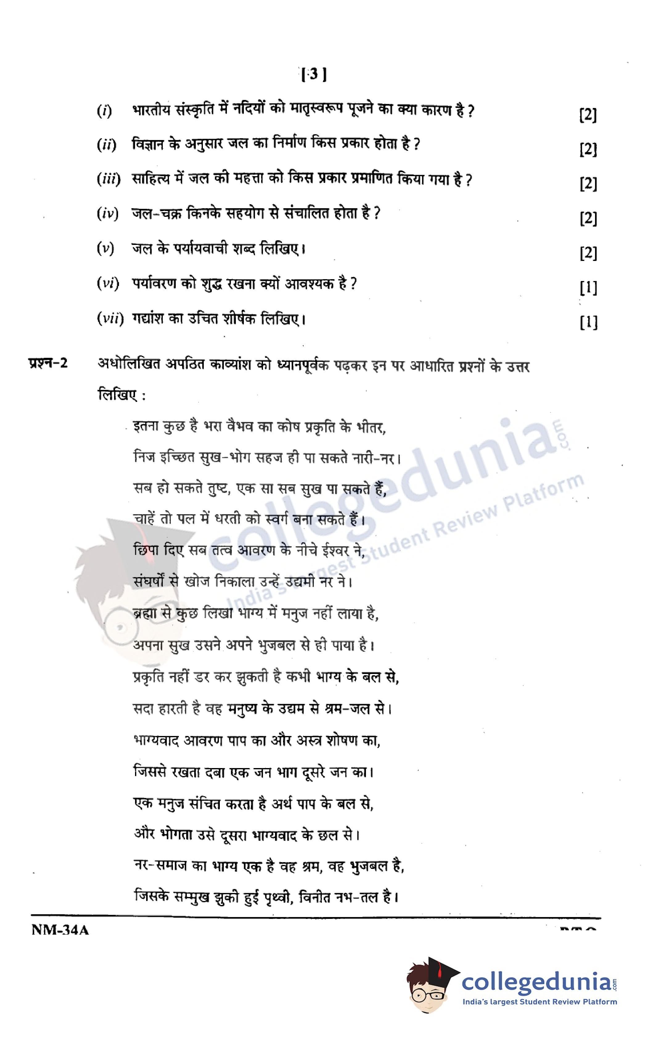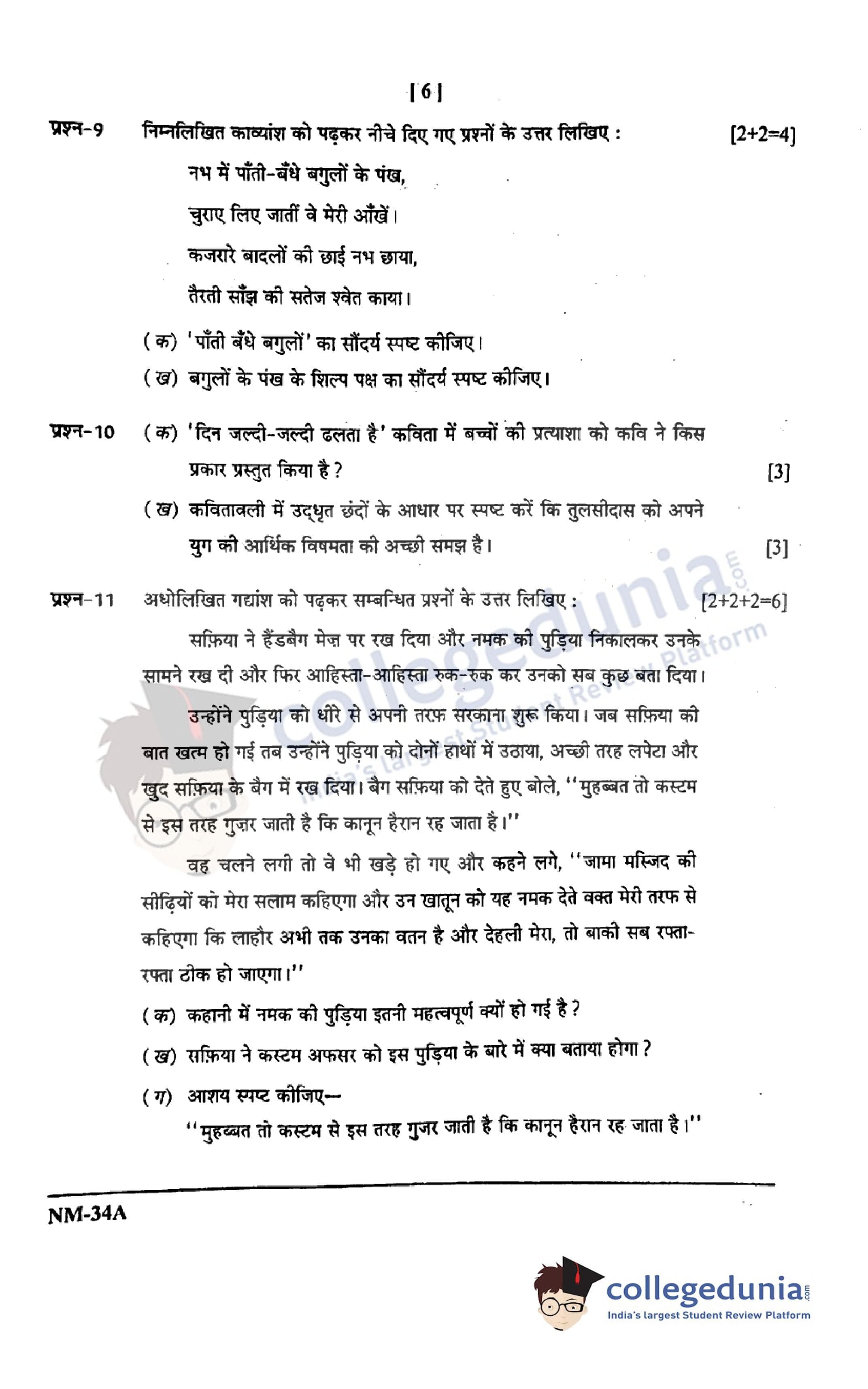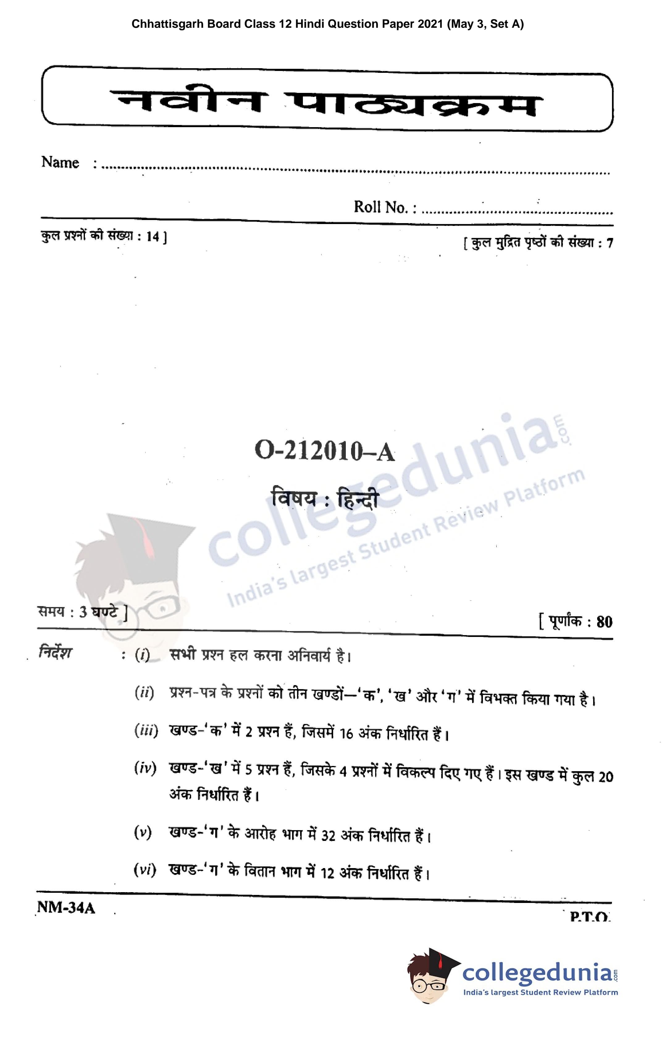 CGBSE Class 12 Hindi Set A Question Paper 2021 with Answer Key (May 3)