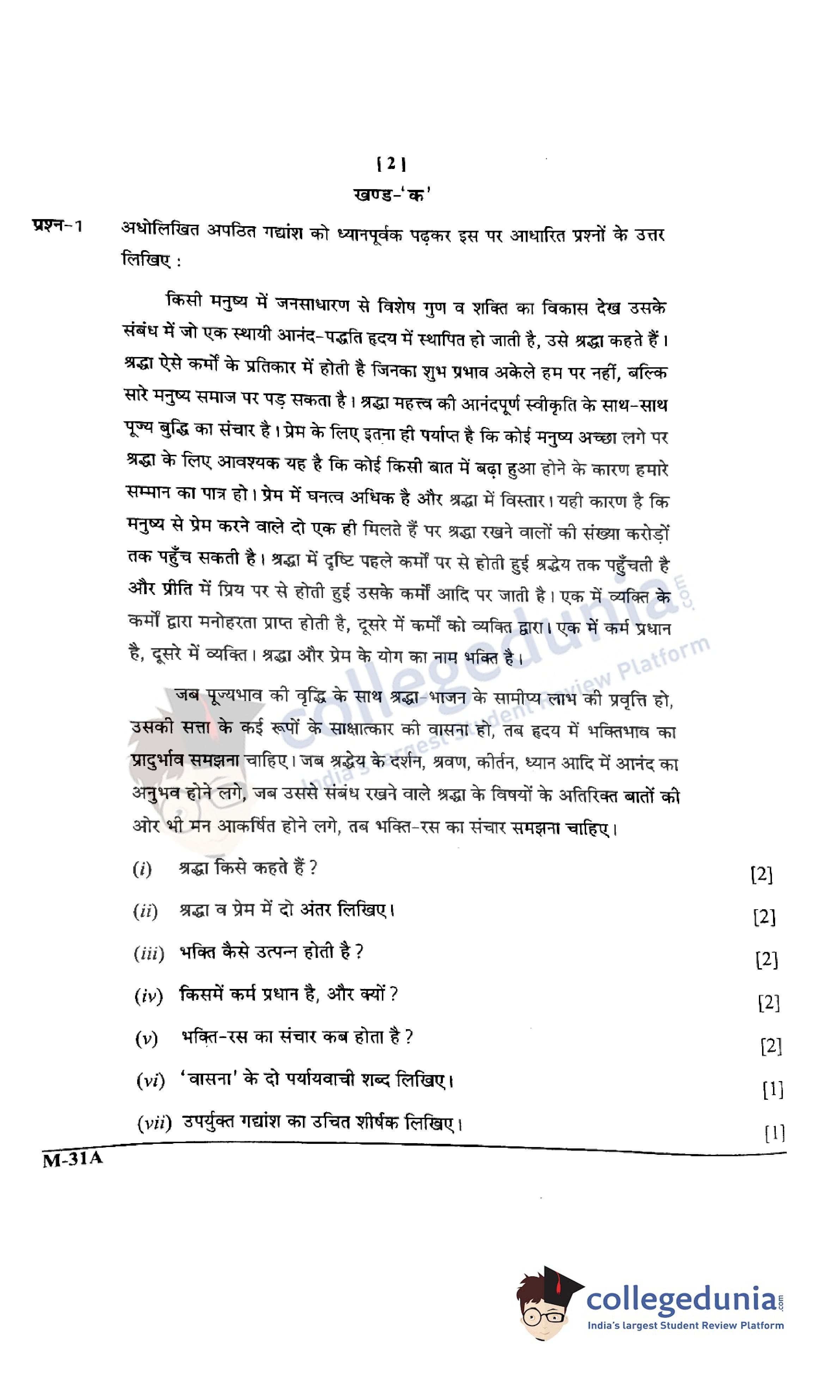 CGBSE Class 12 Hindi Set A Question Paper 2022 with Answer Key (March 2)