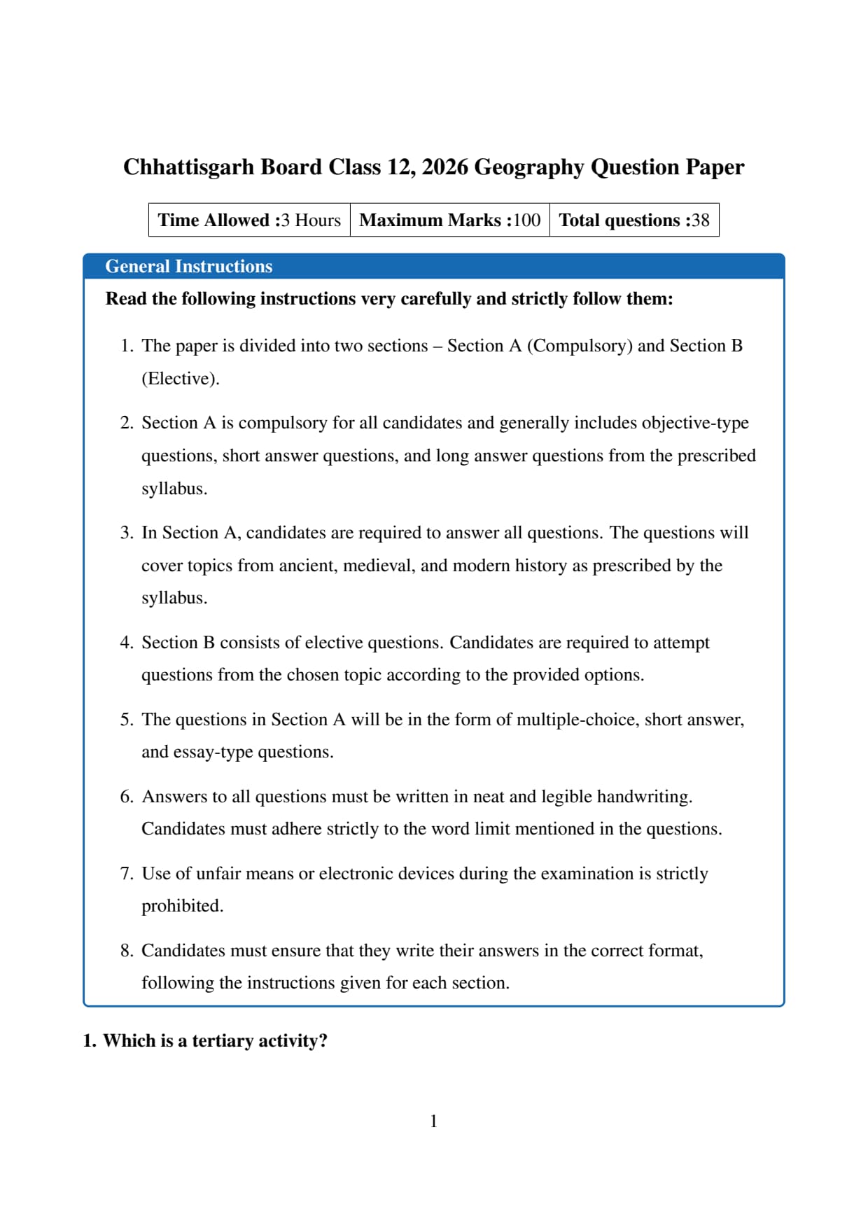 The official question paper of Chhattisgarh Board Class 12 Geography Board Exam 2026 is provided below. Students can download the official paper in PDF format for reference.