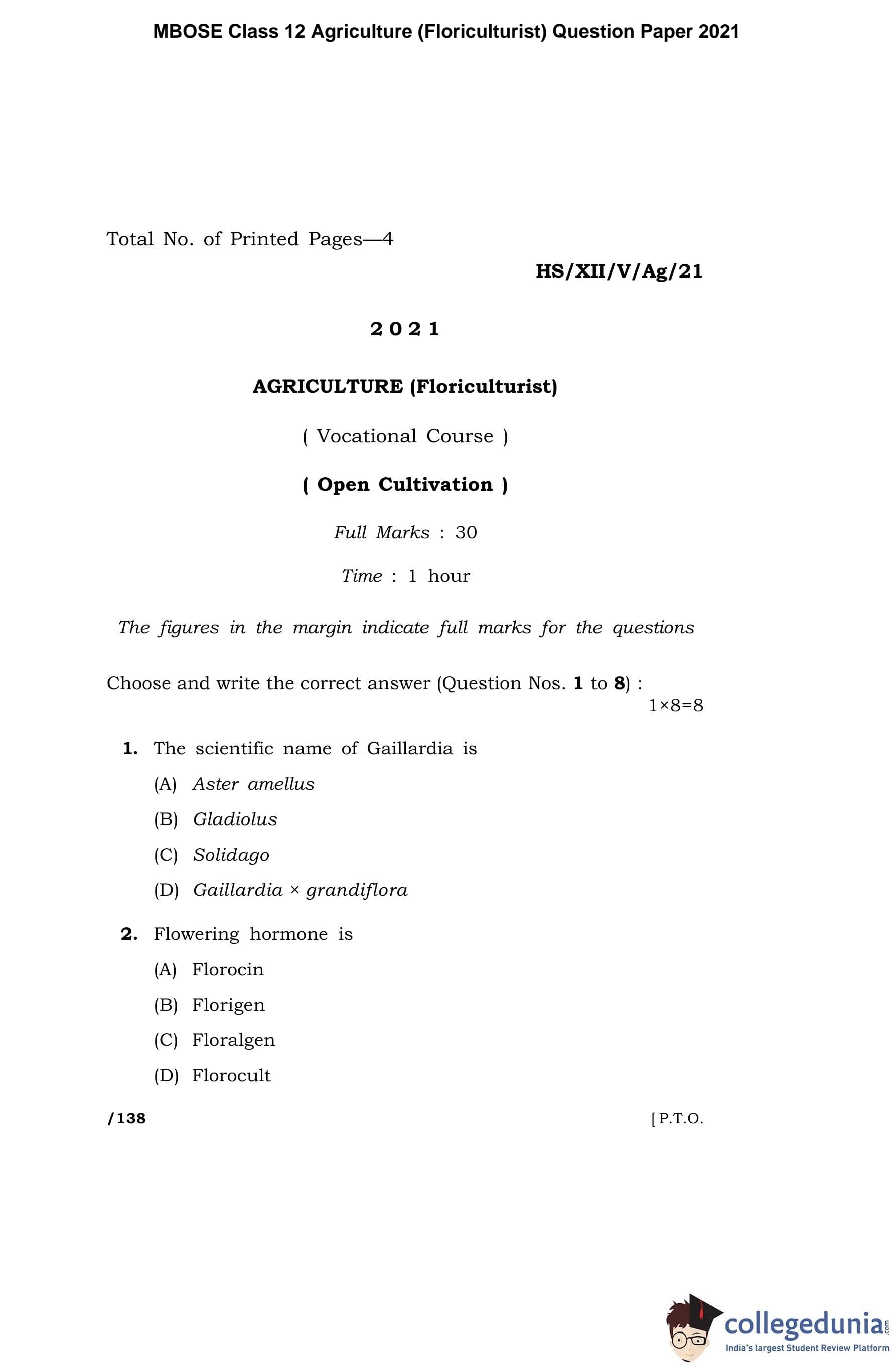 | MBOSE Class 12 Agriculture (Floriculturist) Question Paper 2021 PDF | MBOSE Class 12 Agriculture (Floriculturist) Answer Key 2021 PDF |