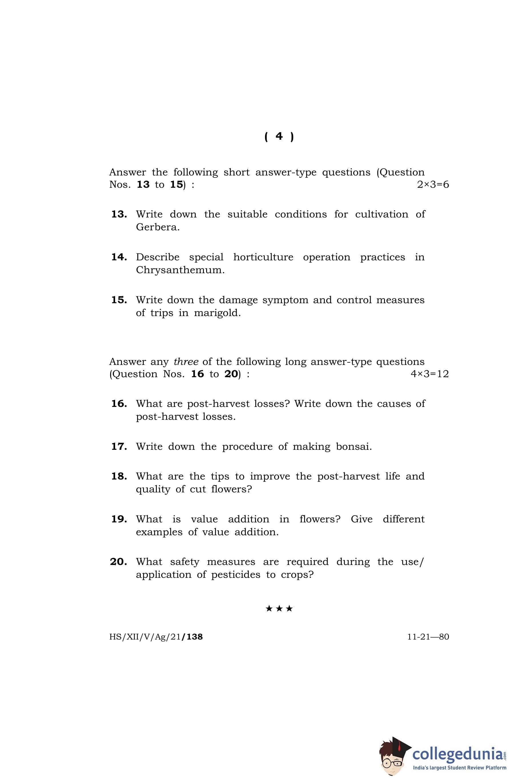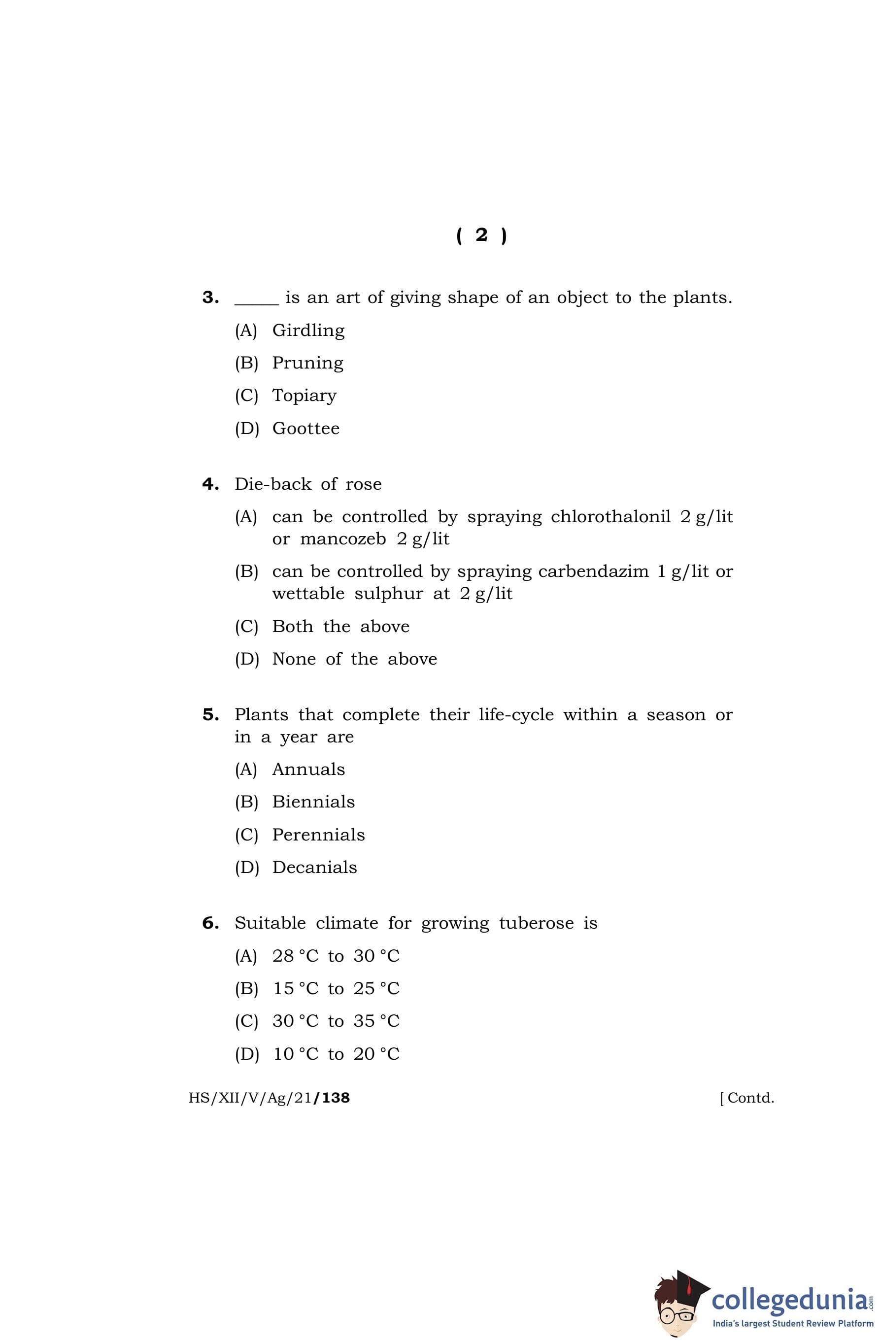 MBOSE Class 12 Agriculture (Floriculturist) Question Paper 2021 with Answer Key pdf is available for download here. The exam was conducted by Meghalaya Board of School Education on May 10, 2021 in the Morning Session 10 AM to 11 AM. The question paper comprised a total of 20 questions.
