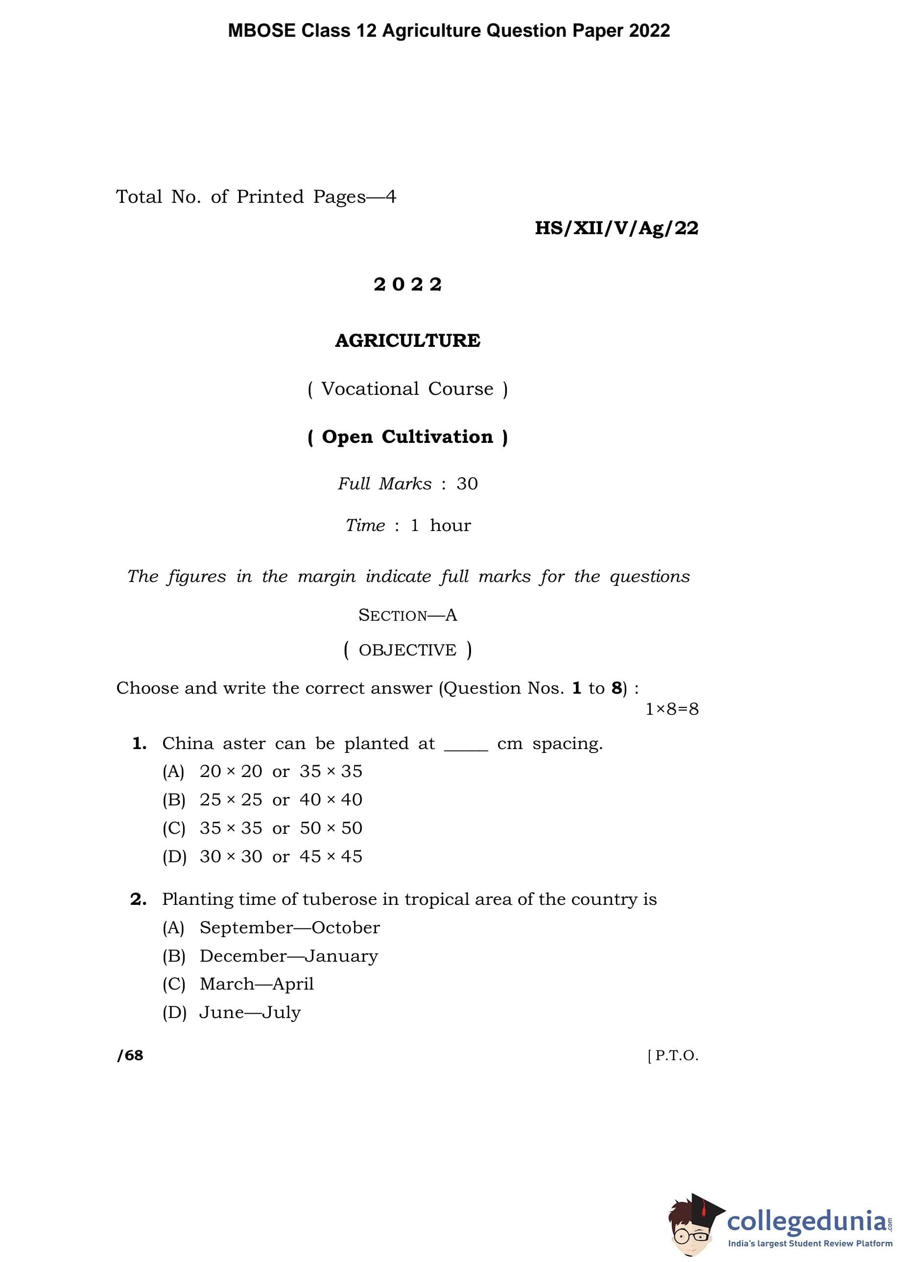 | MBOSE Class 12 Agriculture Question Paper 2022 PDF | MBOSE Class 12 Agriculture Answer Key 2022 PDF |