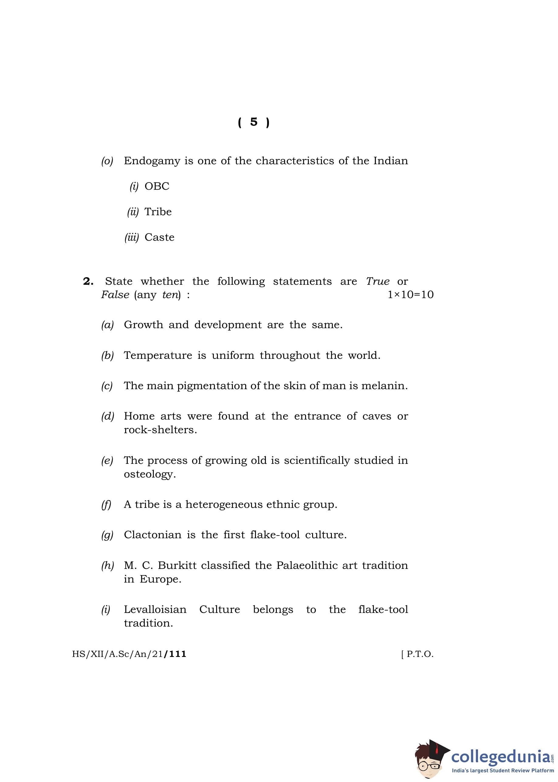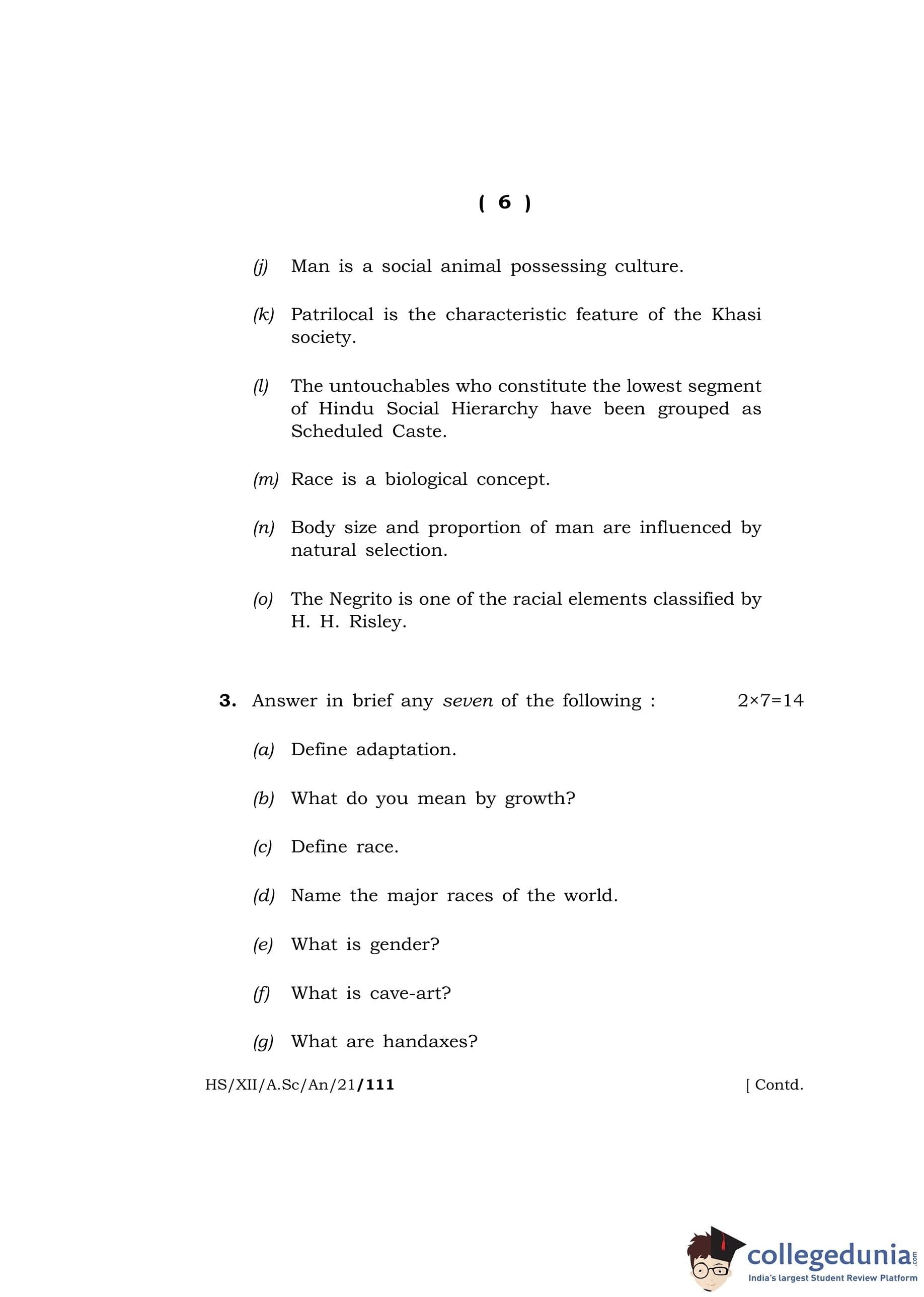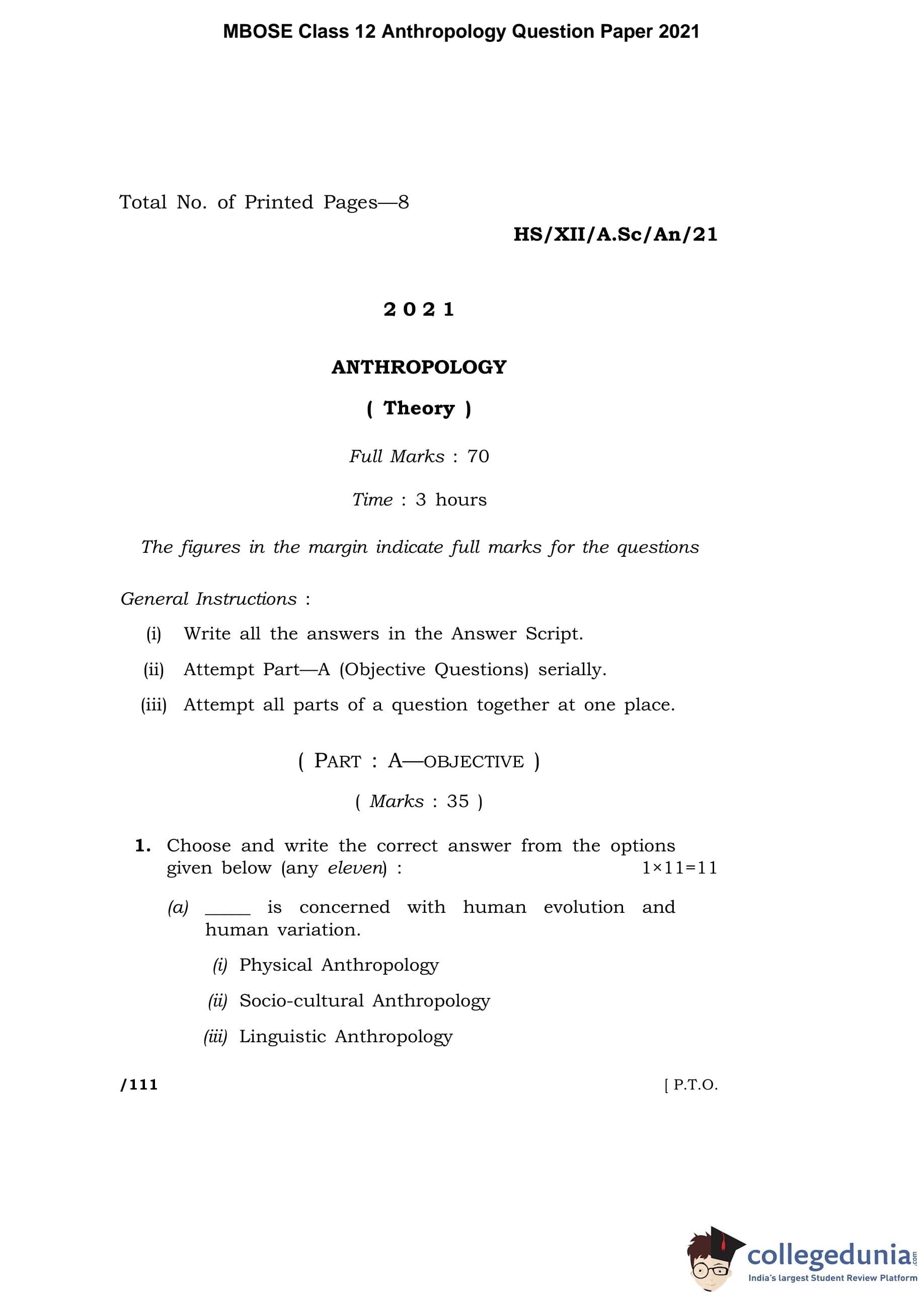MBOSE Class 12 Anthropology Question Paper 2021 with Answer Key