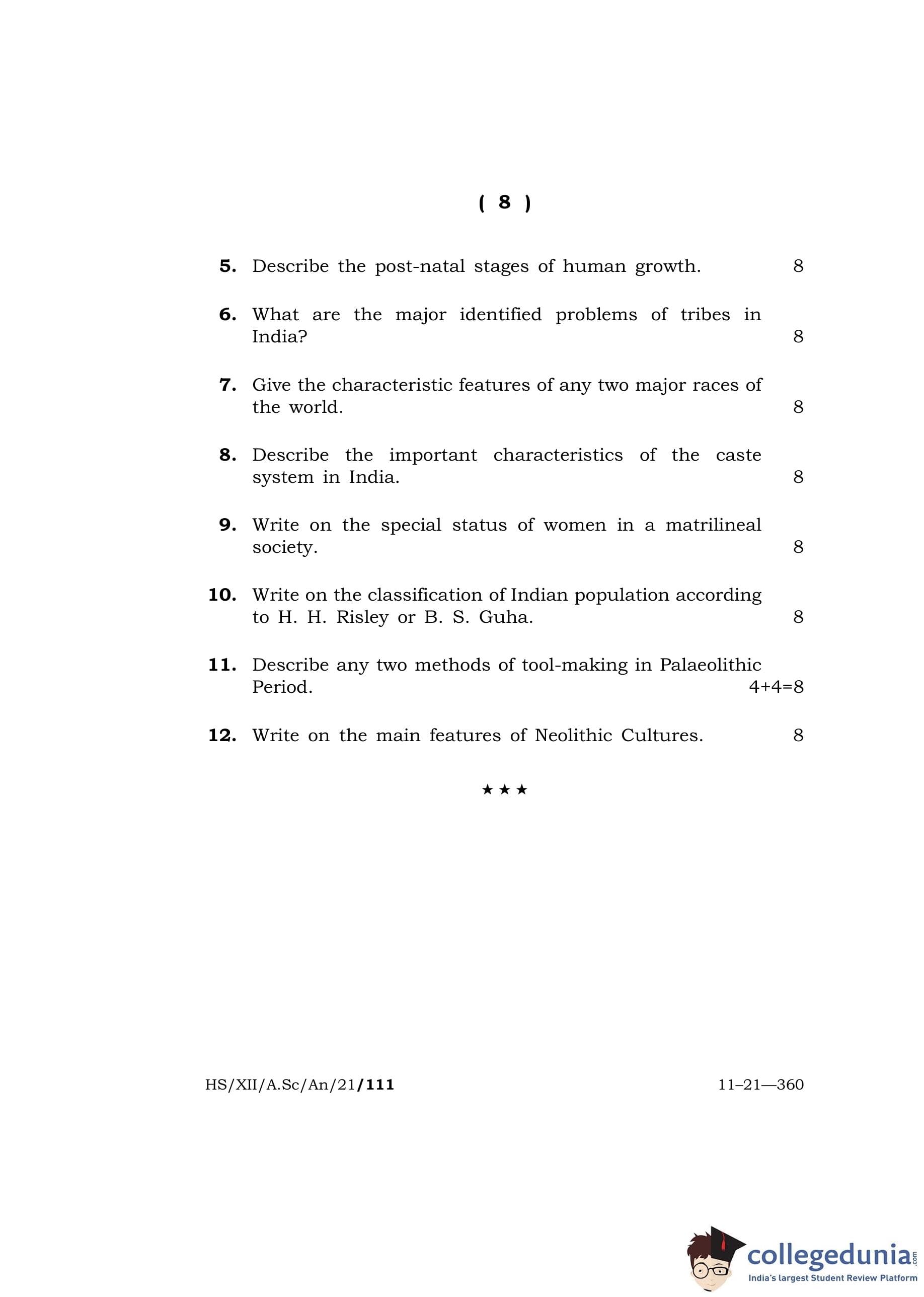 MBOSE Class 12 Anthropology Question Paper 2021 with Answer Key pdf is available for download here. The exam was conducted by Meghalaya Board of School Education on May 3, 2021 in the Morning Session 10 AM to 1 PM. The question paper comprised a total of 12 questions divided among 2 sections.