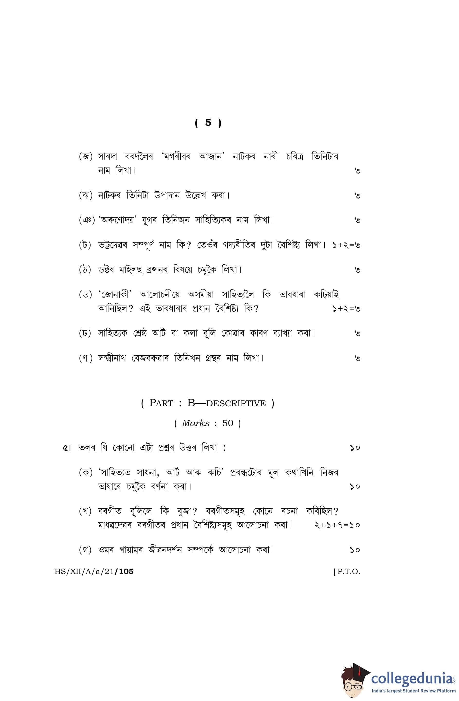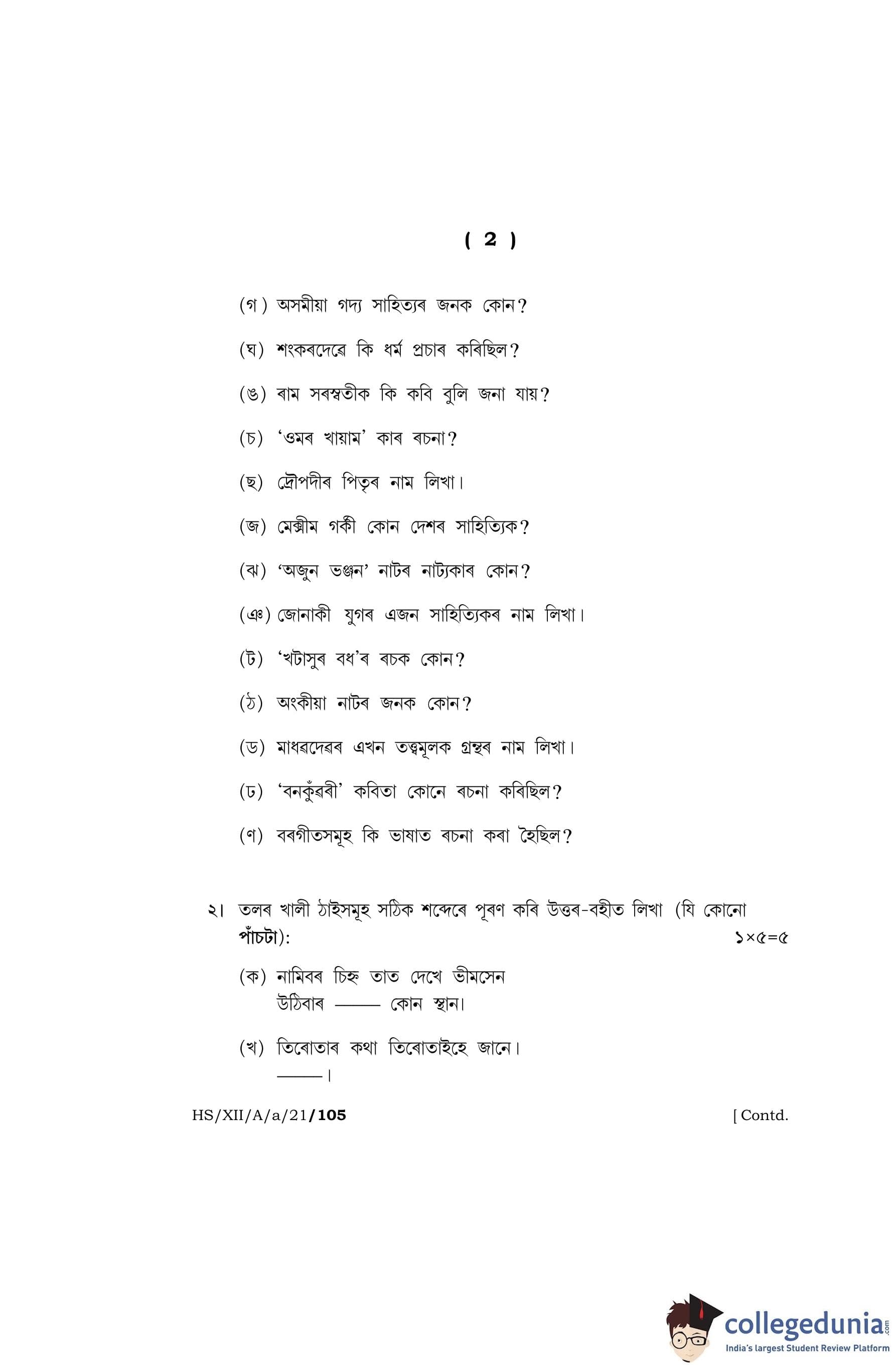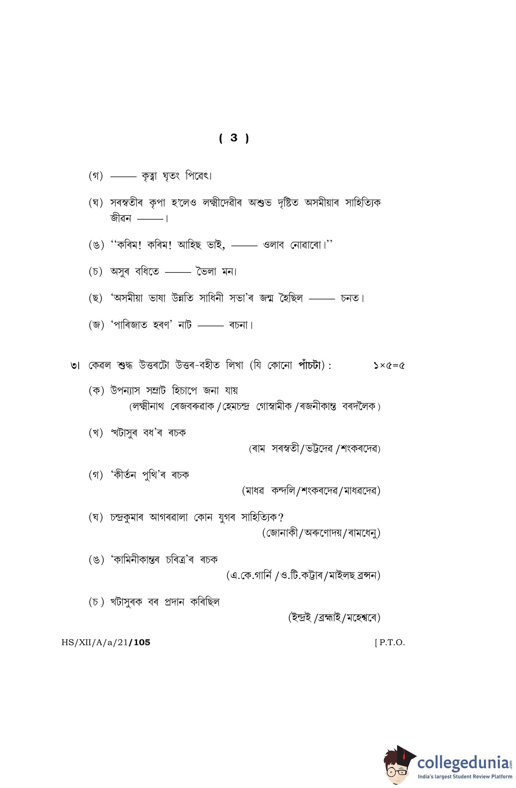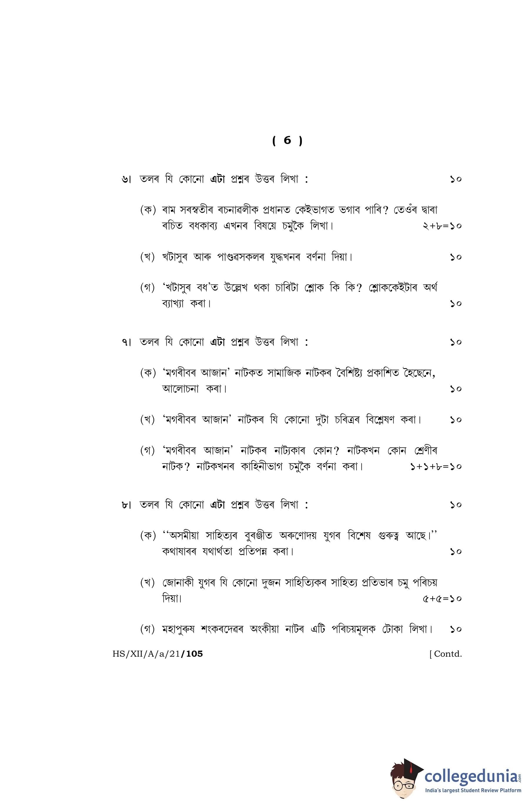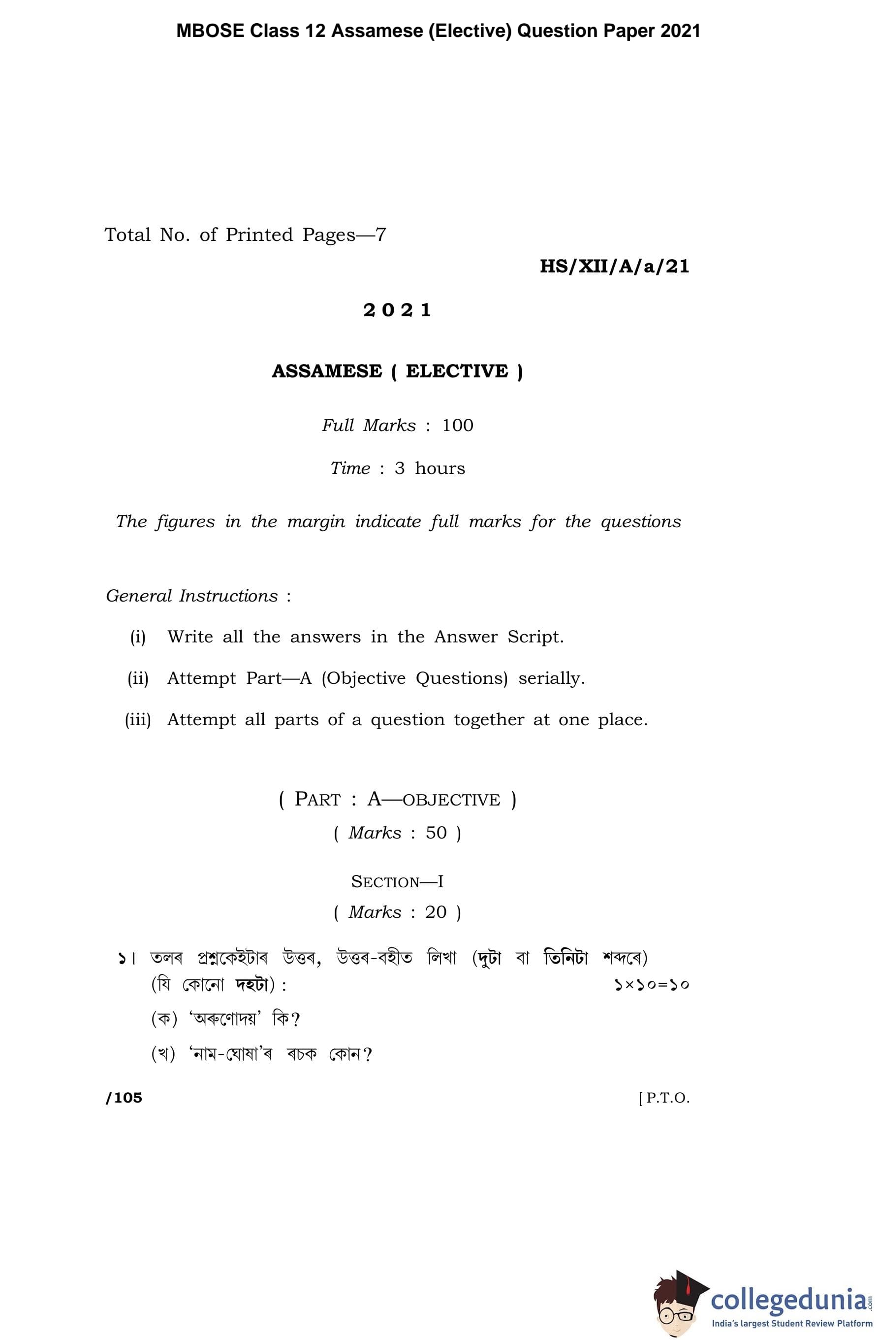 MBOSE Class 12 Assamese (Elective) Question Paper 2021 with Answer Key