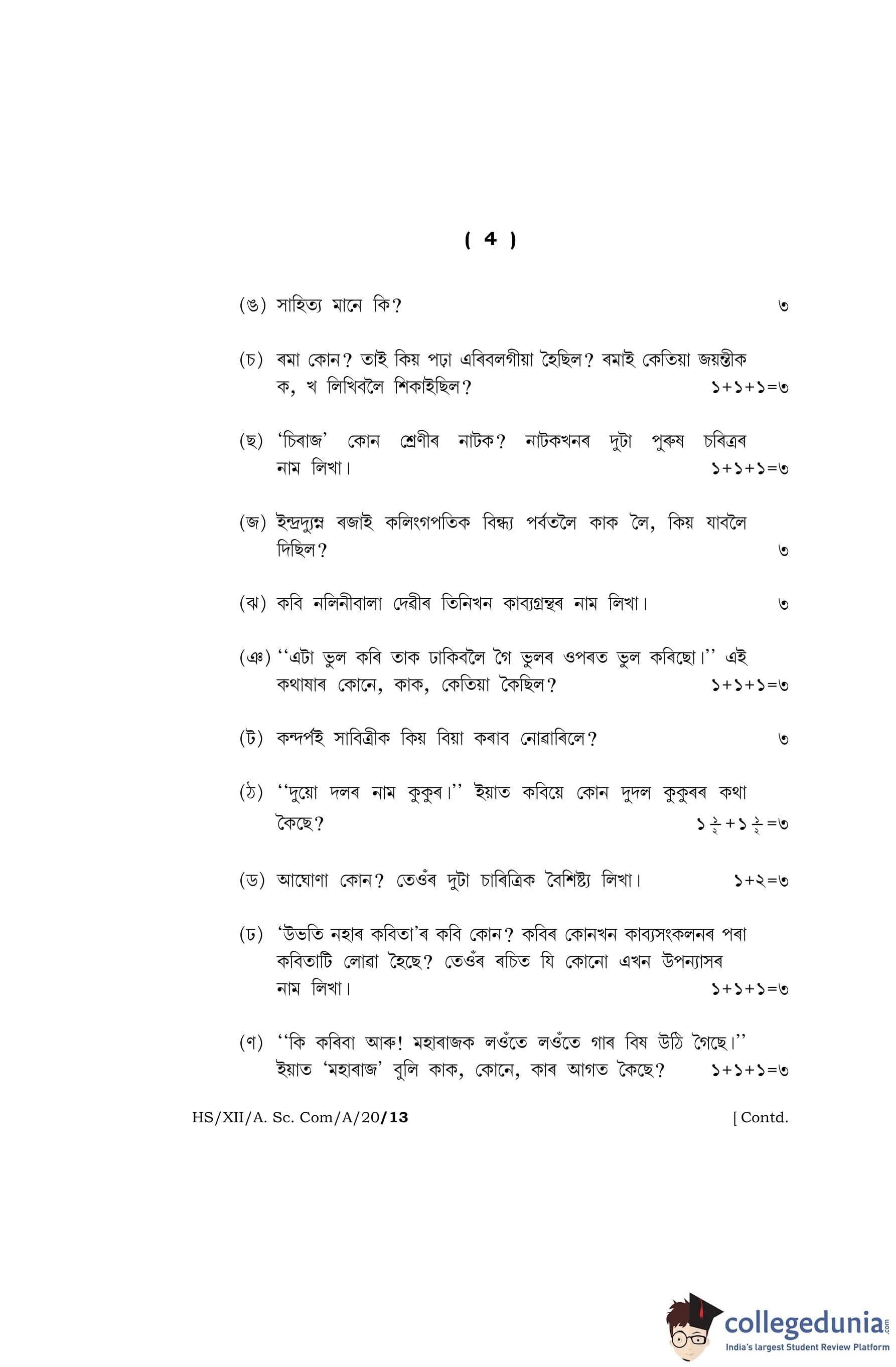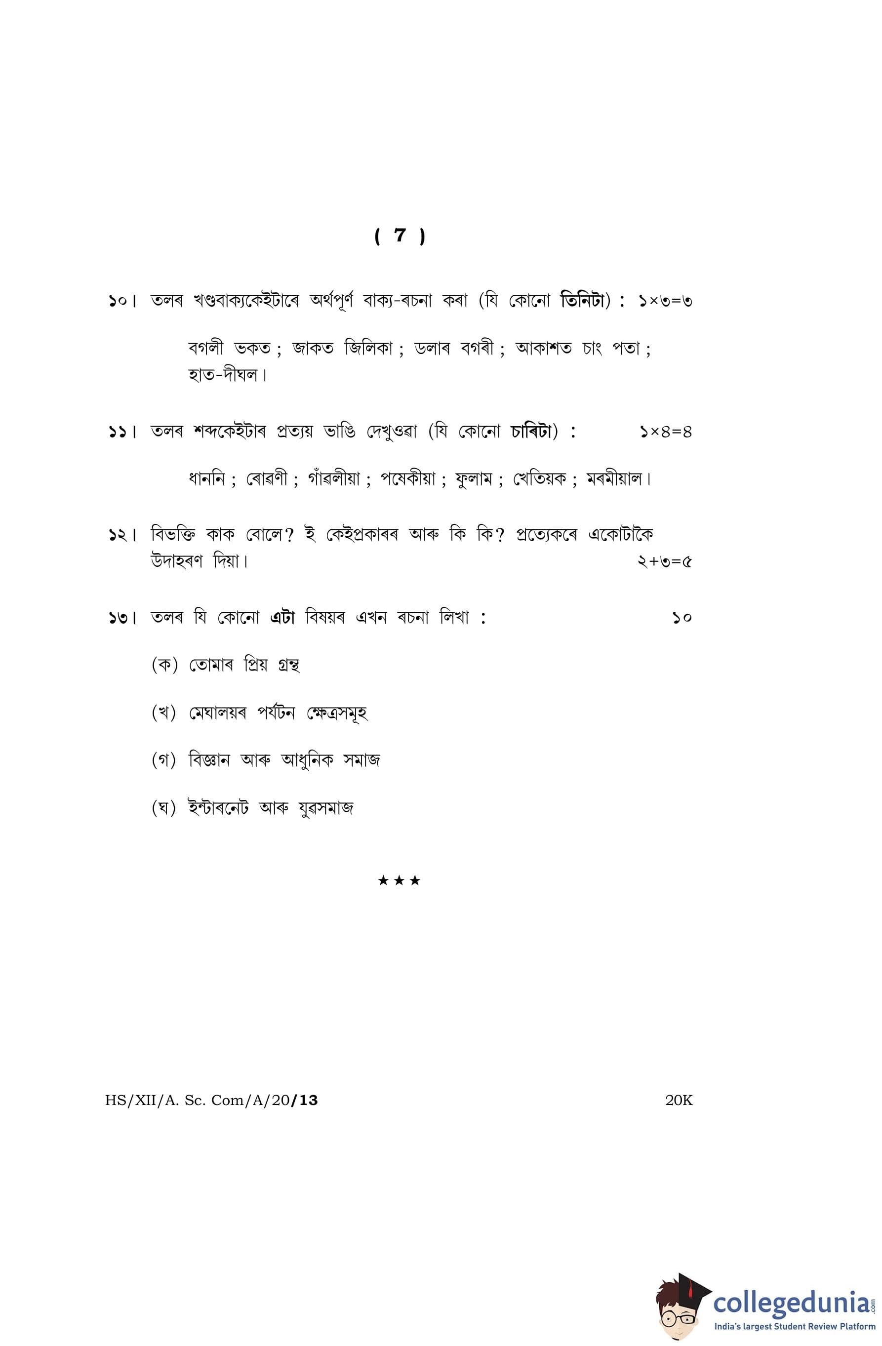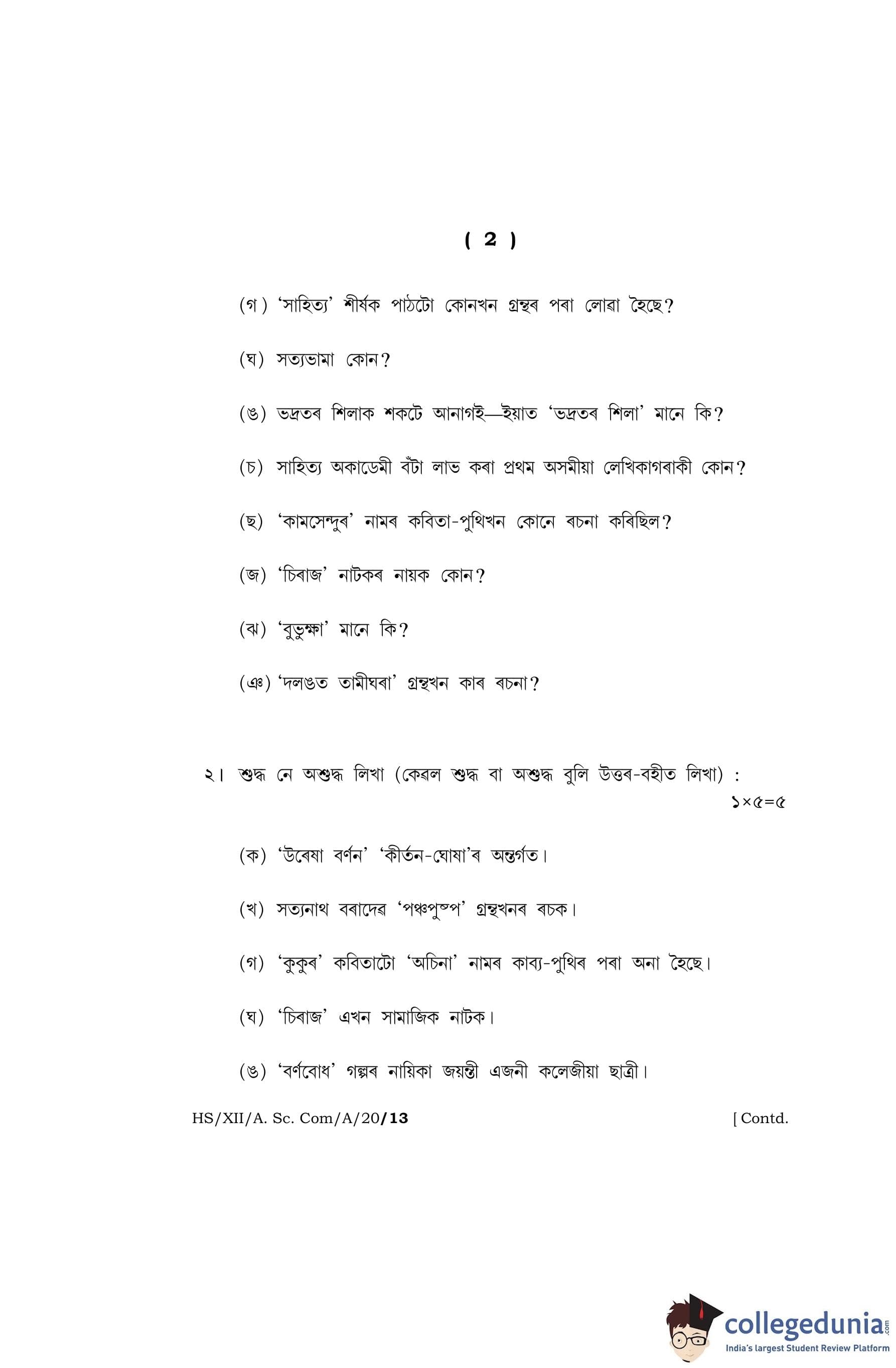 MBOSE Class 12 Assamese Question Paper 2020 with Answer Key