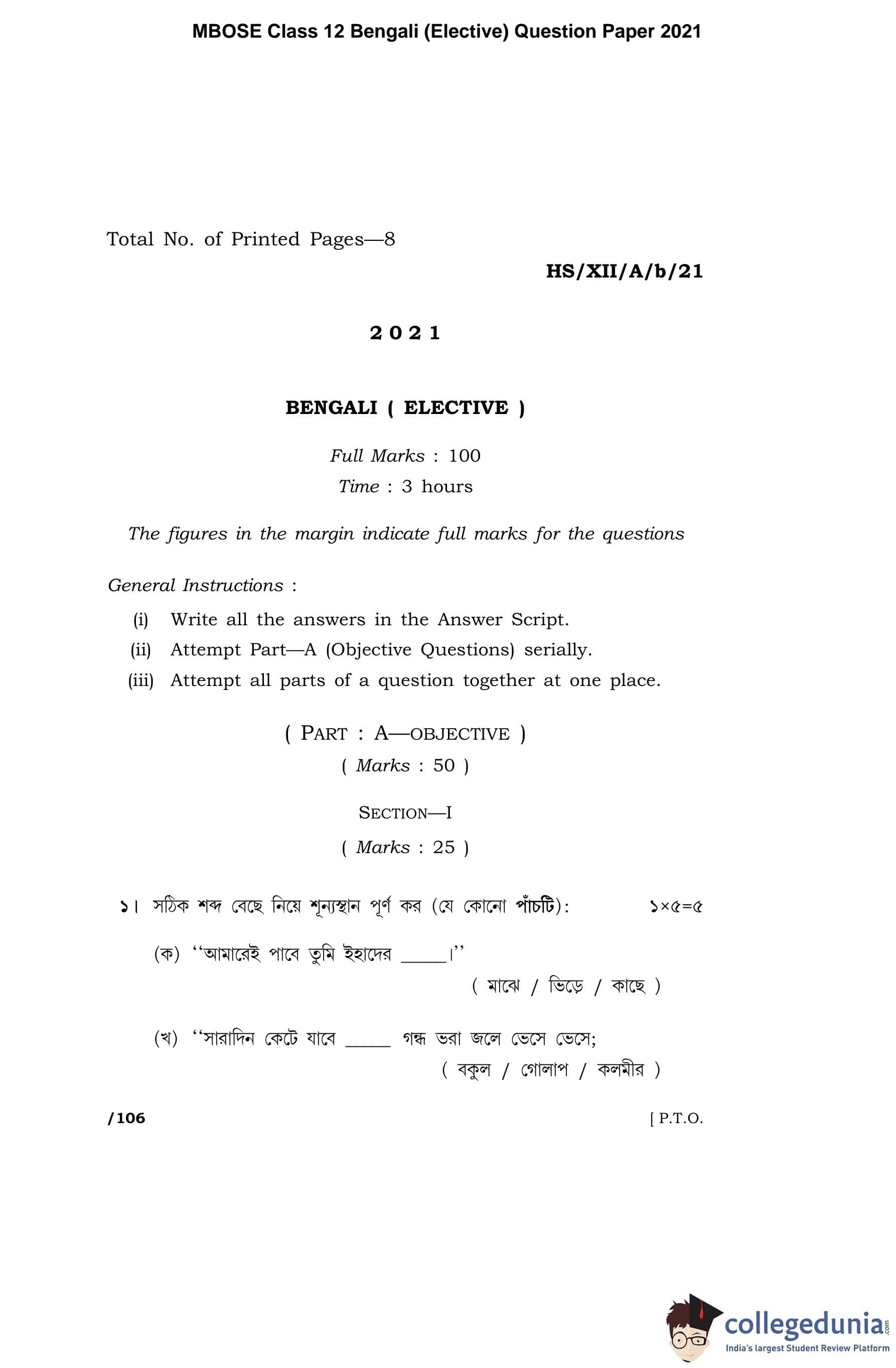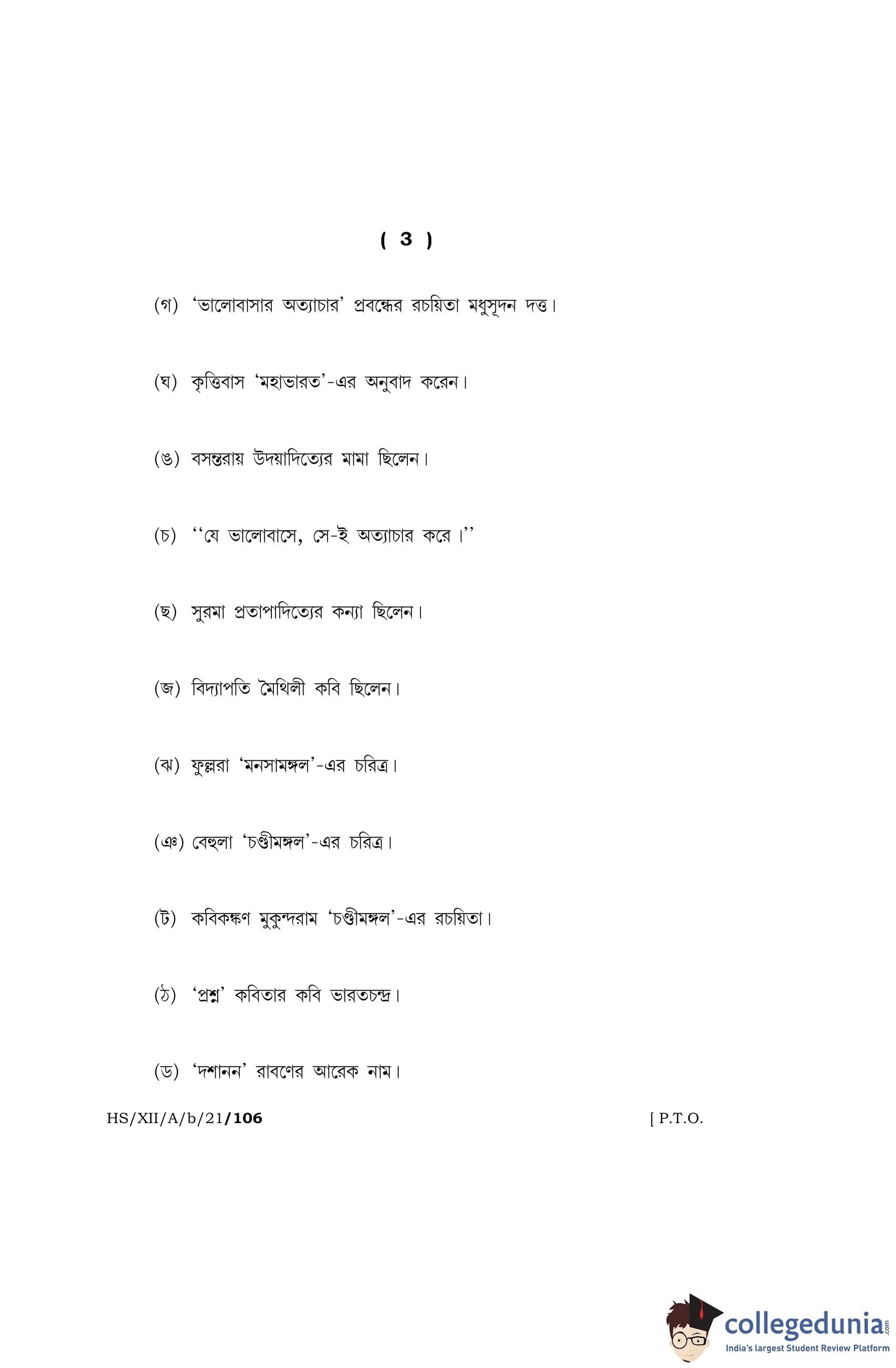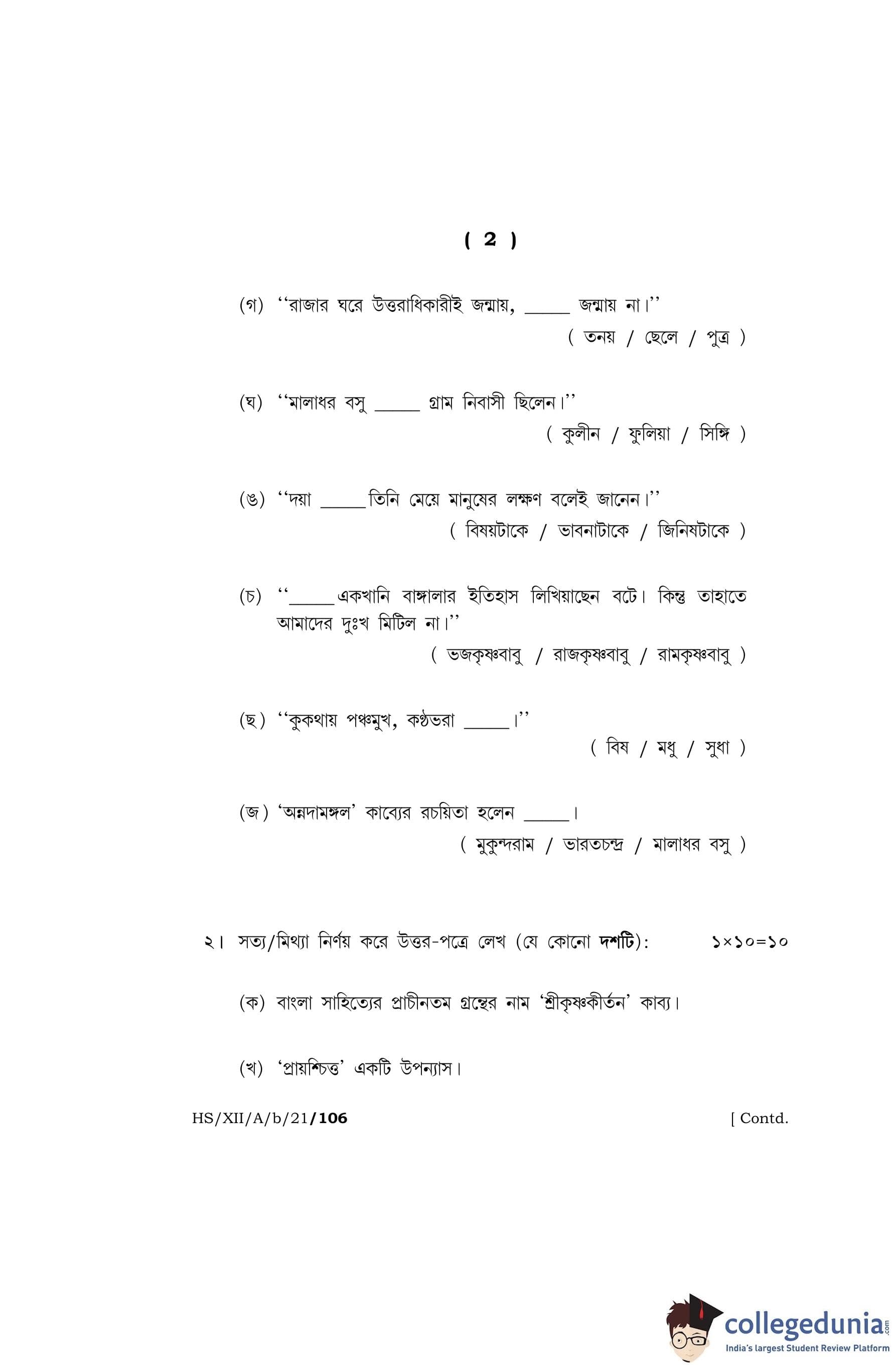 MBOSE Class 12 Bengali (Elective) Question Paper 2021 with Answer Key