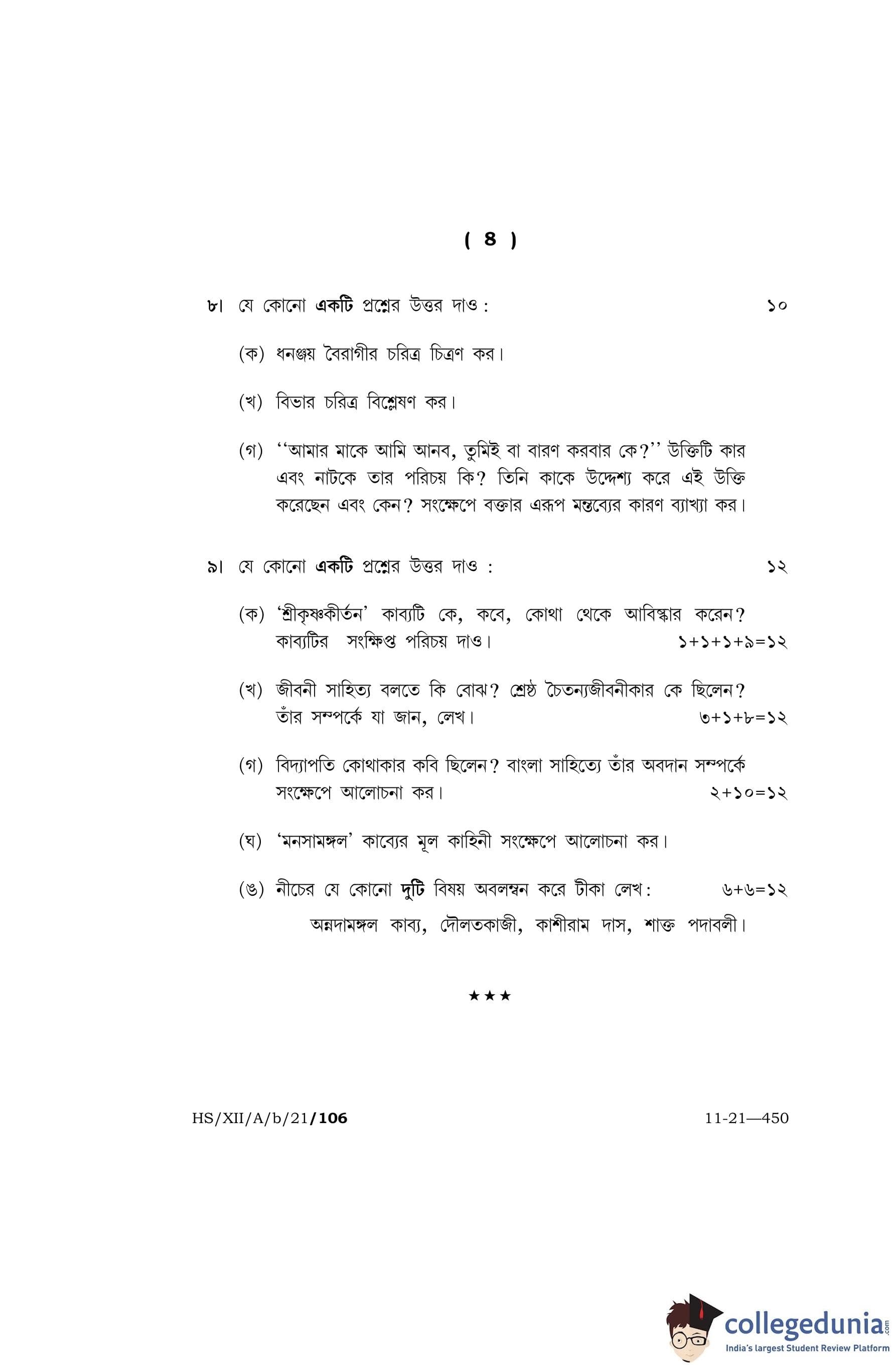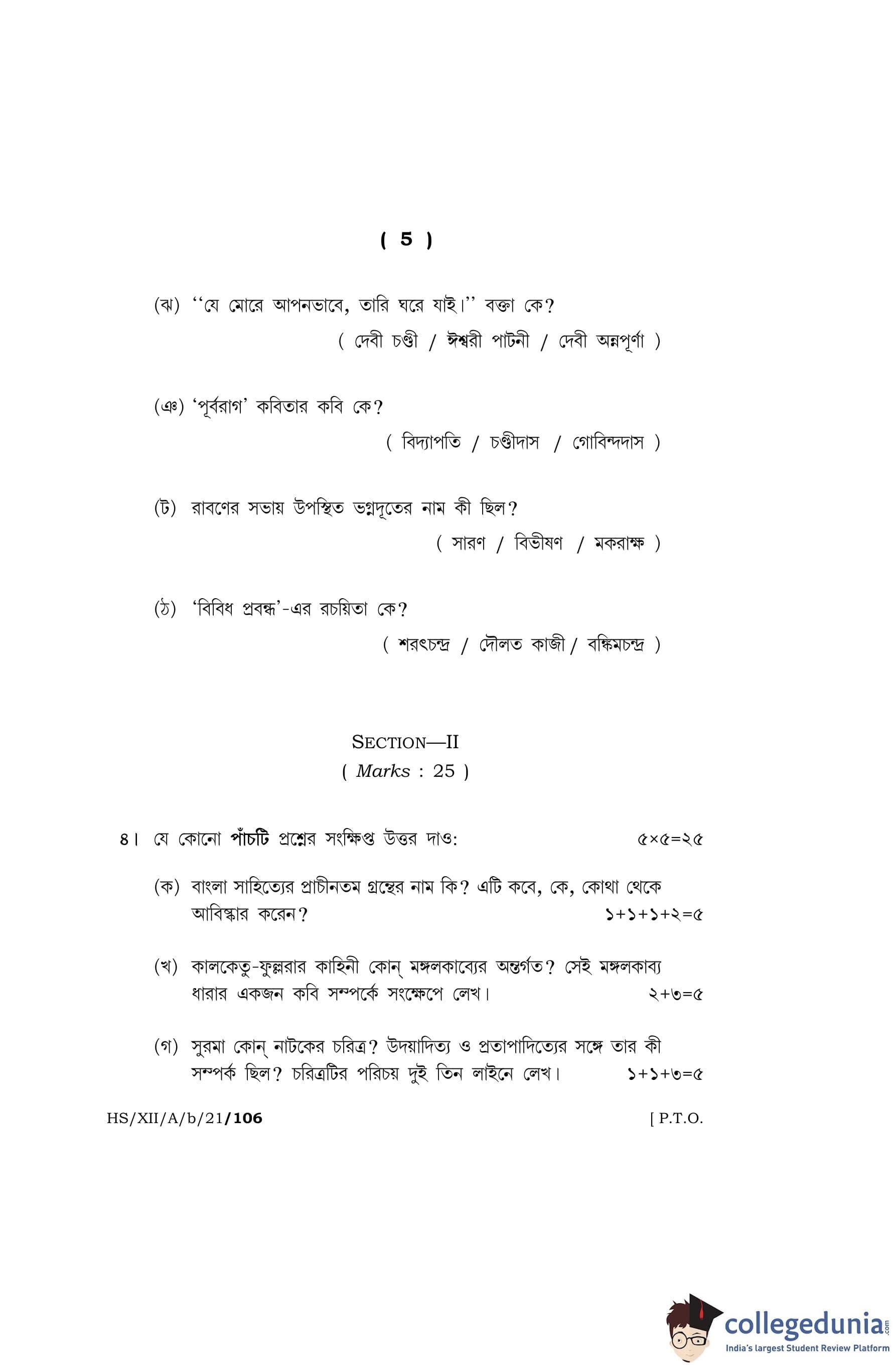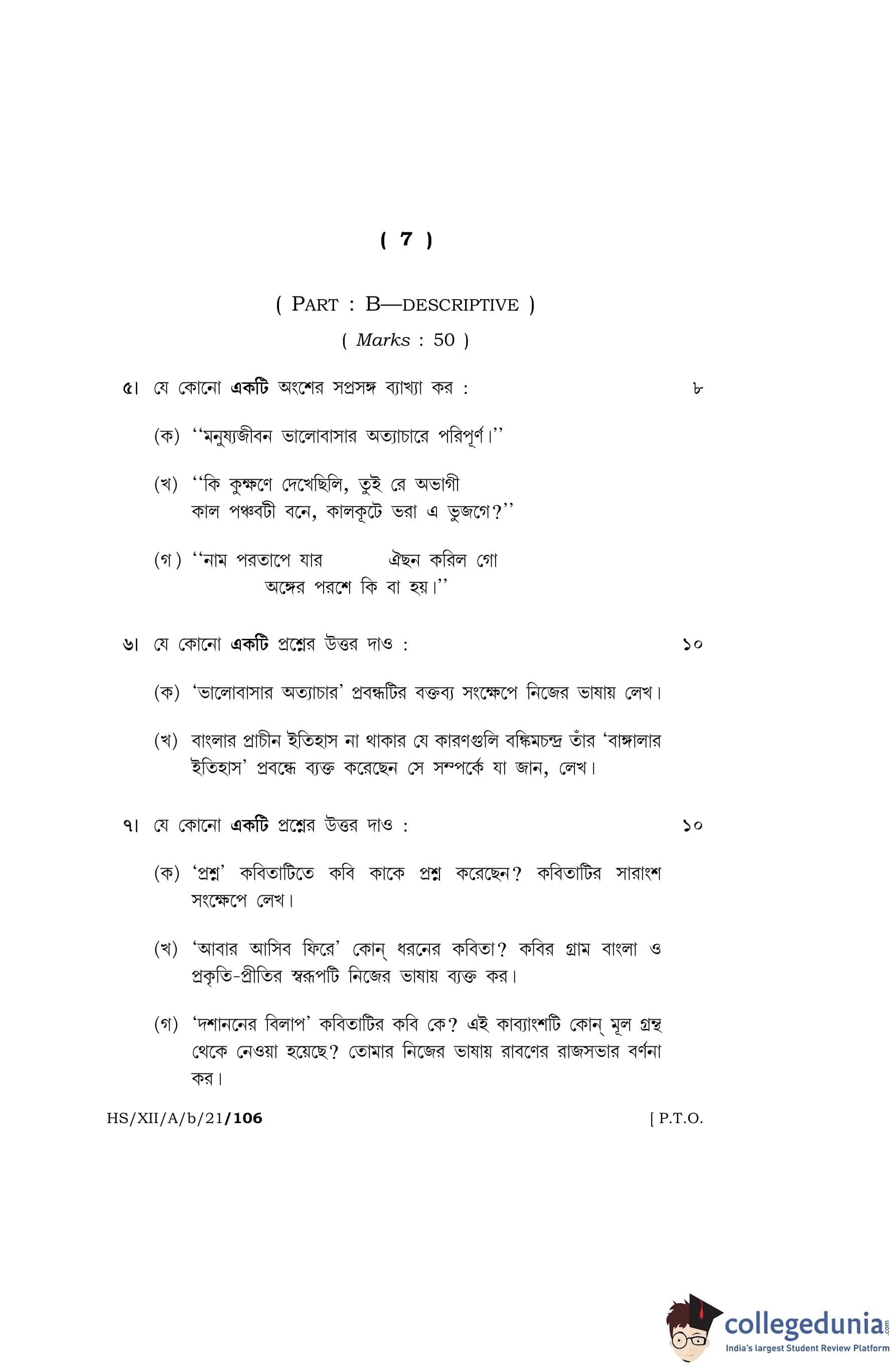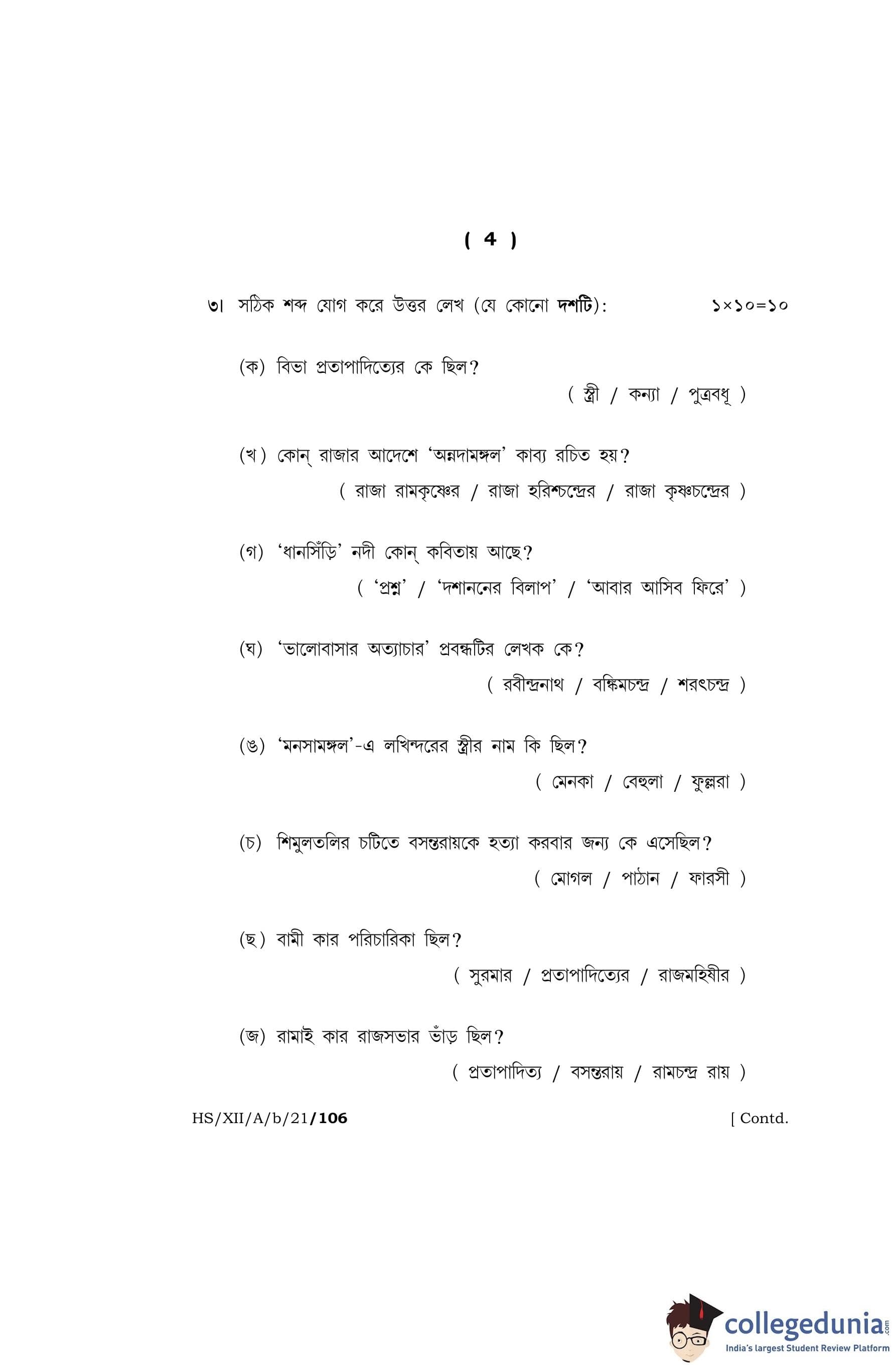 MBOSE Class 12 Bengali (Elective) Question Paper 2021 with Answer Key