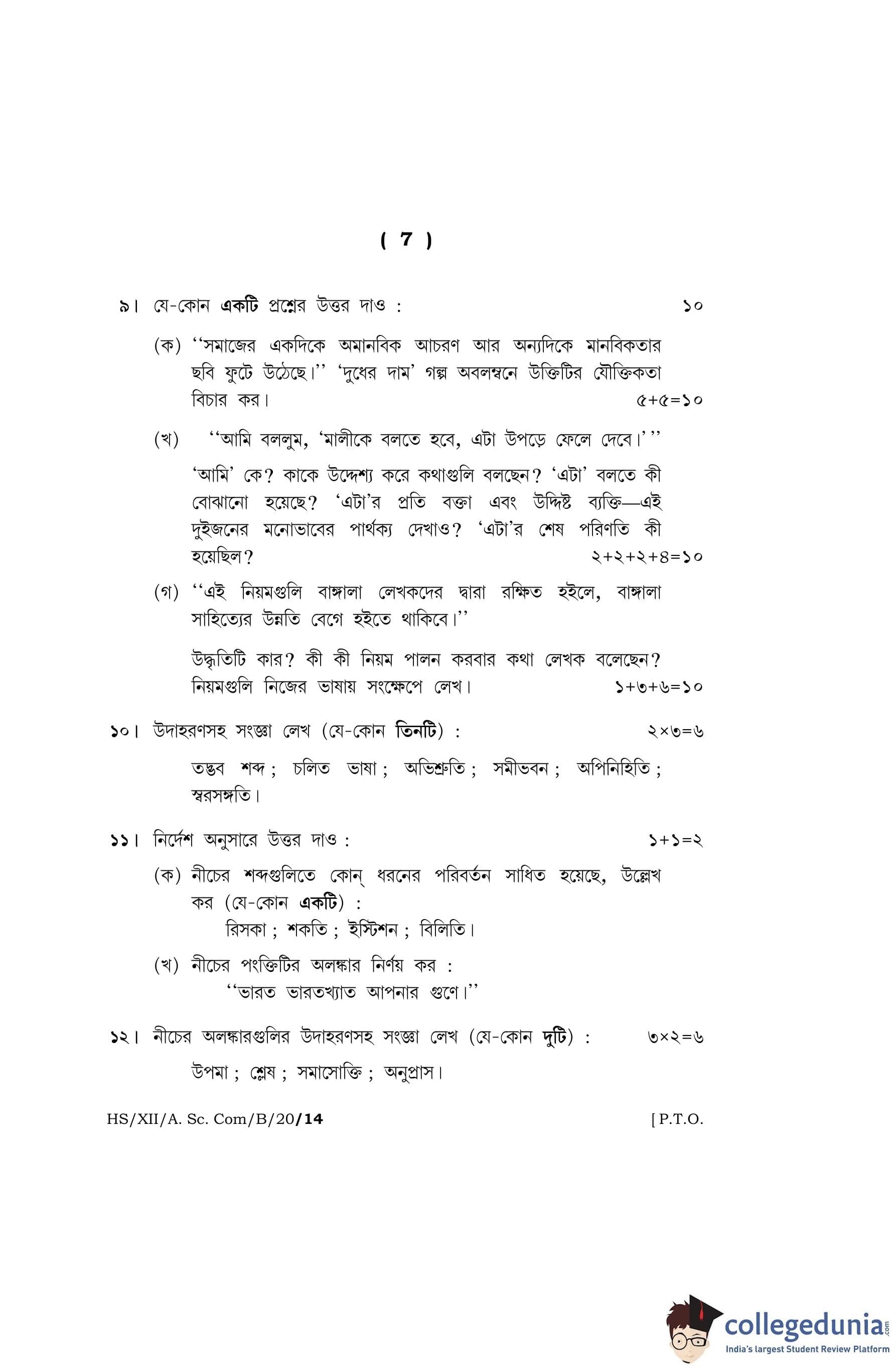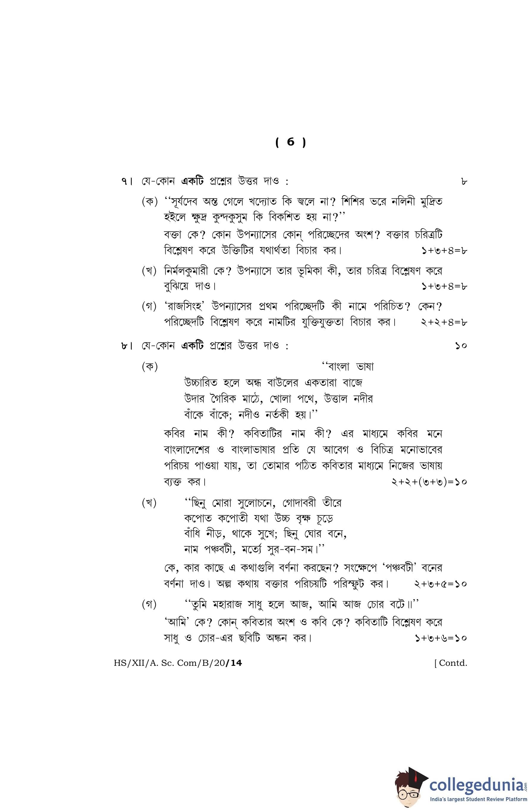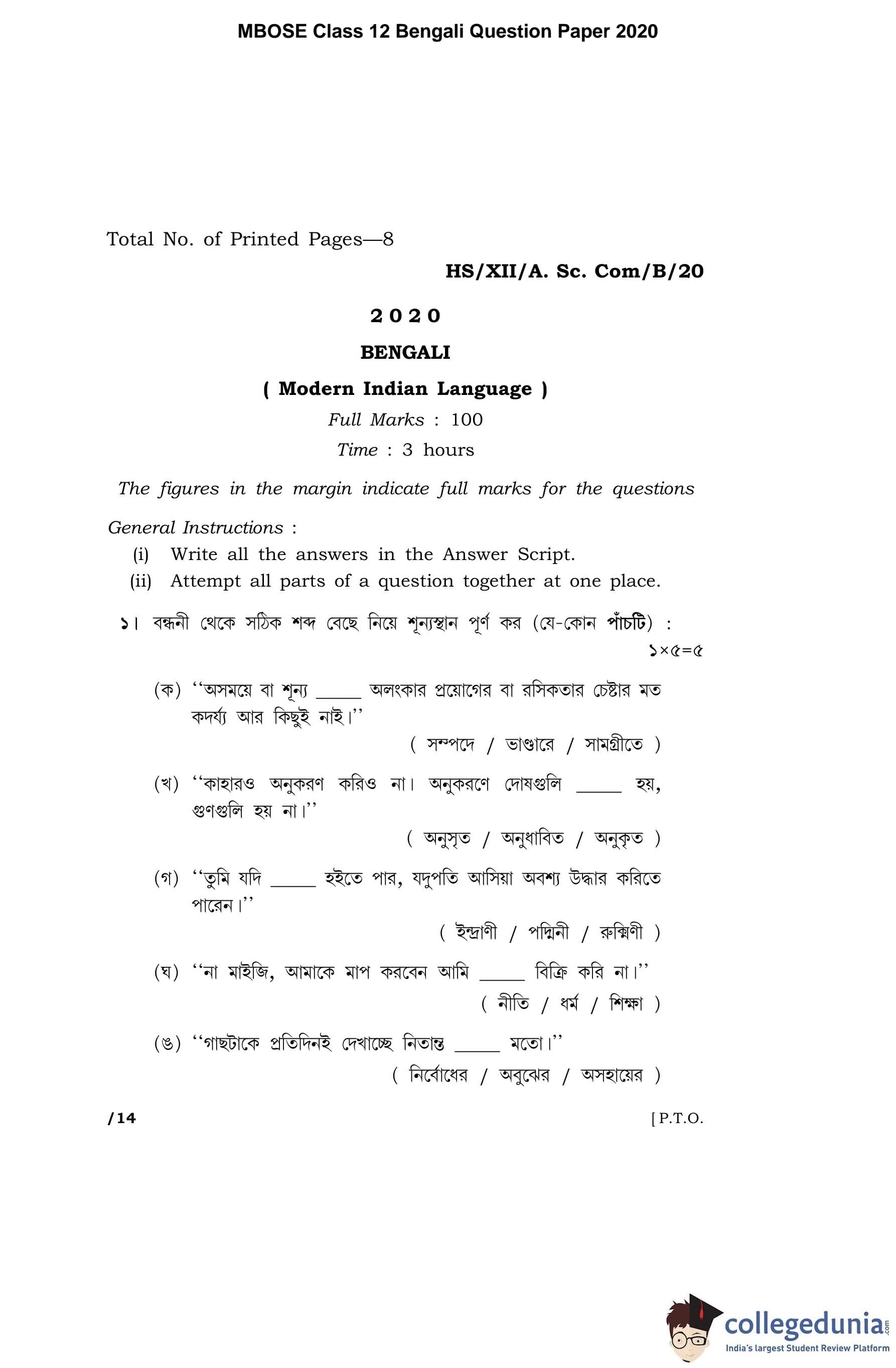 MBOSE Class 12 Bengali Question Paper 2020 with Answer Key