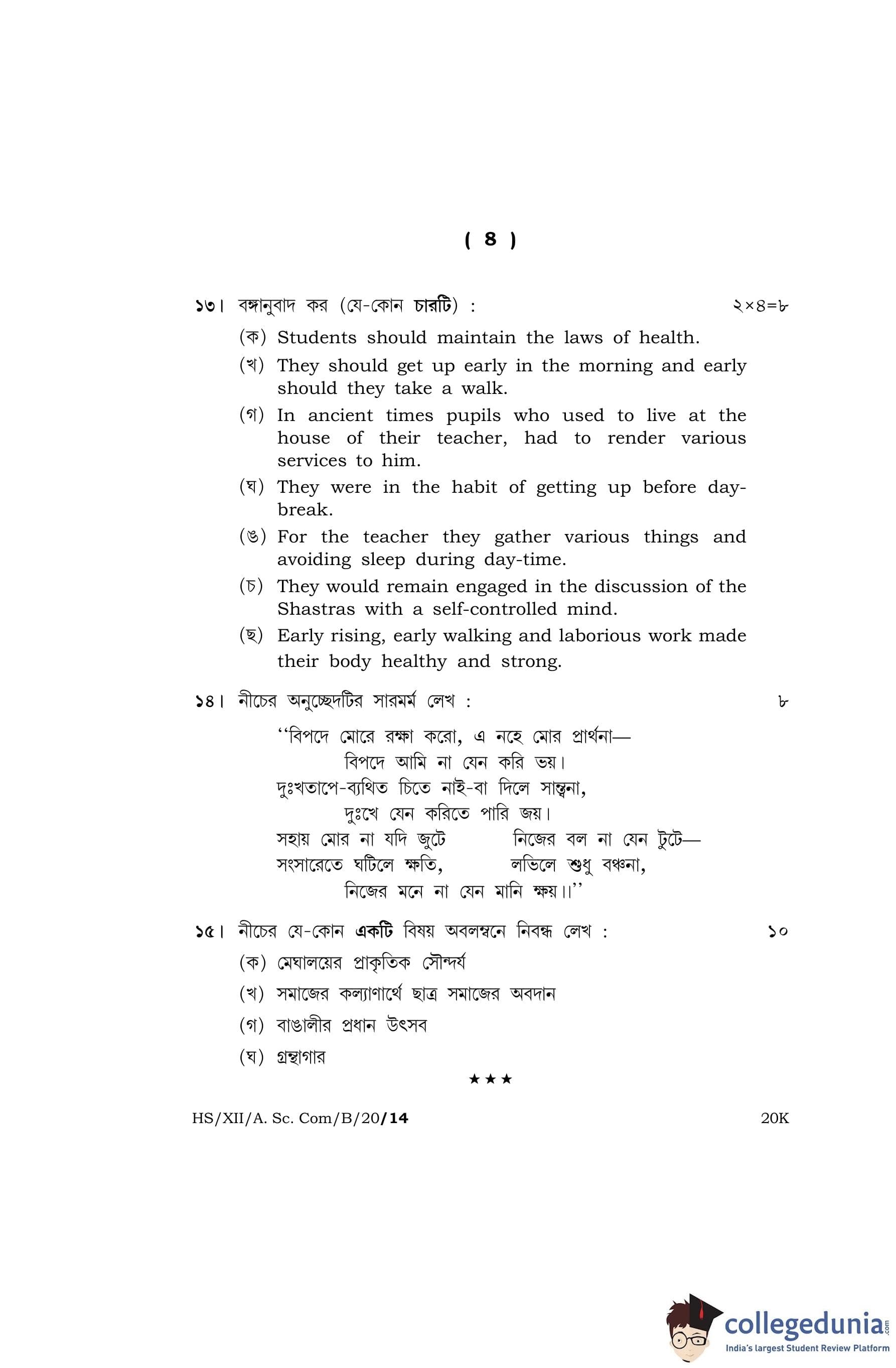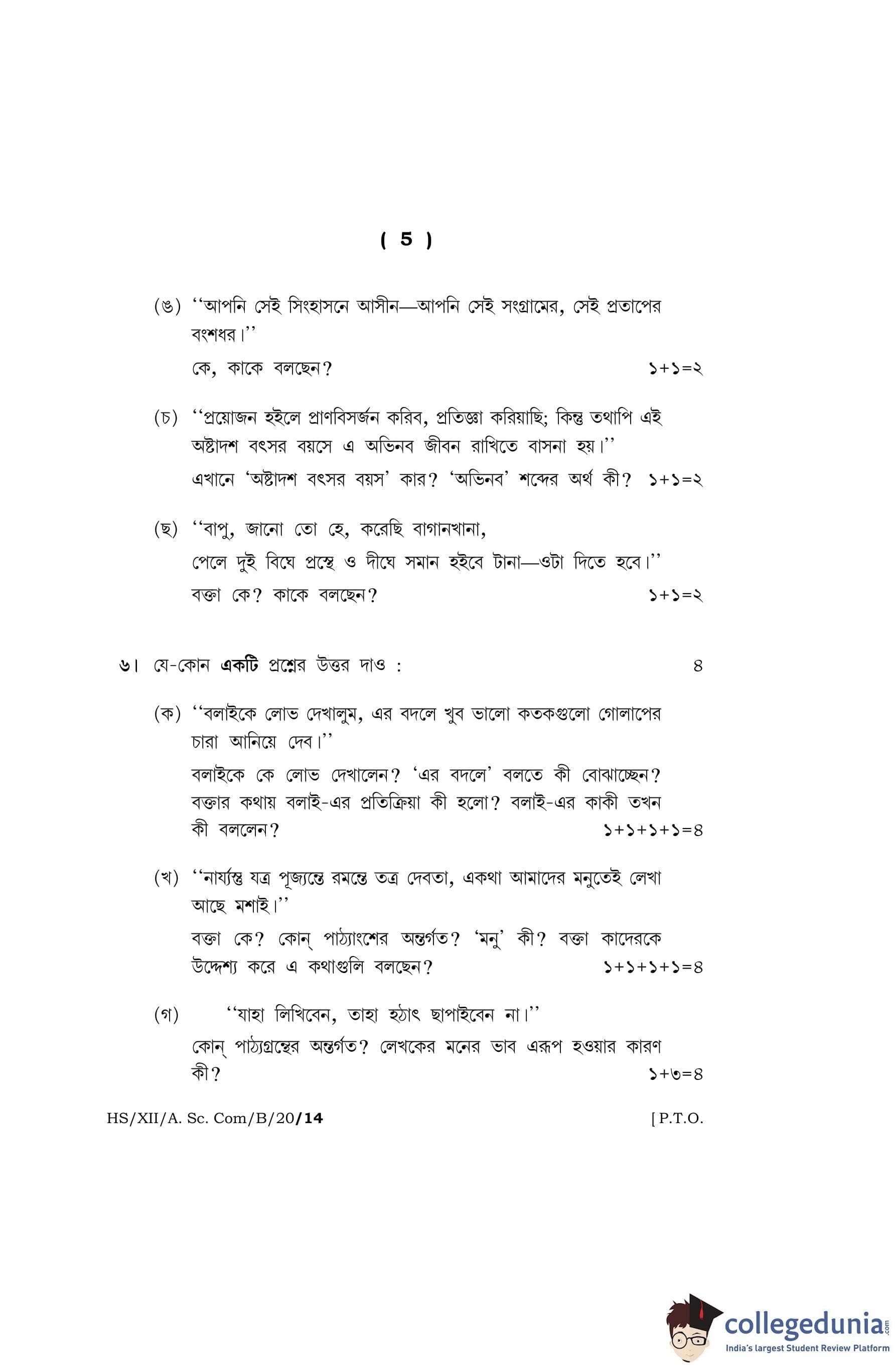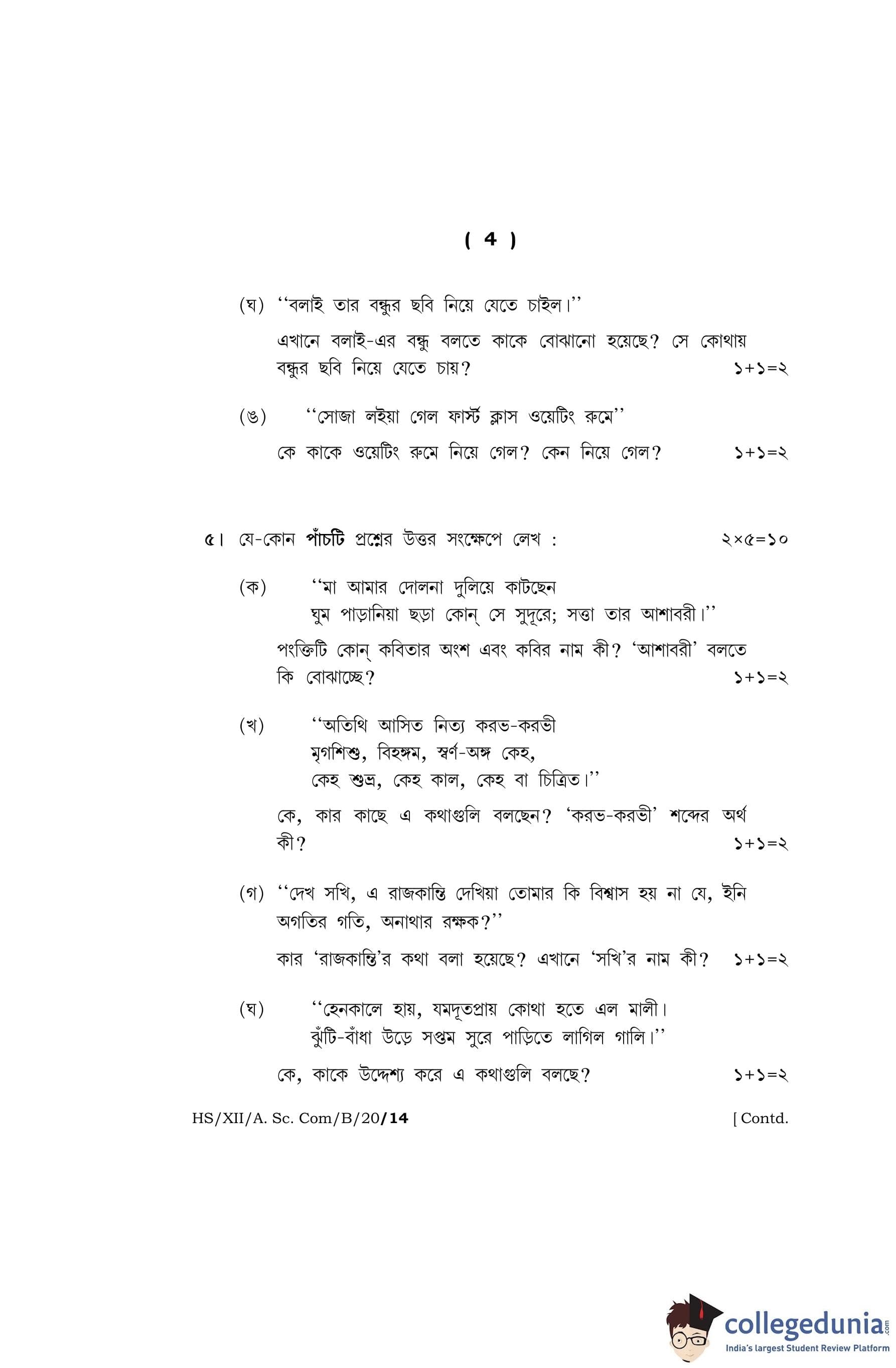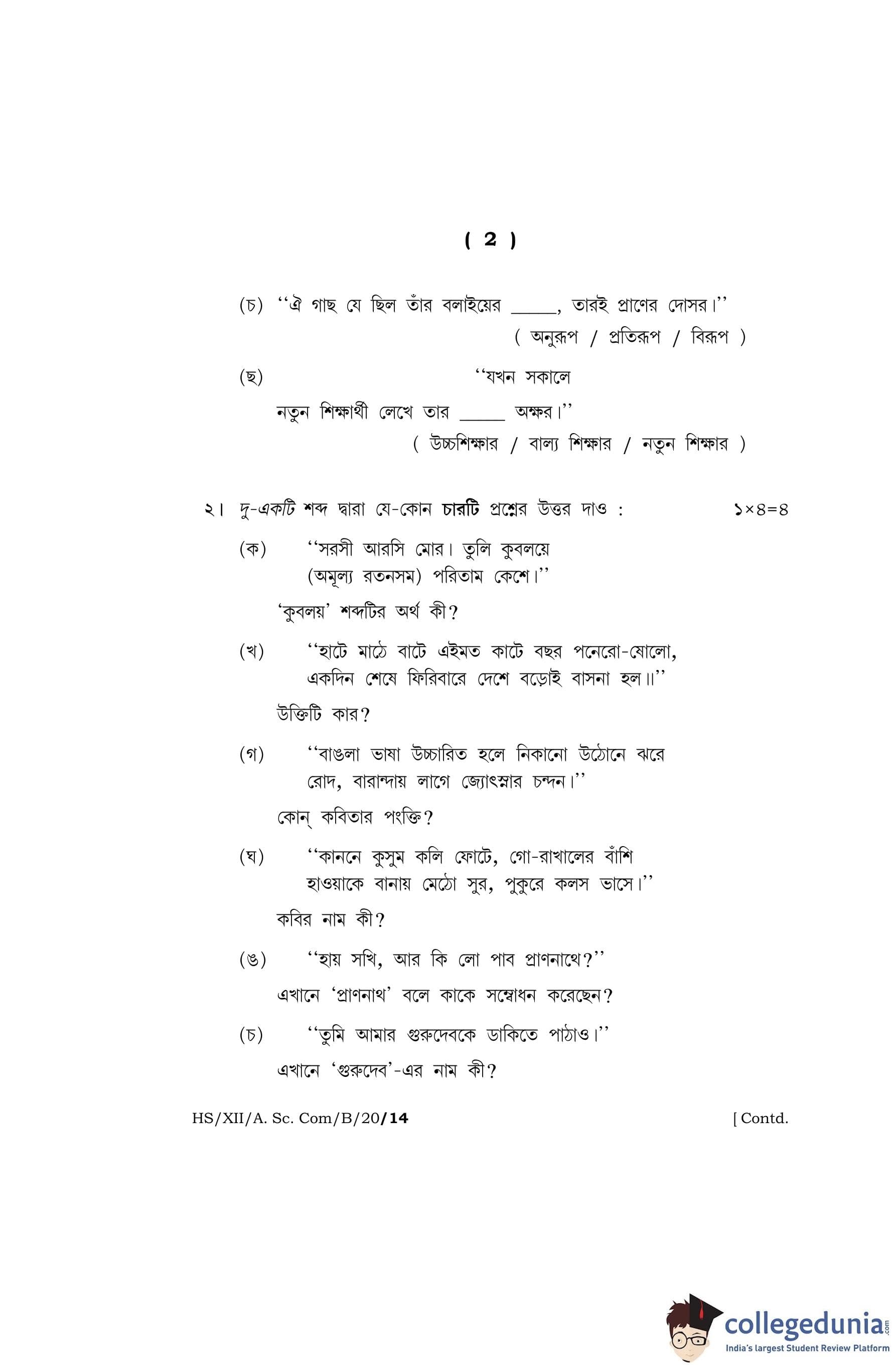 MBOSE Class 12 Bengali Question Paper 2020 with Answer Key