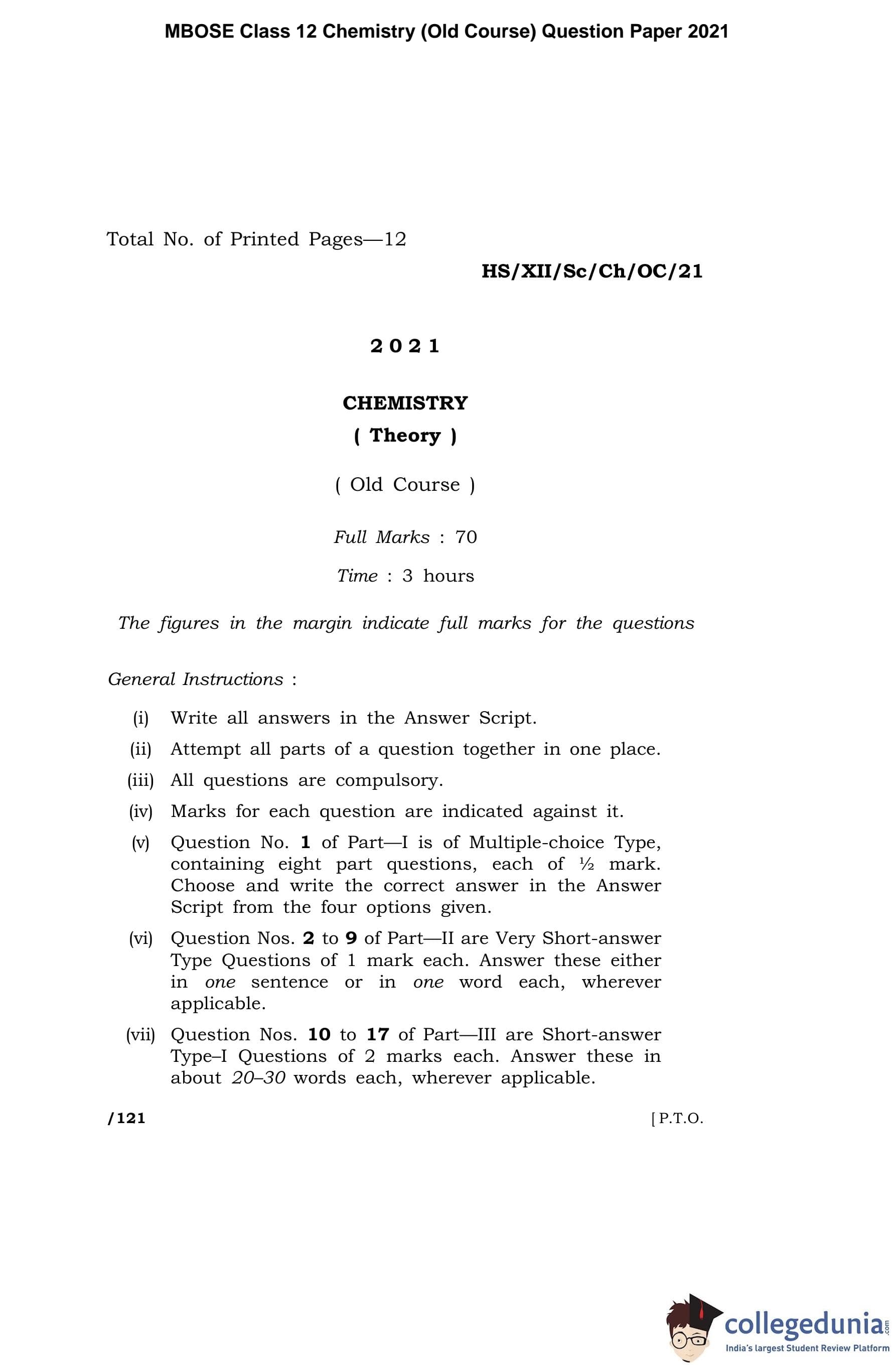 | MBOSE Class 12 Chemistry Question Paper 2021 PDF | MBOSE Class 12 Chemistry Answer Key 2021 PDF |