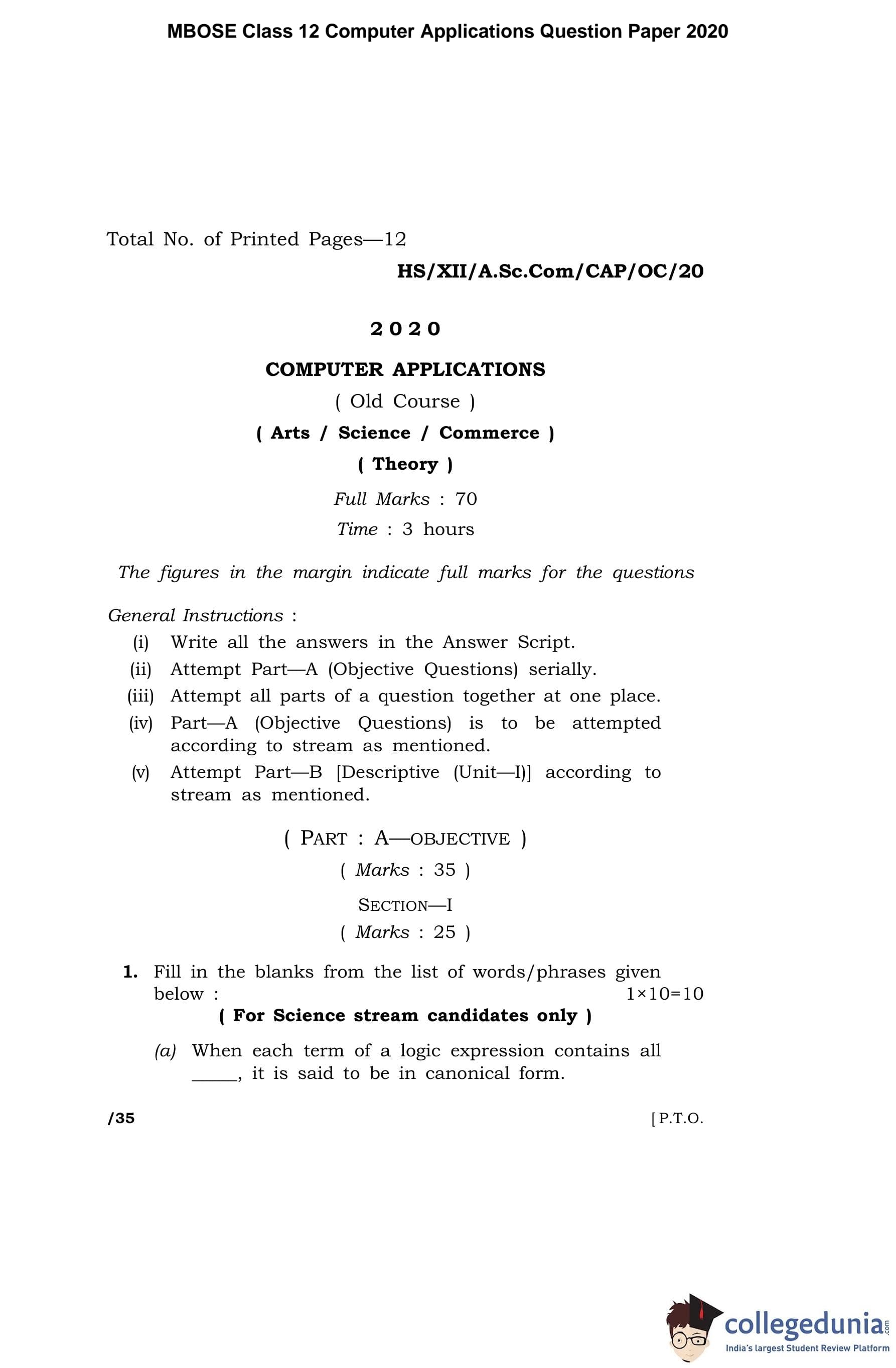 | MBOSE Class 12 Computer Applications Question Paper 2020 PDF | MBOSE Class 12 Computer Applications Answer Key 2020 PDF |