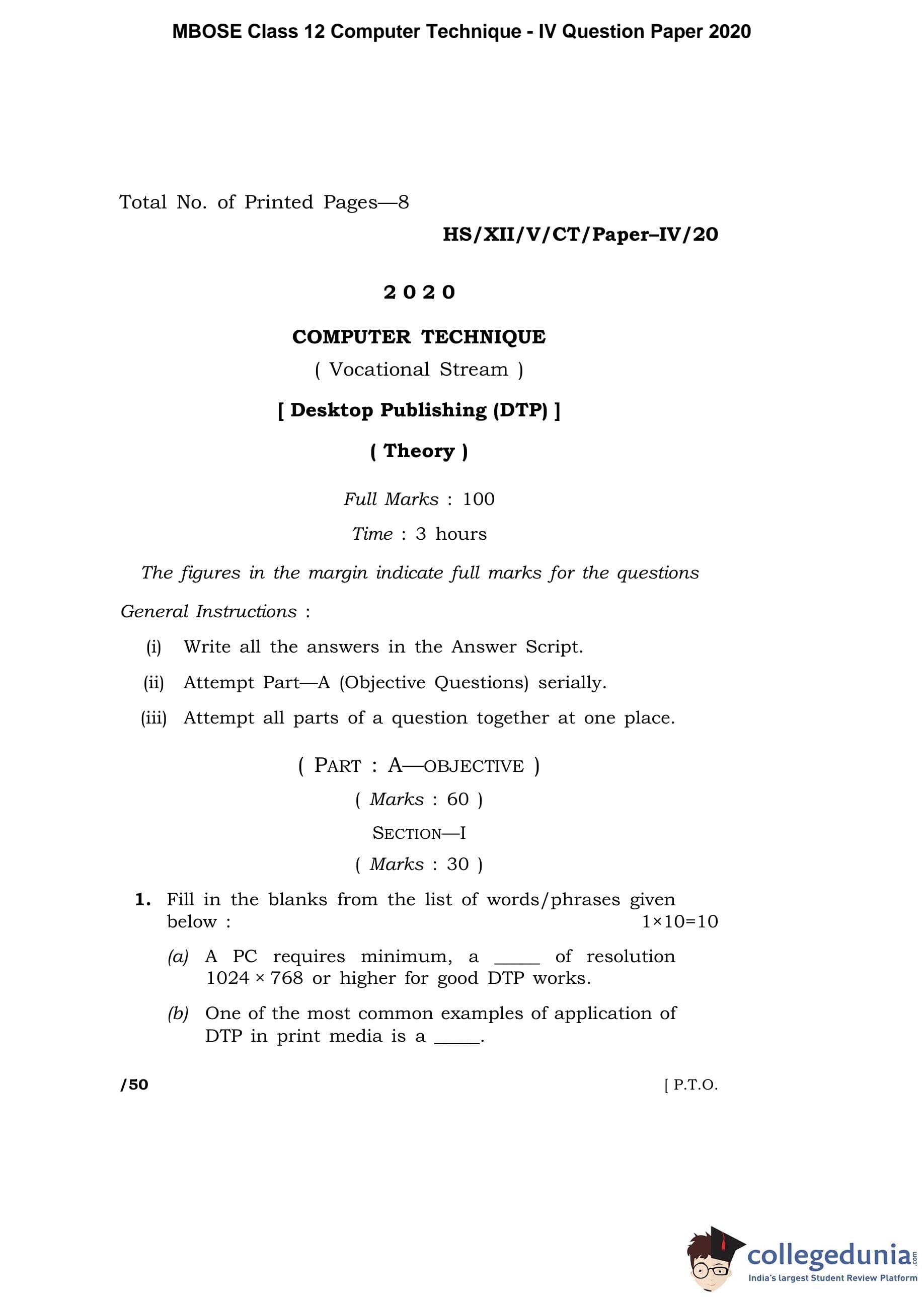 | MBOSE Class 12 Computer Techniquie - IV Question Paper 2020 PDF | MBOSE Class 12 Computer Techniquie - IV Answer Key 2020 PDF |