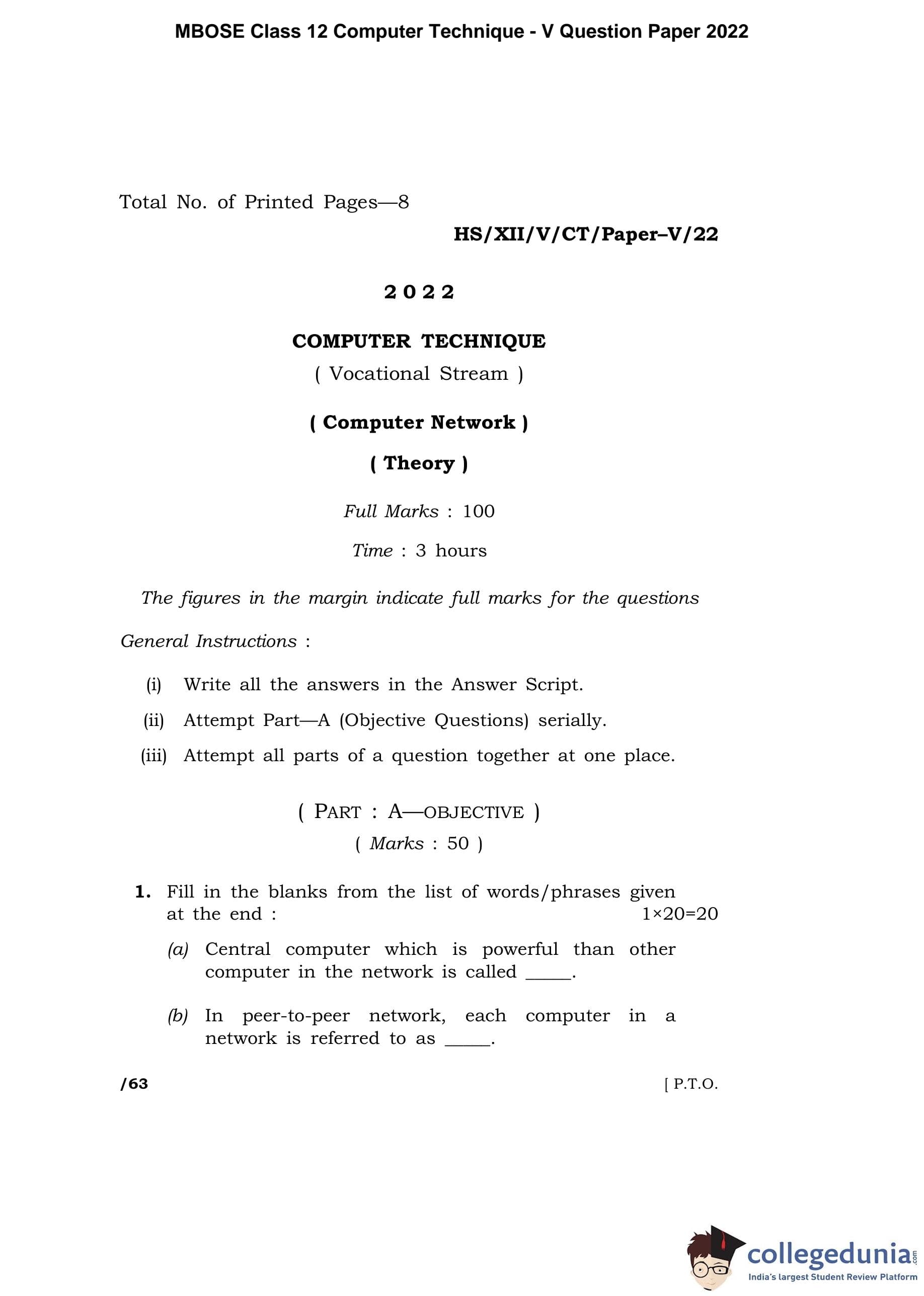 | MBOSE Class 12 Computer Techniquie - V Question Paper 2022 PDF | MBOSE Class 12 Computer Techniquie - V Answer Key 2022 PDF |