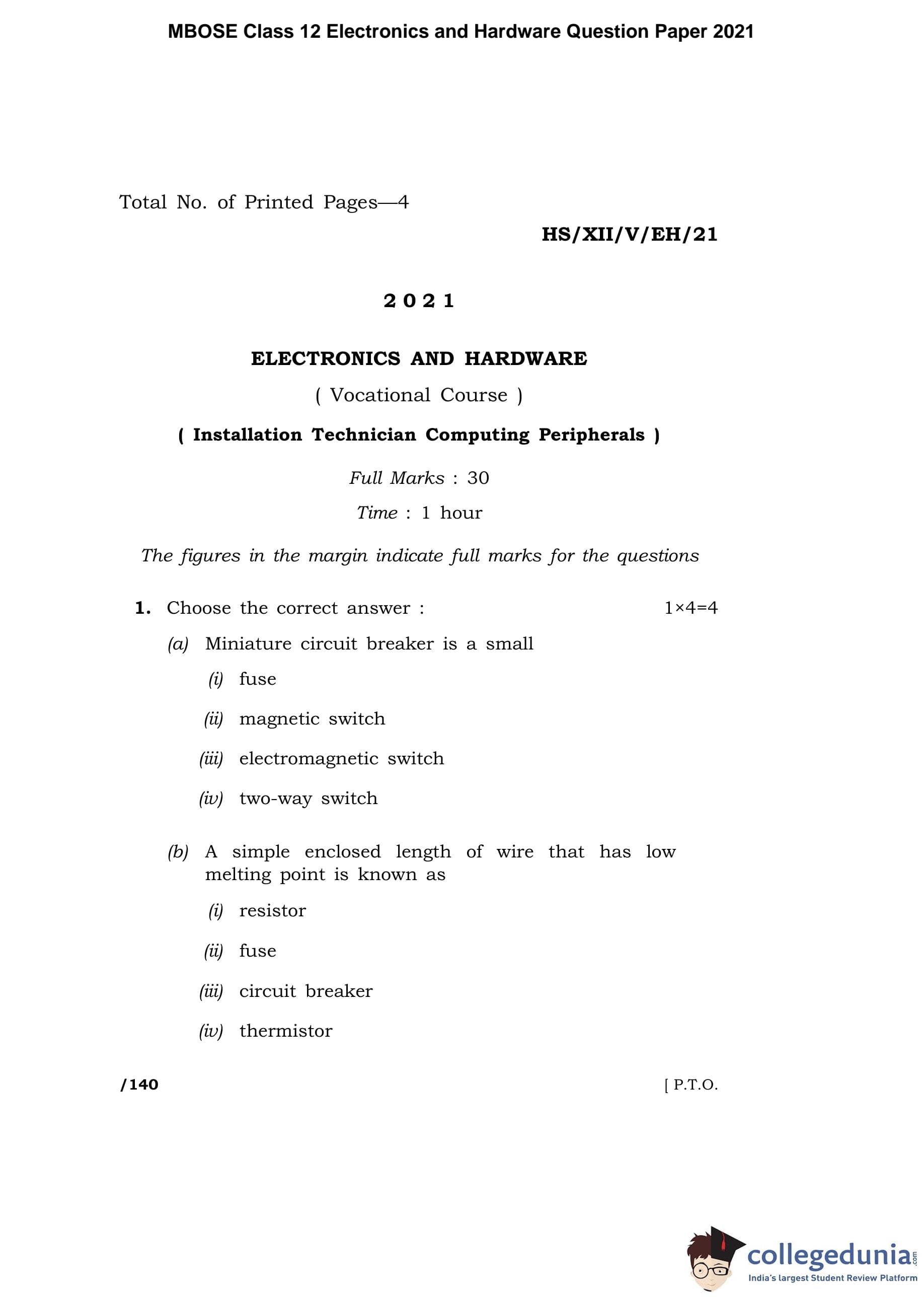 MBOSE Class 12 Electronics and Hardware Question Paper 2021 with Answer Key
