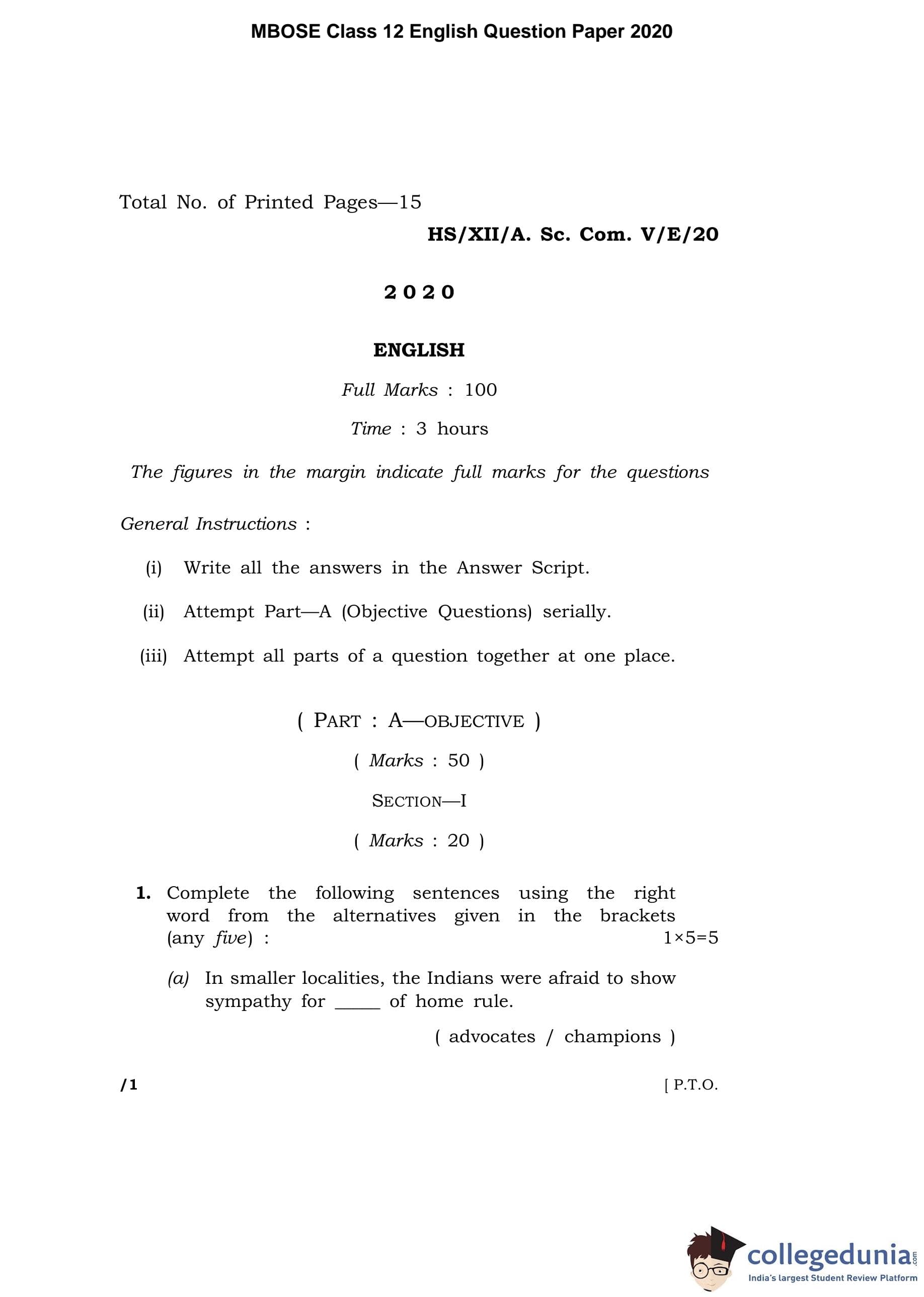 | MBOSE Class 12 English Question Paper 2020 PDF | MBOSE Class 12 English Answer Key 2020 PDF |