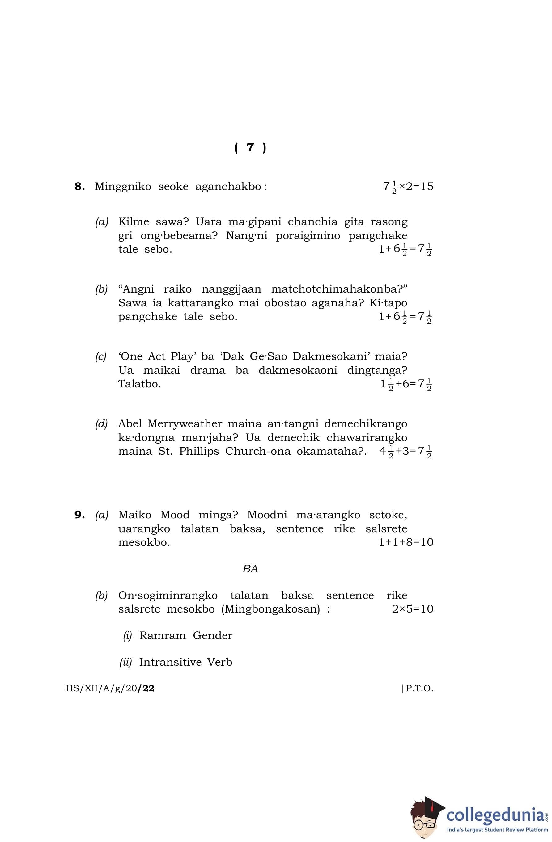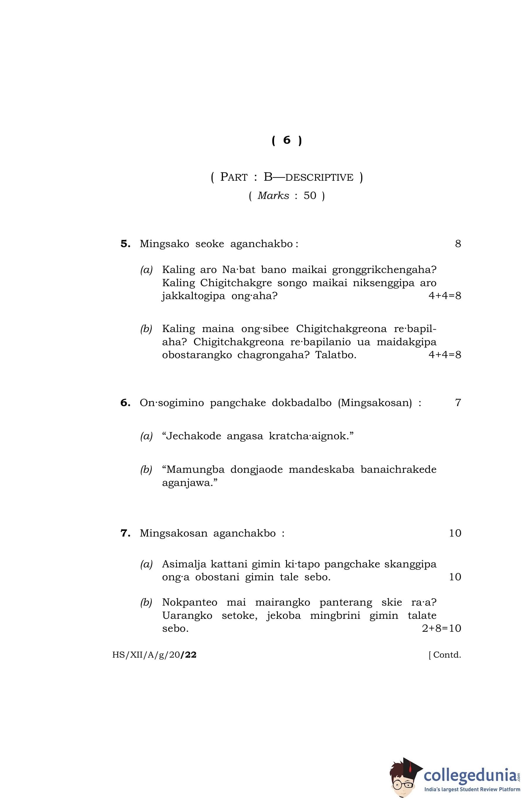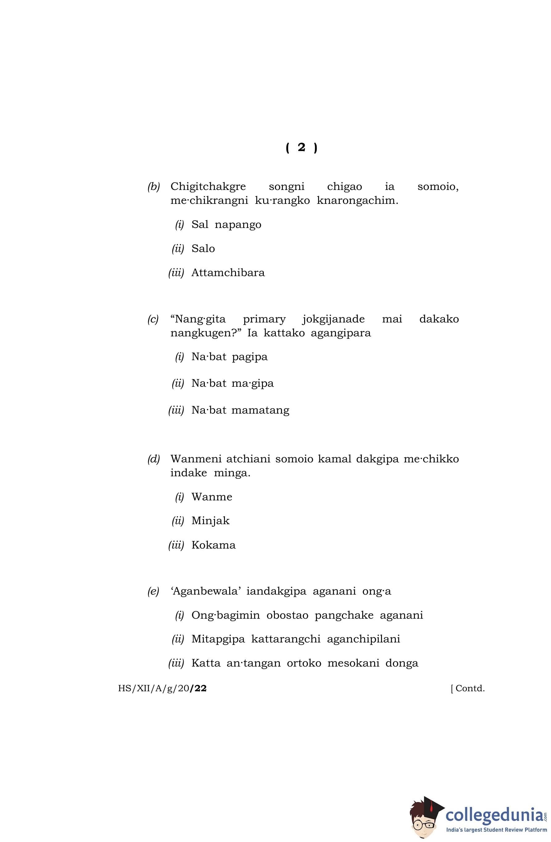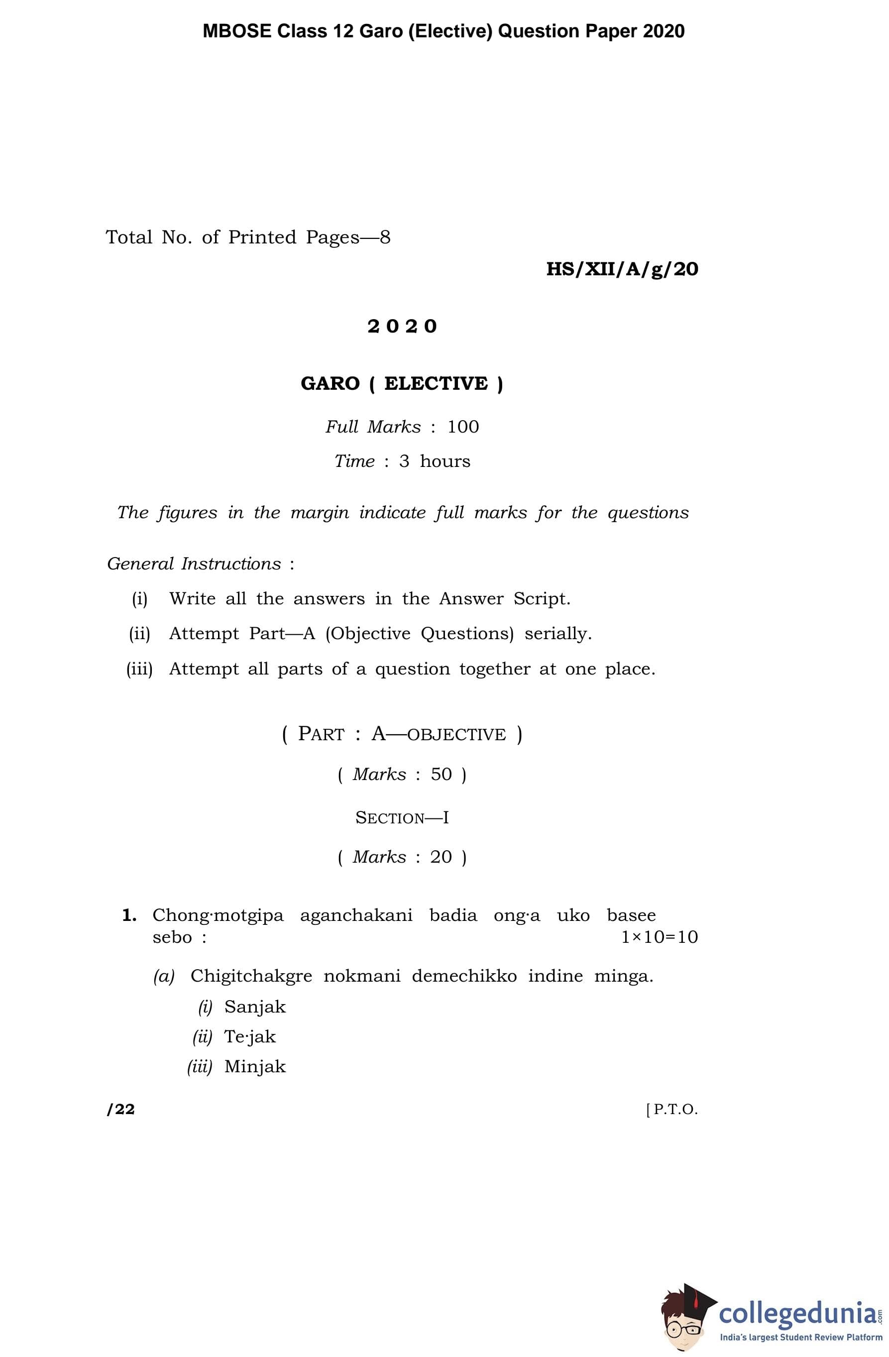 MBOSE Class 12 Garo (Elective) Question Paper 2020 with Answer Key pdf is available for download here. The exam was conducted by Meghalaya Board of School Education on March 19, 2020 in the Morning Session 10 AM to 1 PM. The question paper comprised a total of 9 questions divided among 2 sections.