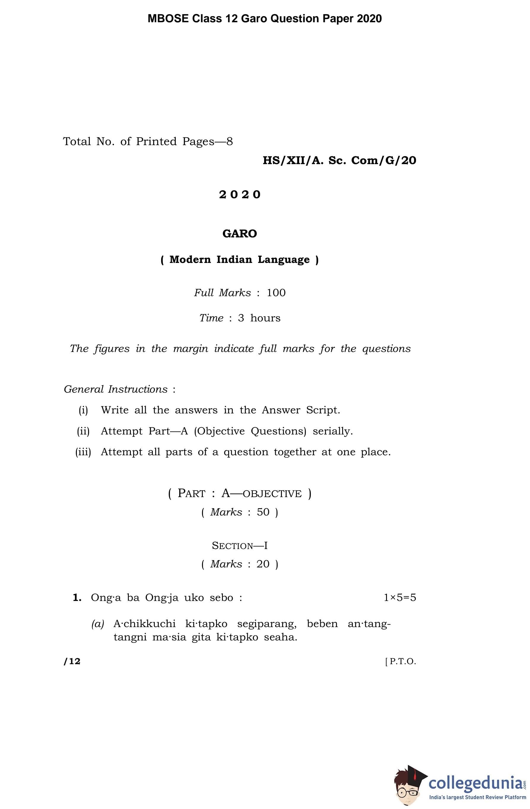 MBOSE Class 12 Garo Question Paper 2020 with Answer Key pdf is available for download here. The exam was conducted by Meghalaya Board of School Education on March 3, 2020 in the Morning Session 10 AM to 1 PM. The question paper comprised a total of 9 questions divided among 2 sections.