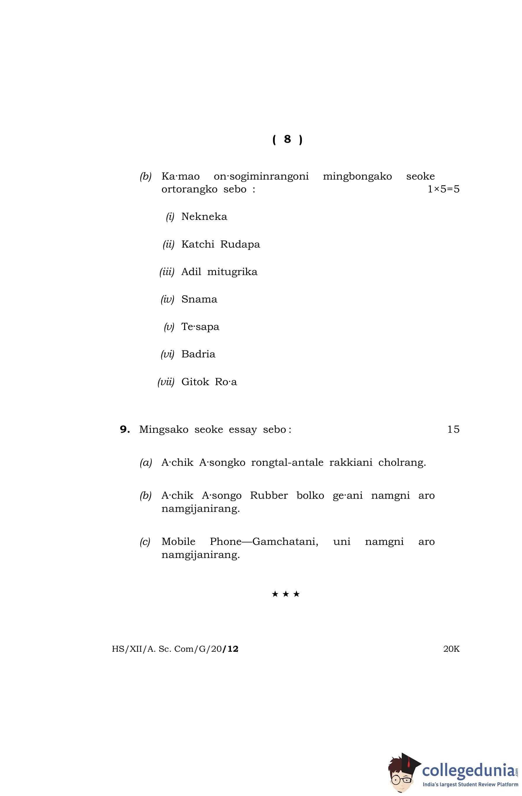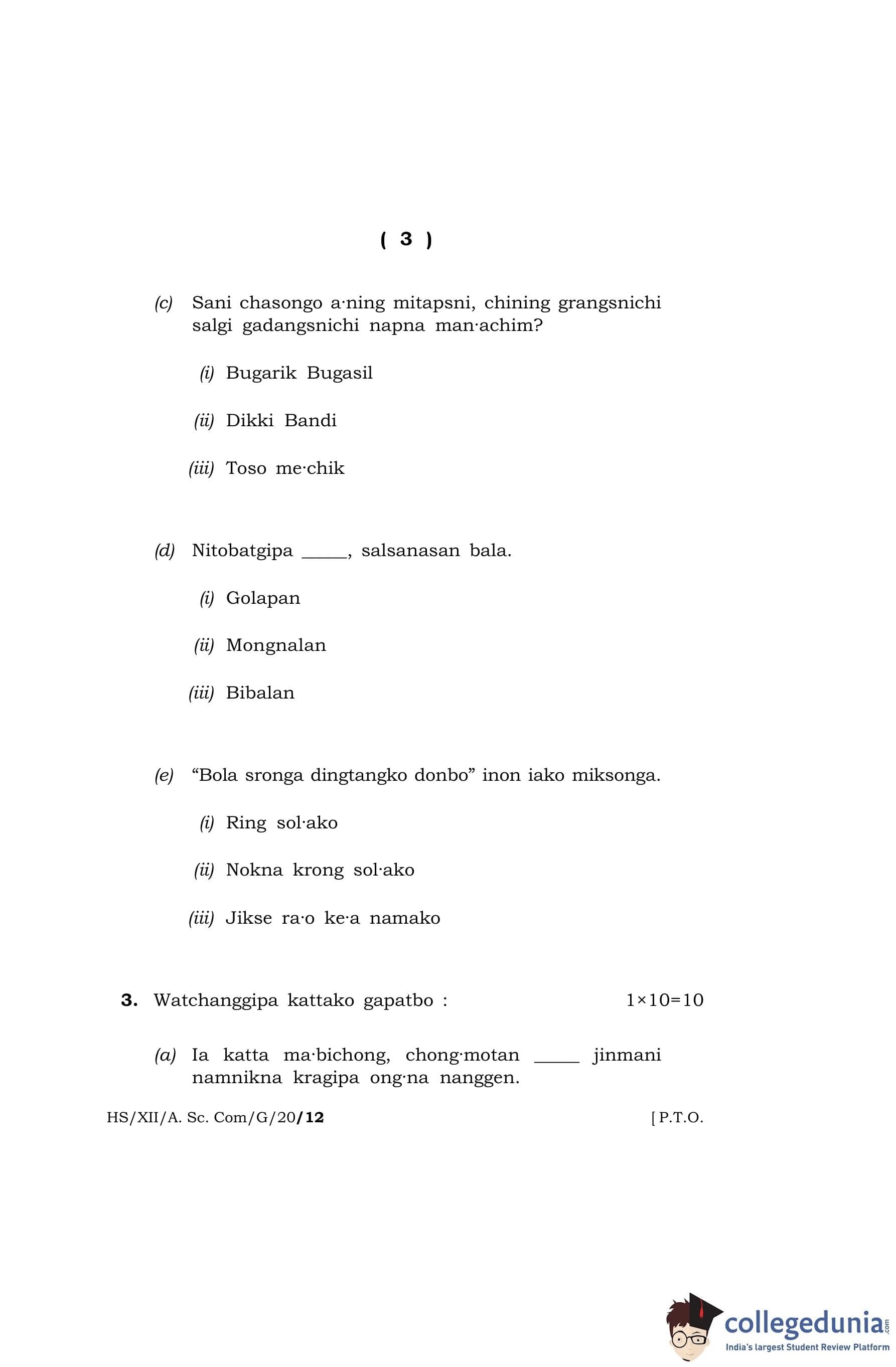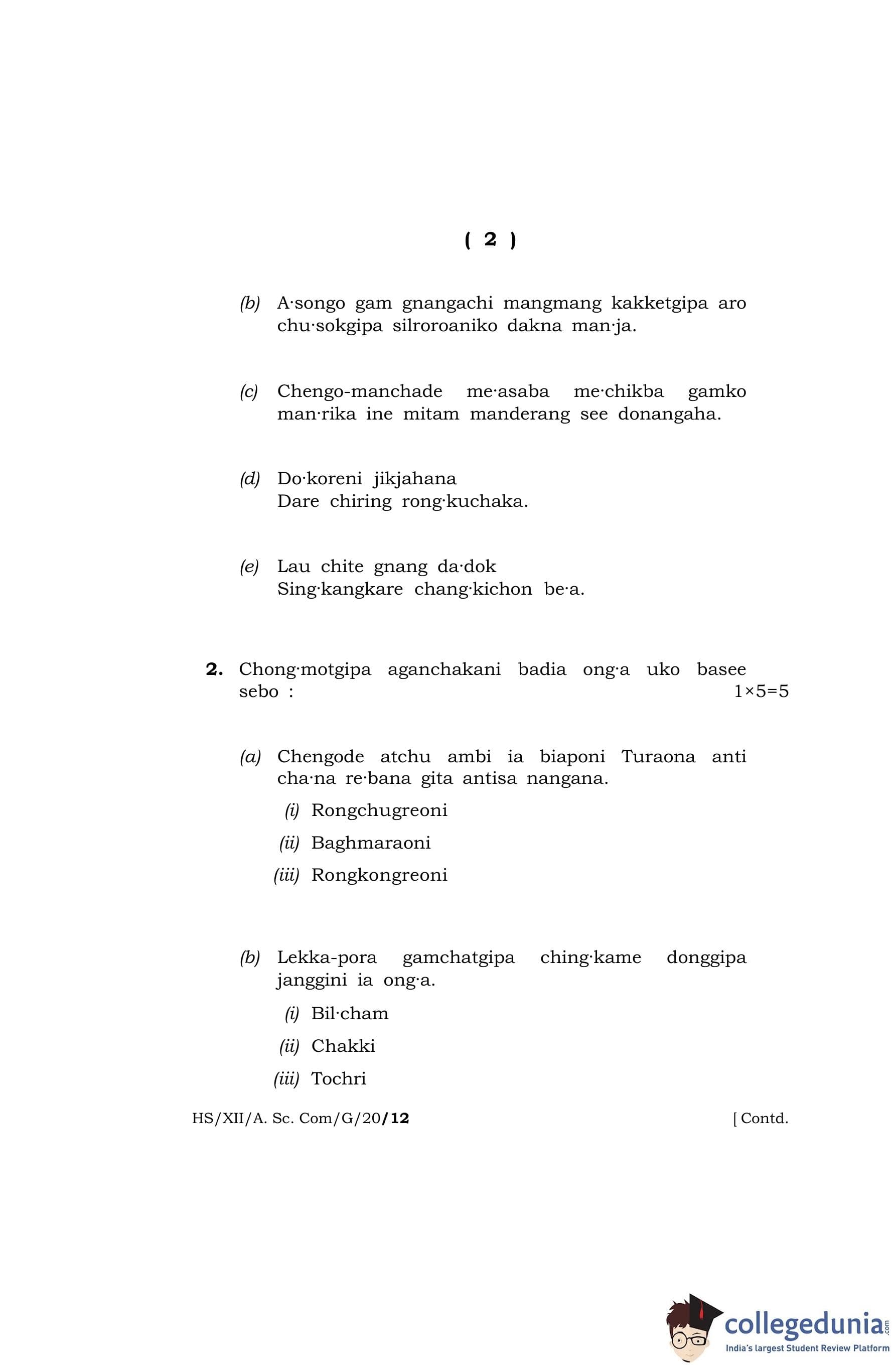 MBOSE Class 12 Garo Question Paper 2020 with Answer Key