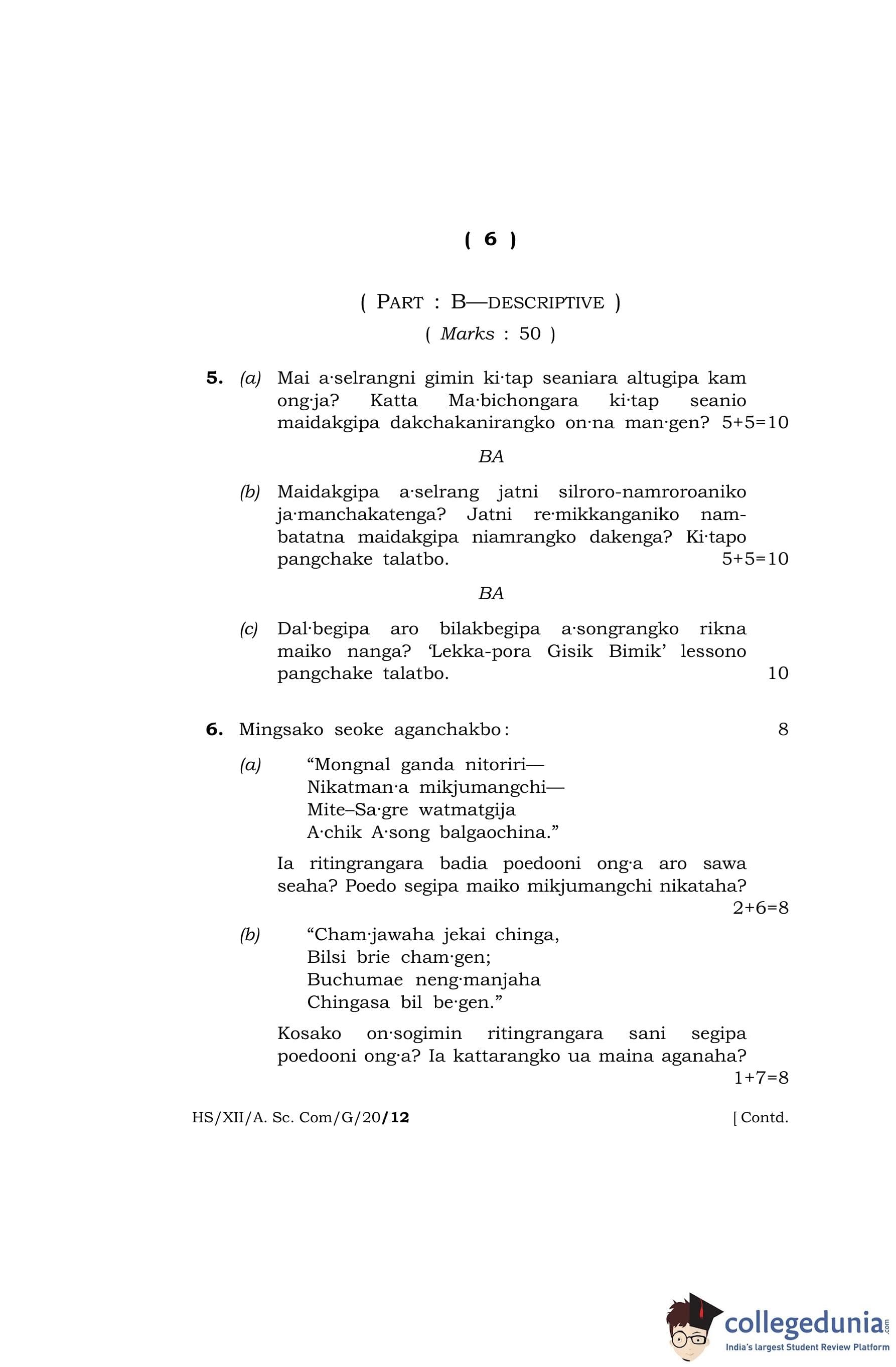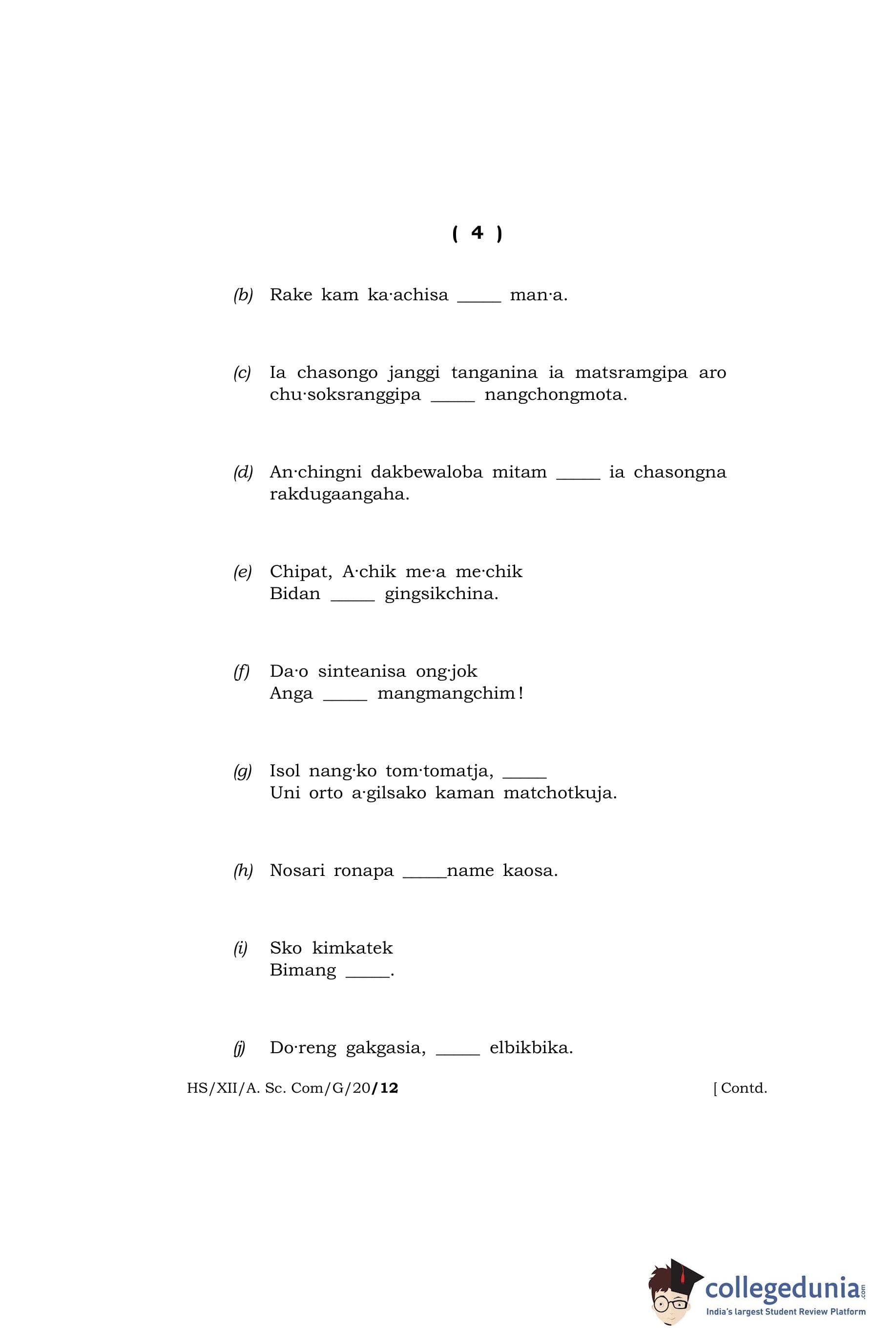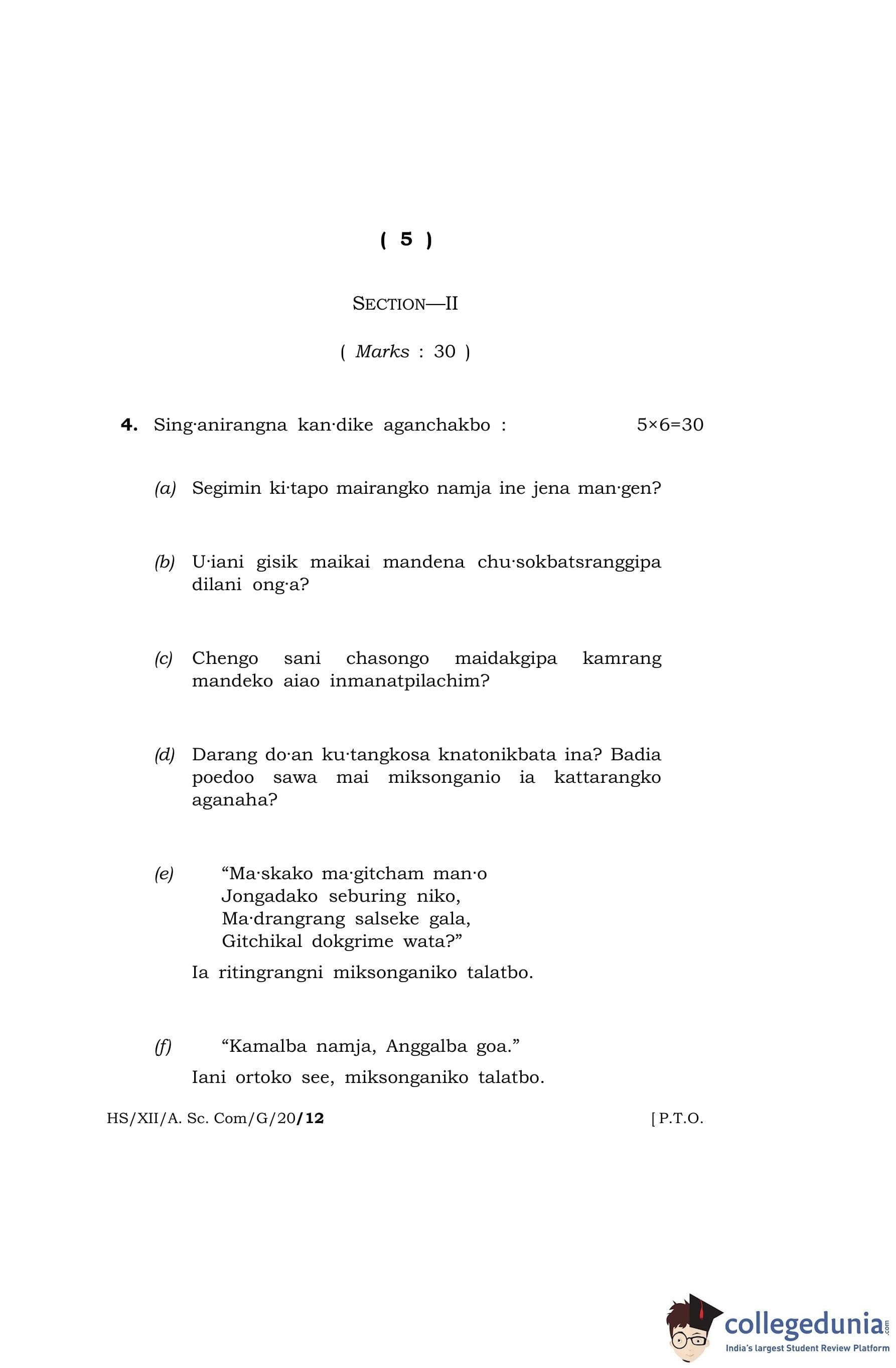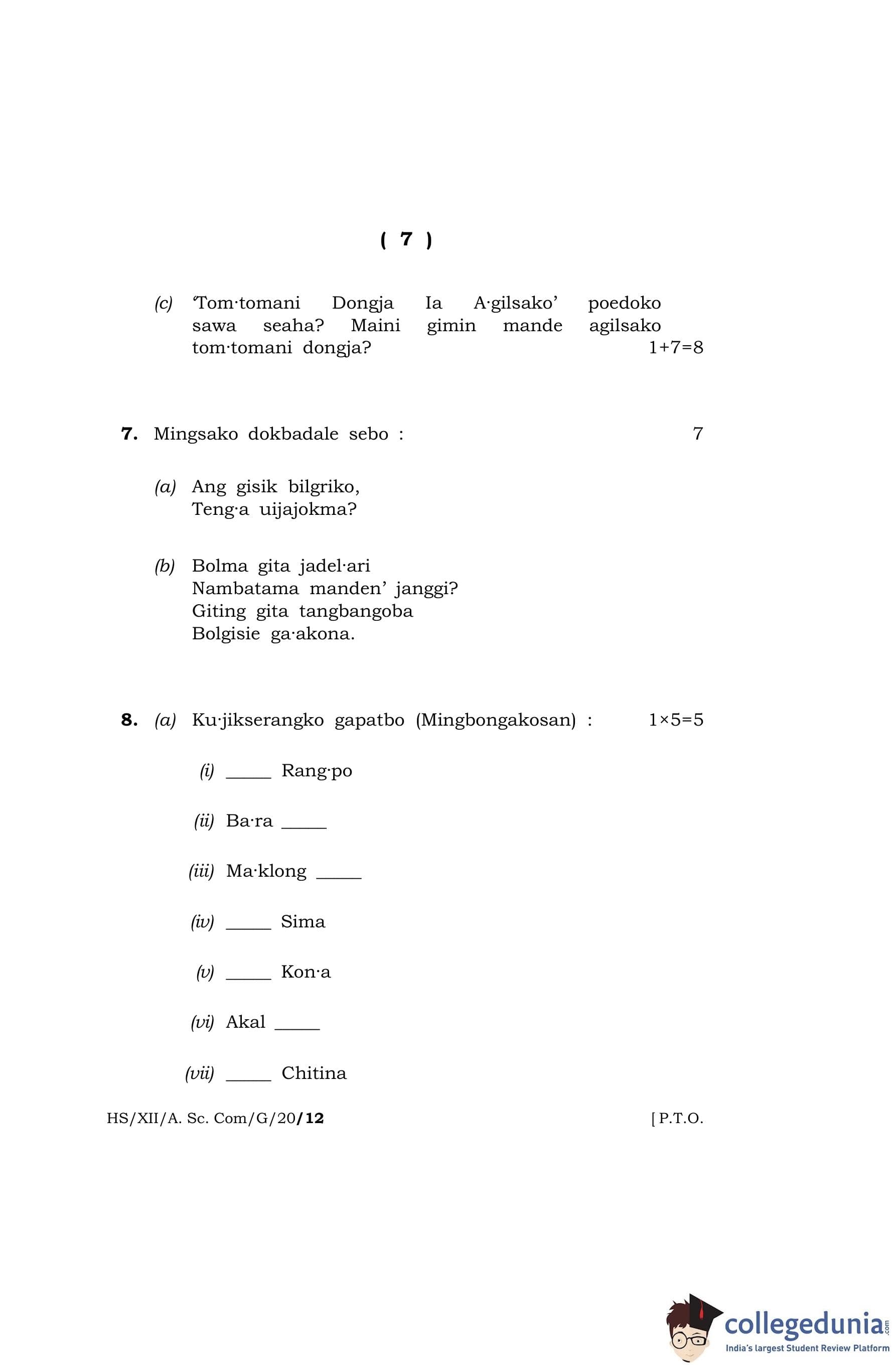 MBOSE Class 12 Garo Question Paper 2020 with Answer Key
