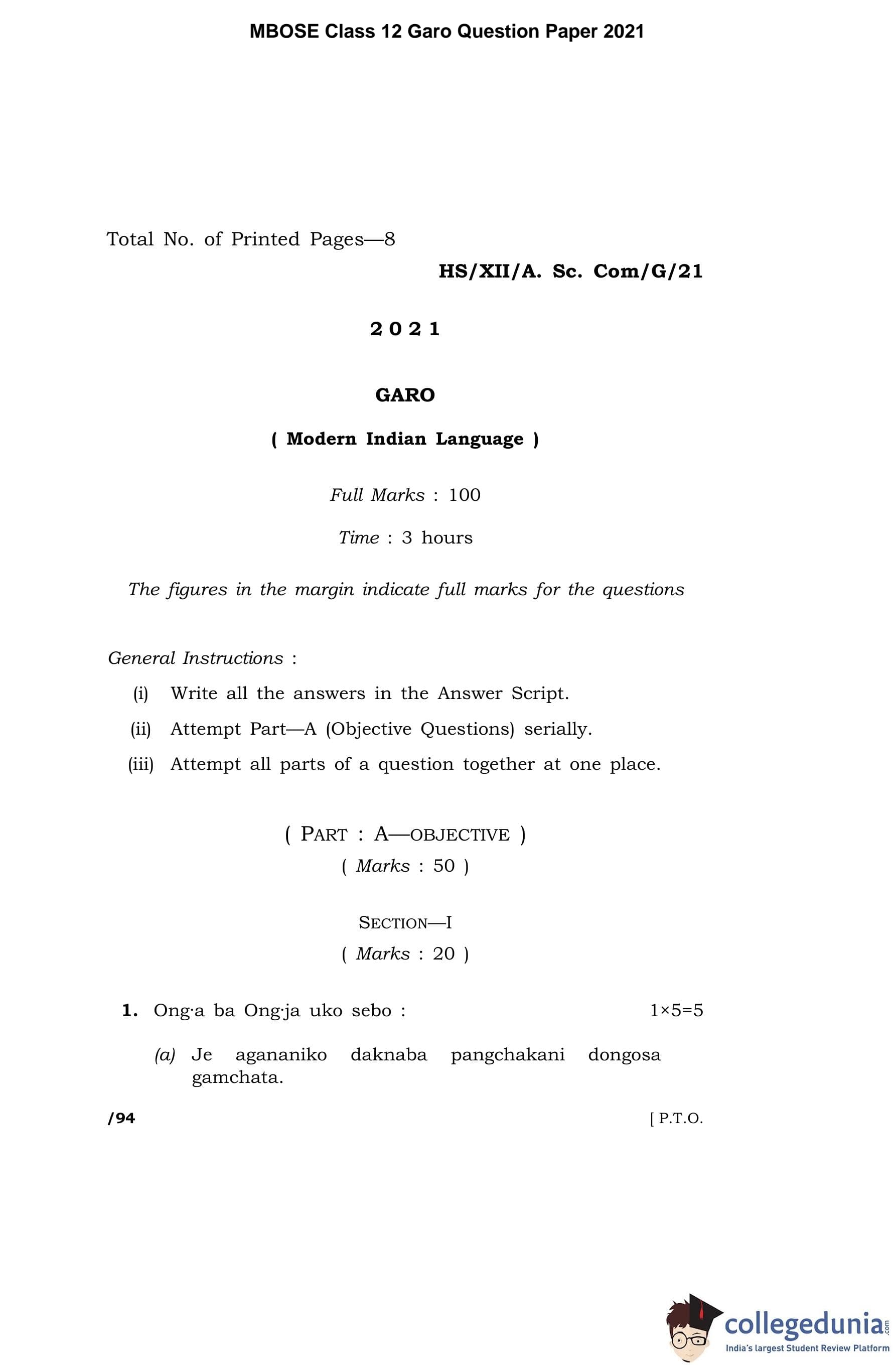 MBOSE Class 12 Garo Question Paper 2021 with Answer Key pdf is available for download here. The exam was conducted by Meghalaya Board of School Education on April 20, 2021 in the Morning Session 10 AM to 1 PM. The question paper comprised a total of 9 questions divided among 2 sections.