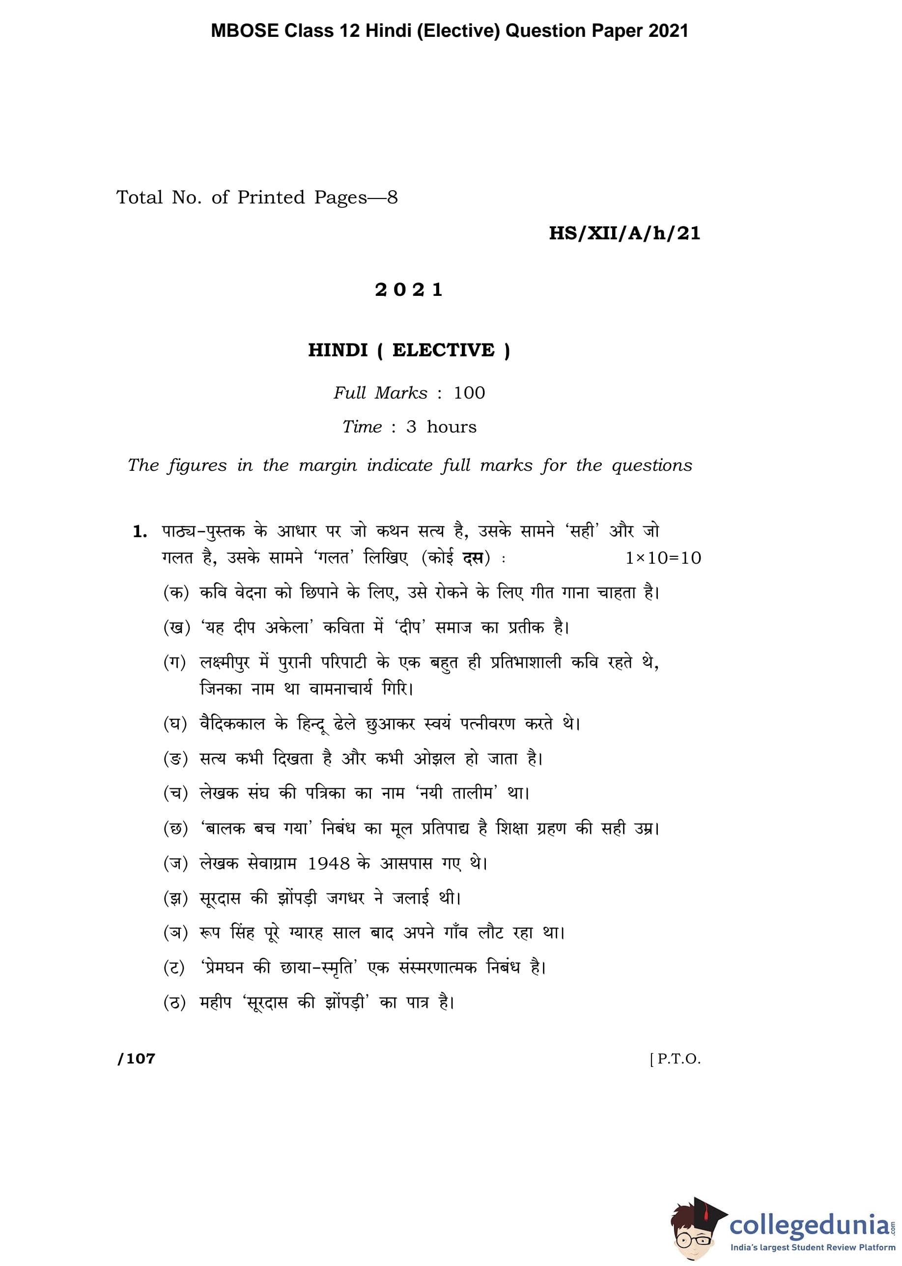 | MBOSE Class 12 Hindi (Elective) Question Paper 2021 PDF | MBOSE Class 12 Hindi (Elective) Answer Key 2021 PDF |