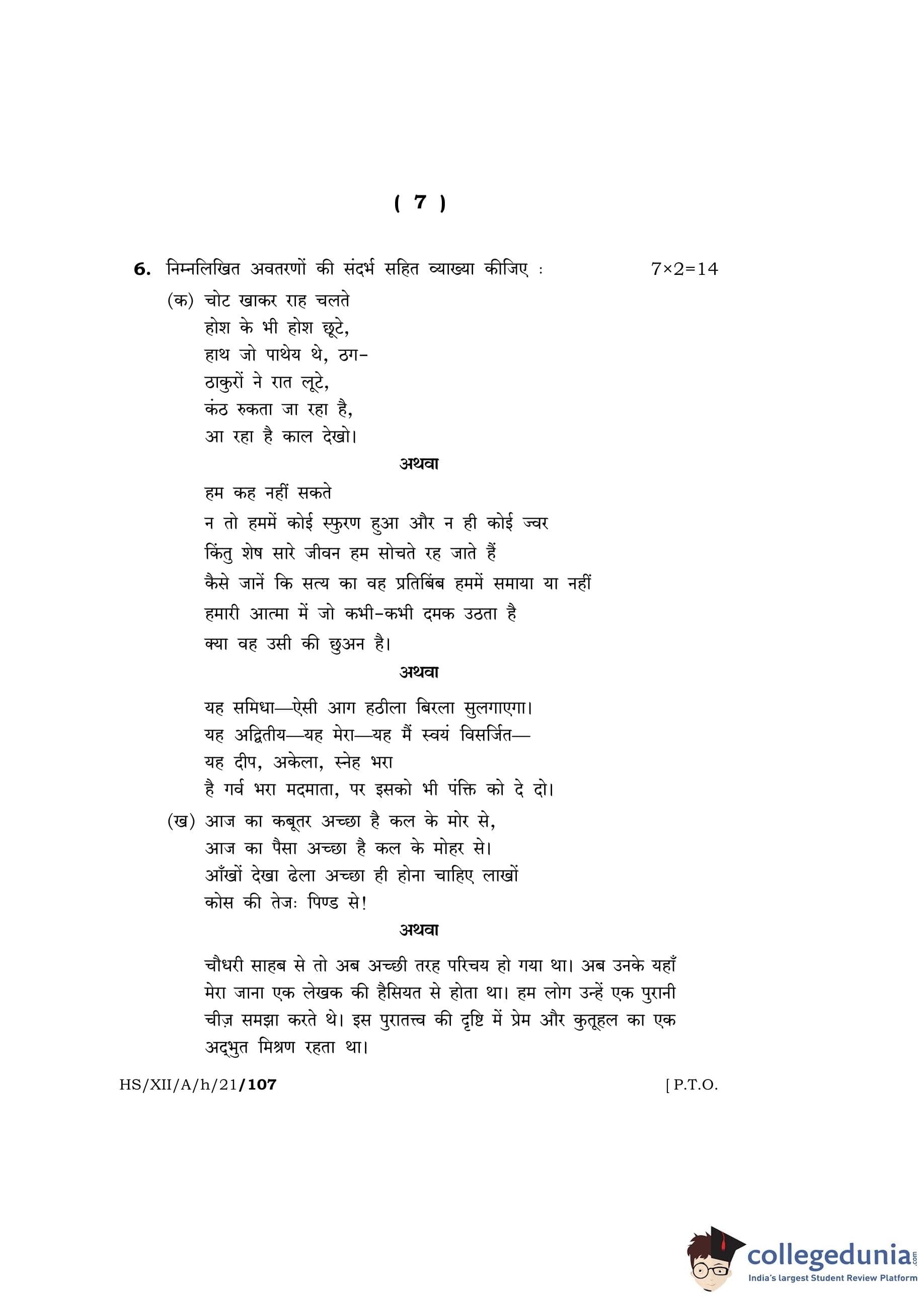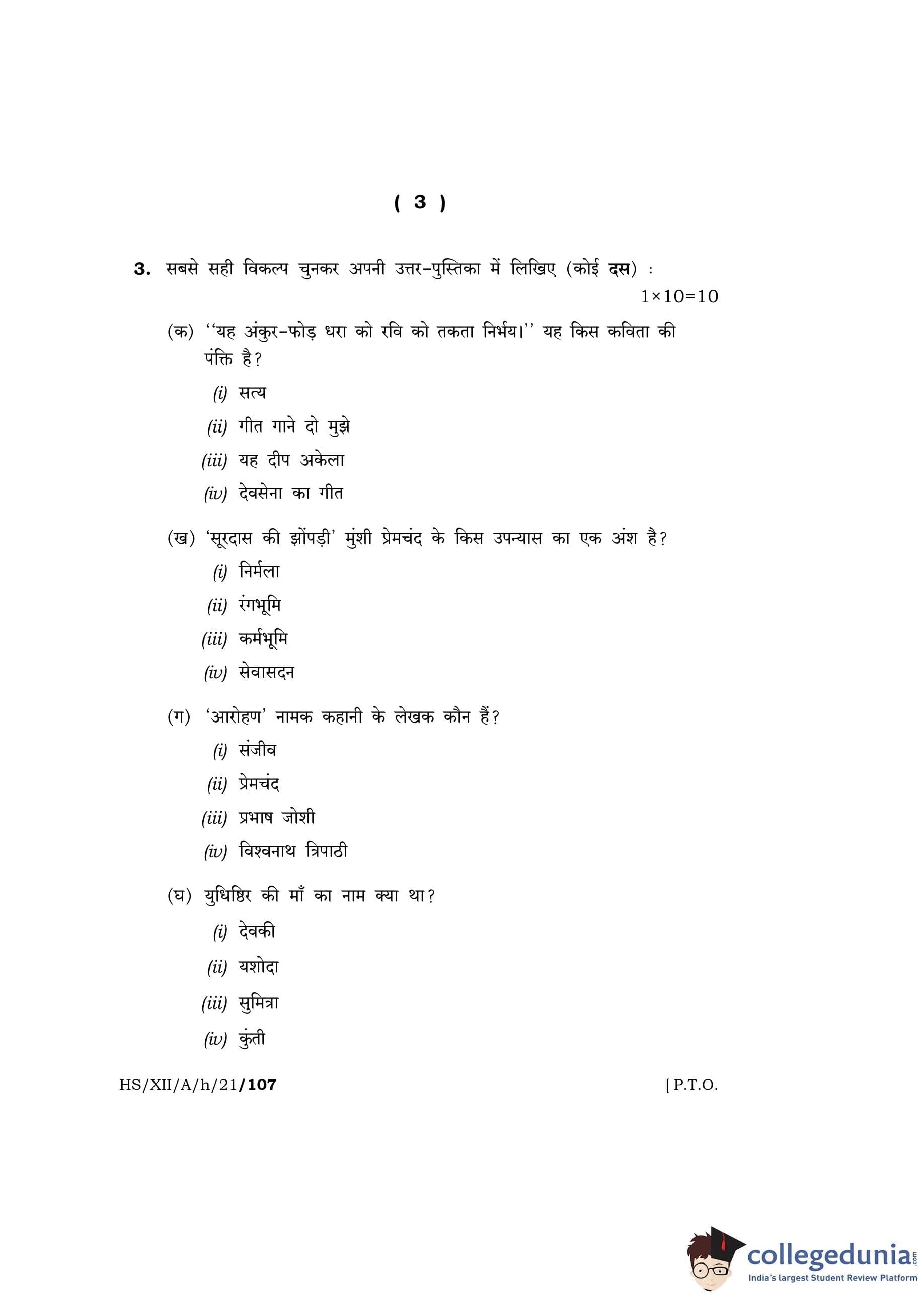 MBOSE Class 12 Hindi (Elective) Question Paper 2021 with Answer Key