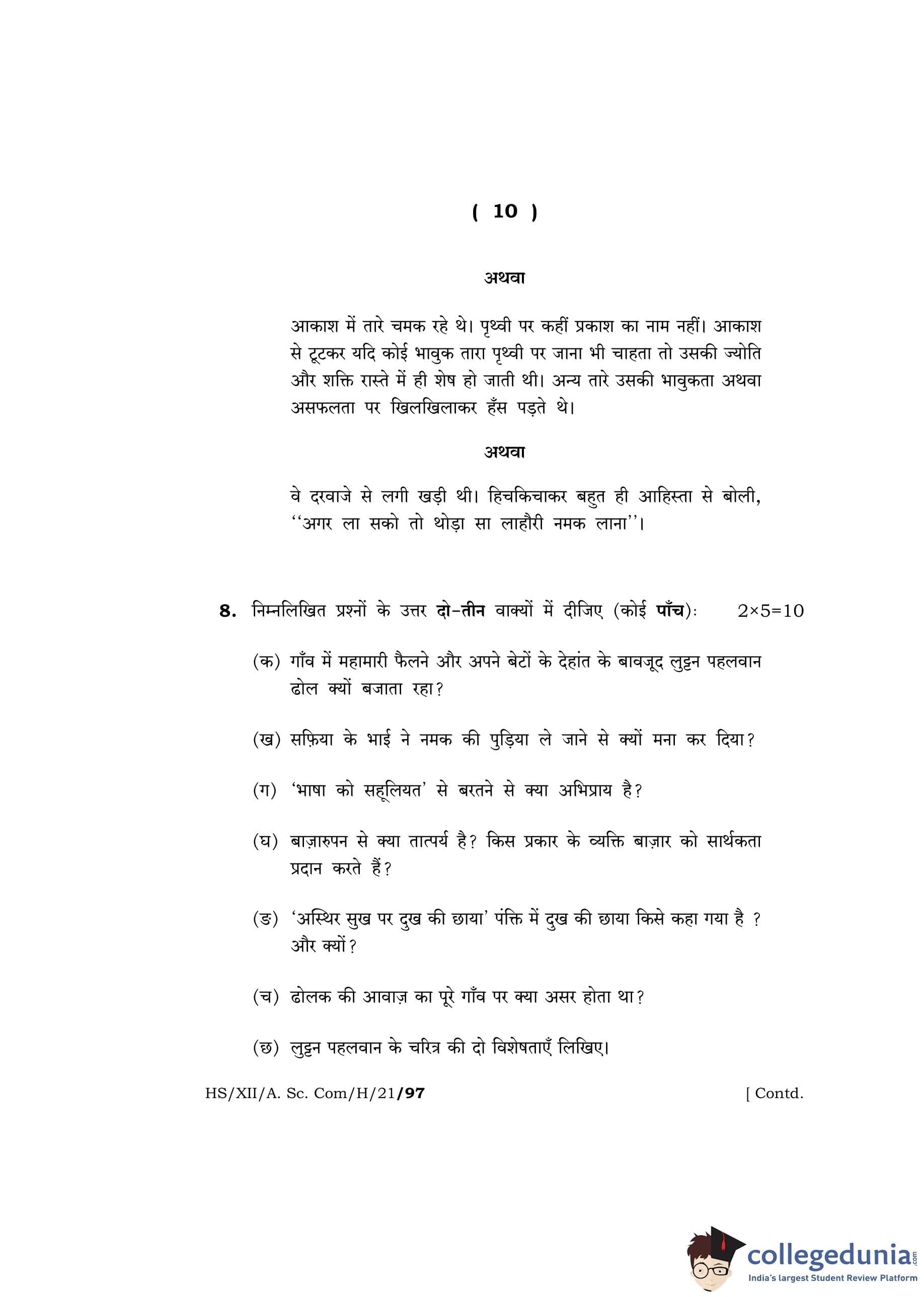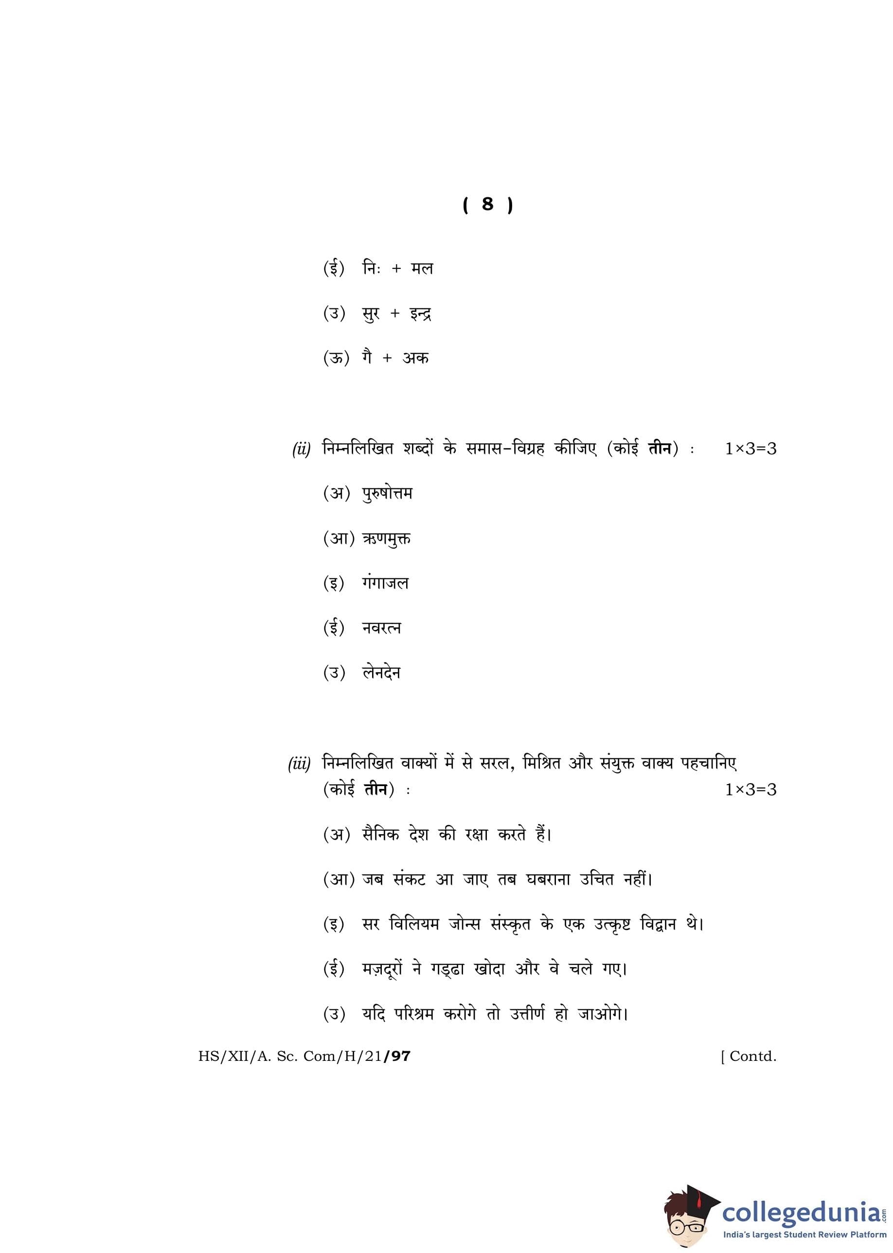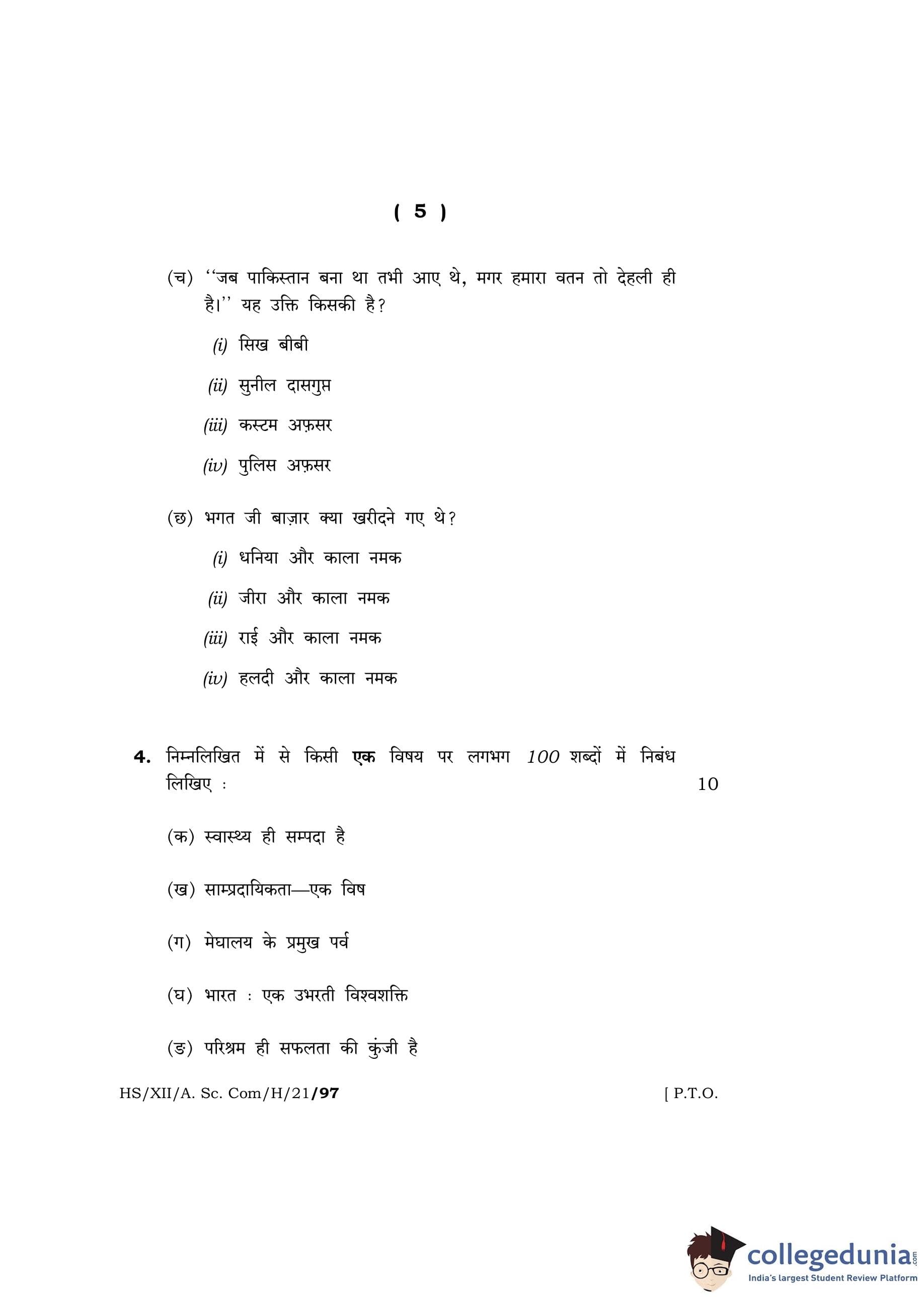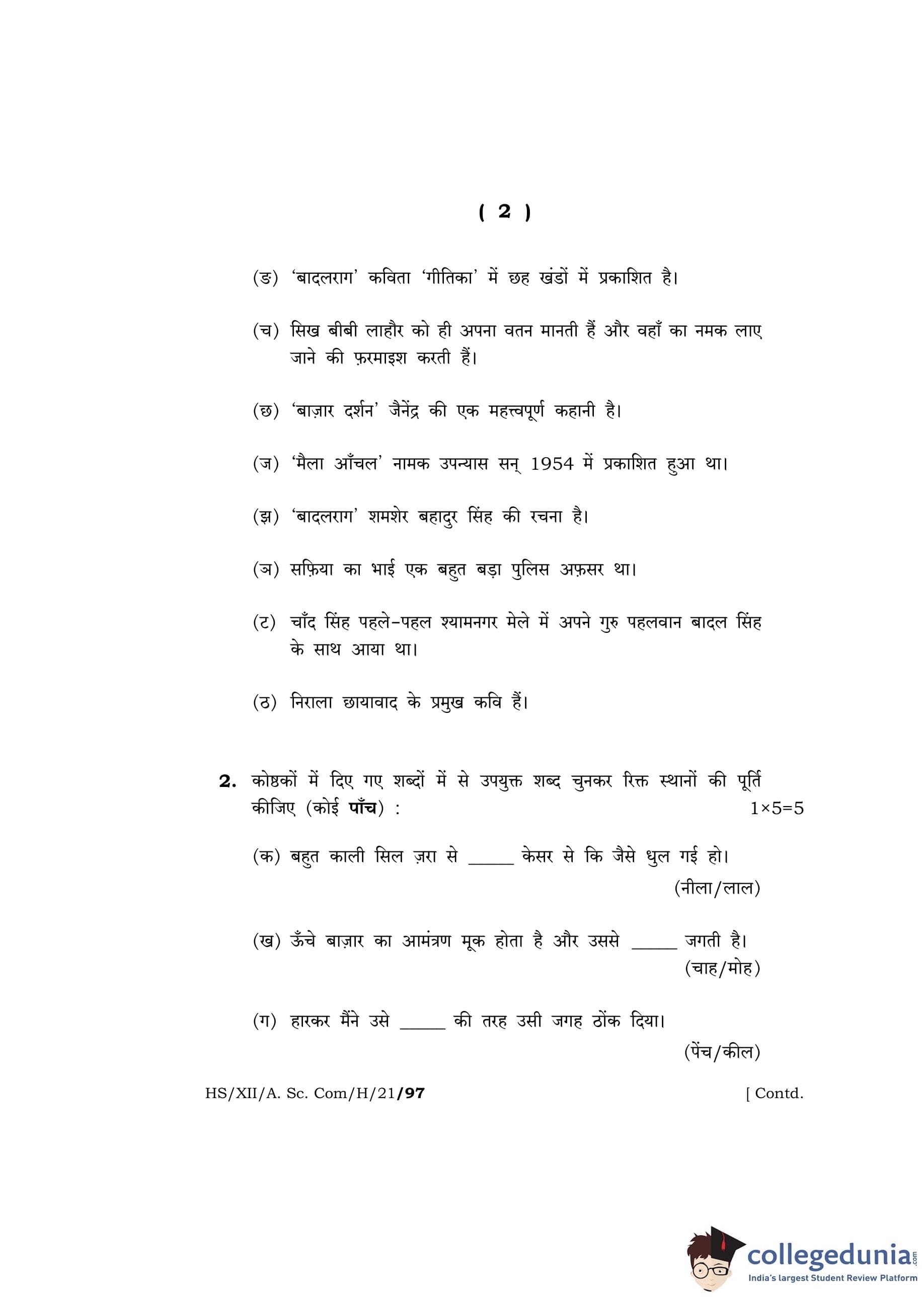 MBOSE Class 12 Hindi Question Paper 2021 with Answer Key