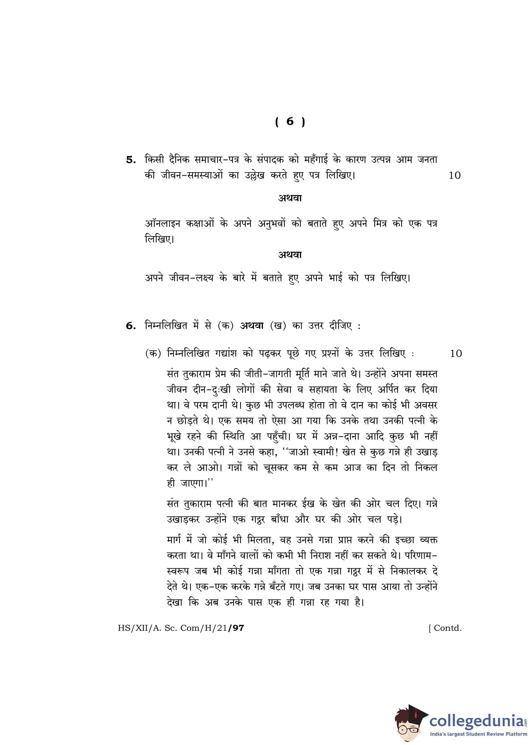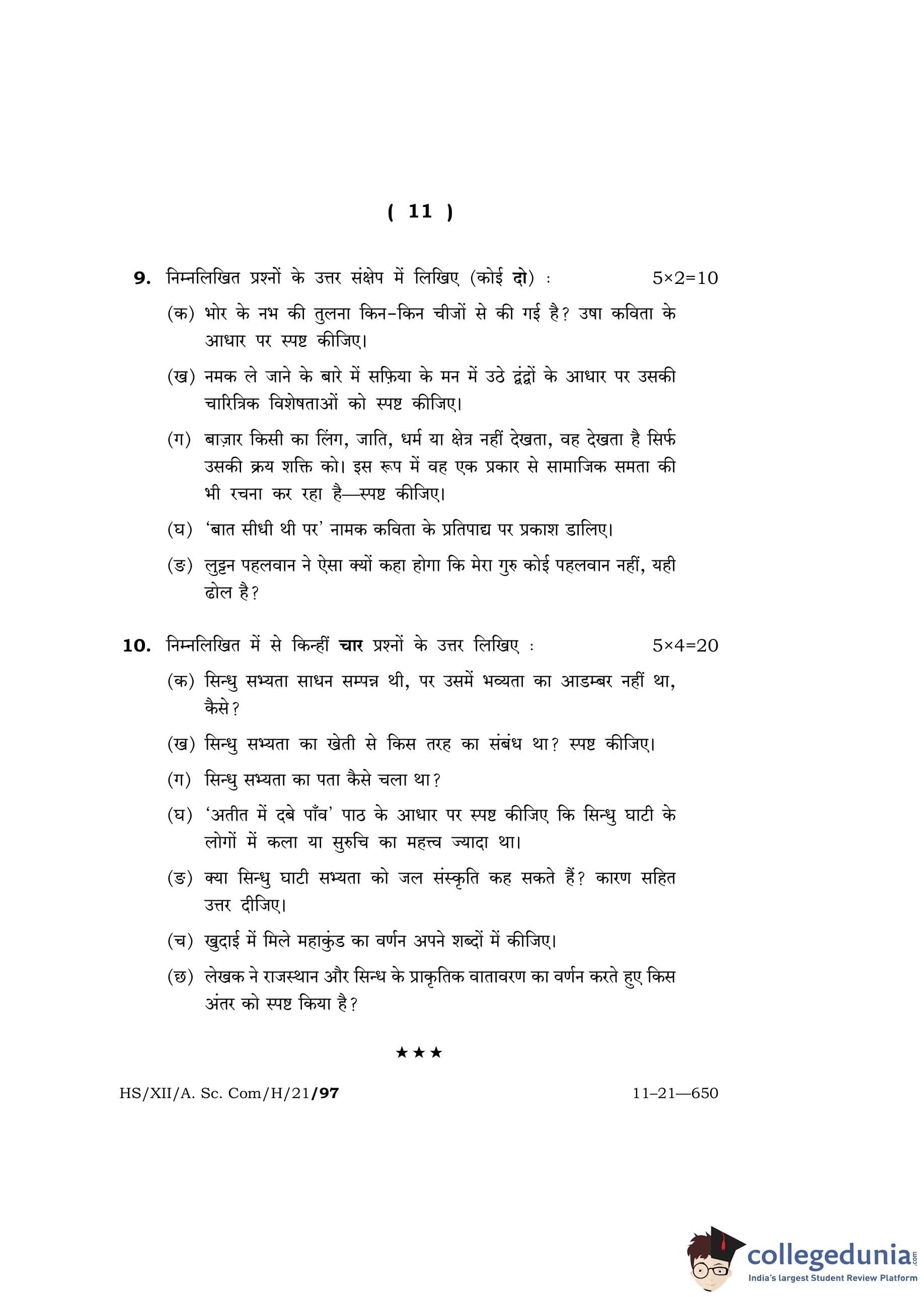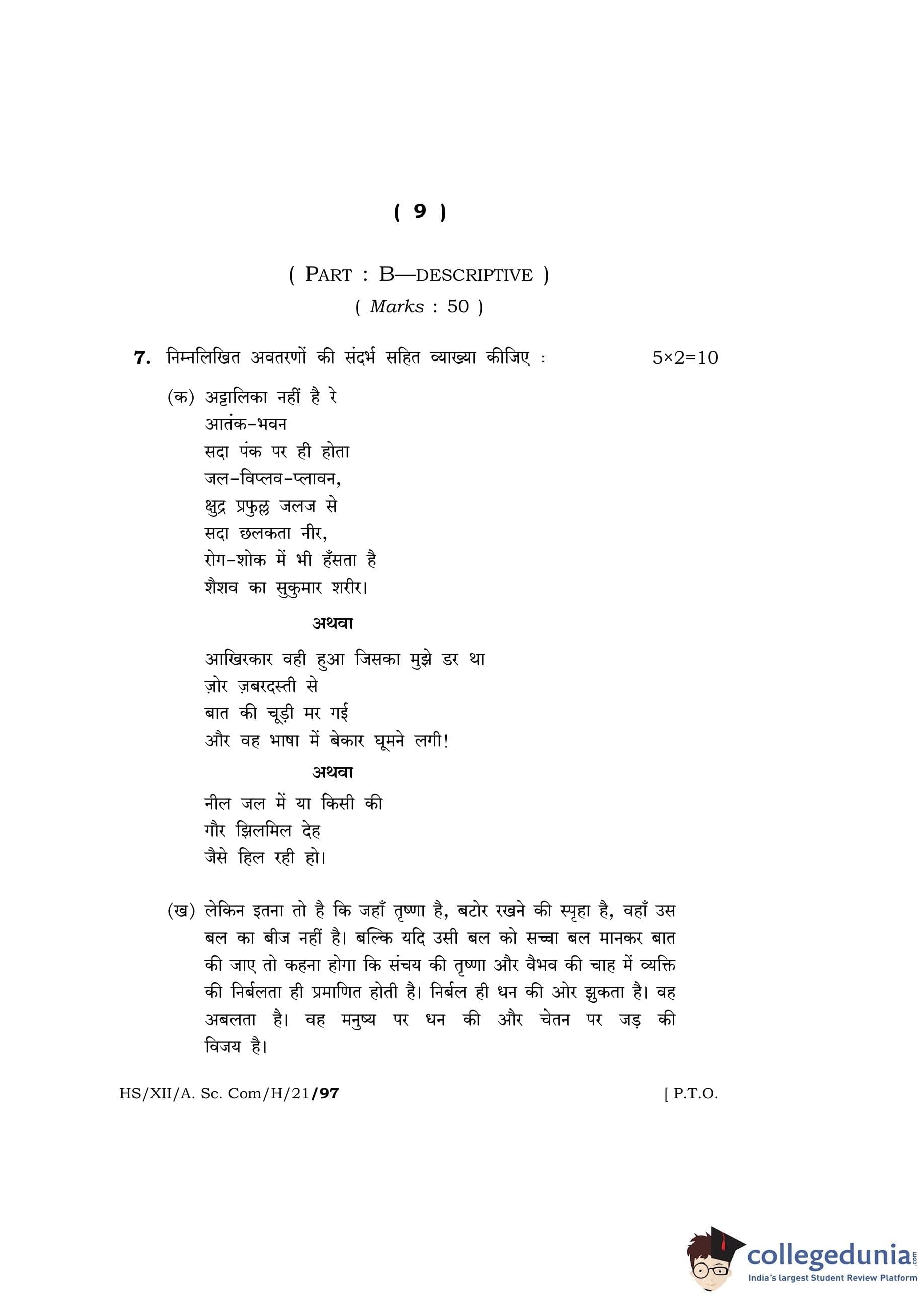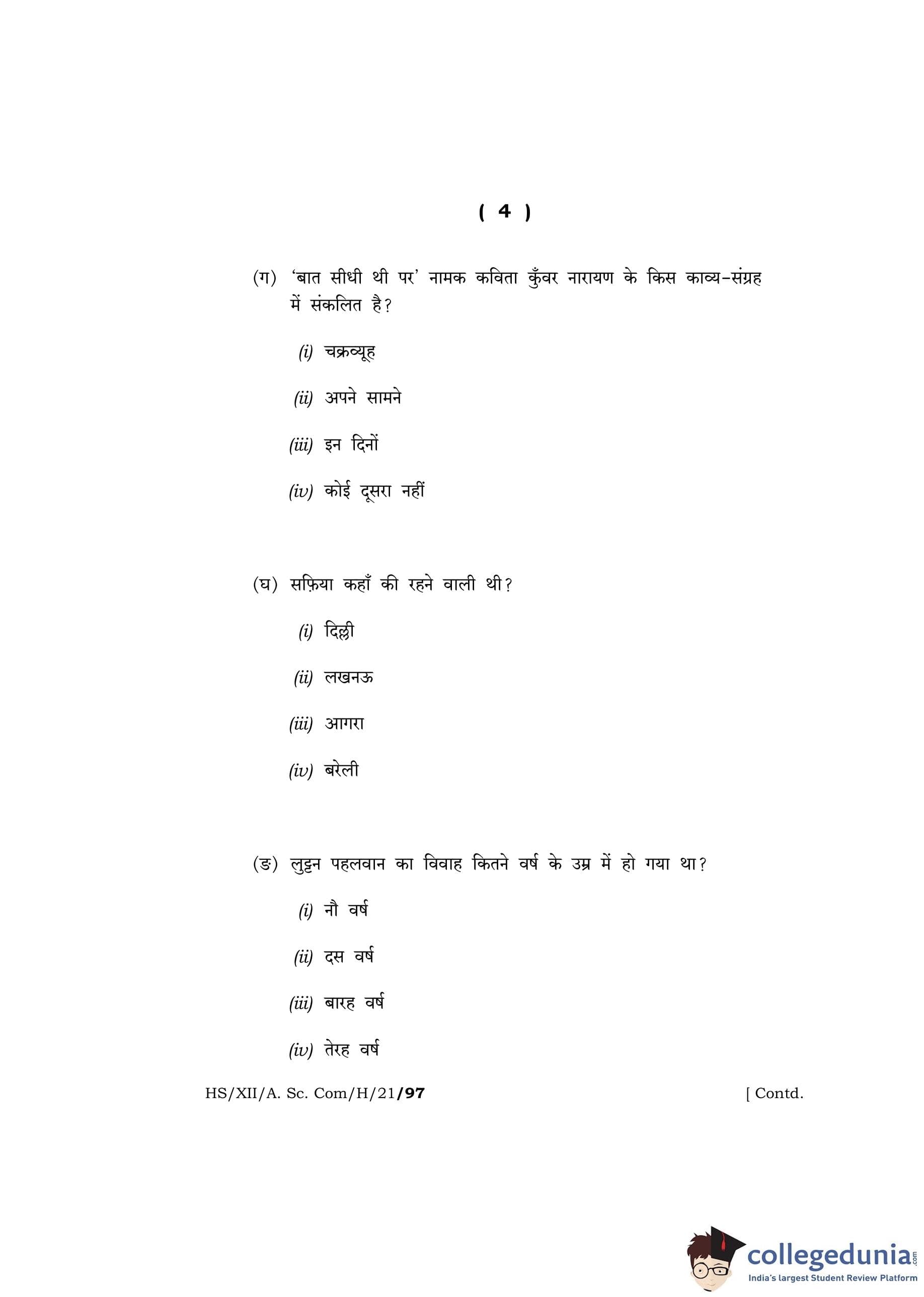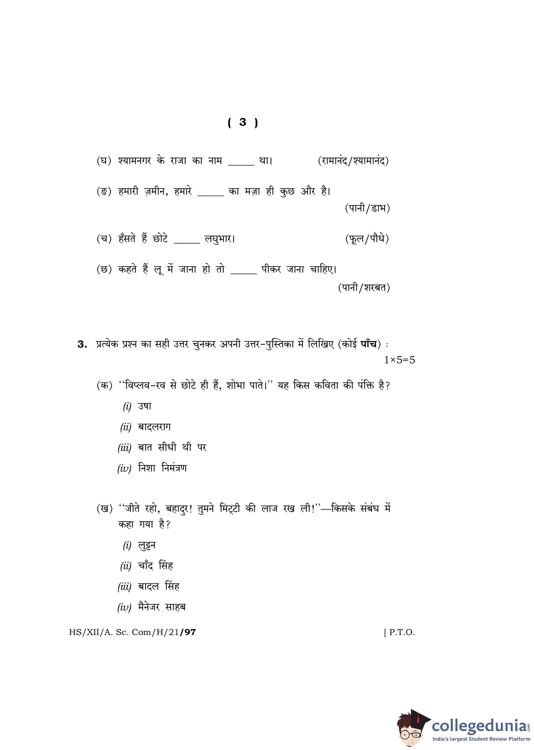 MBOSE Class 12 Hindi Question Paper 2021 with Answer Key