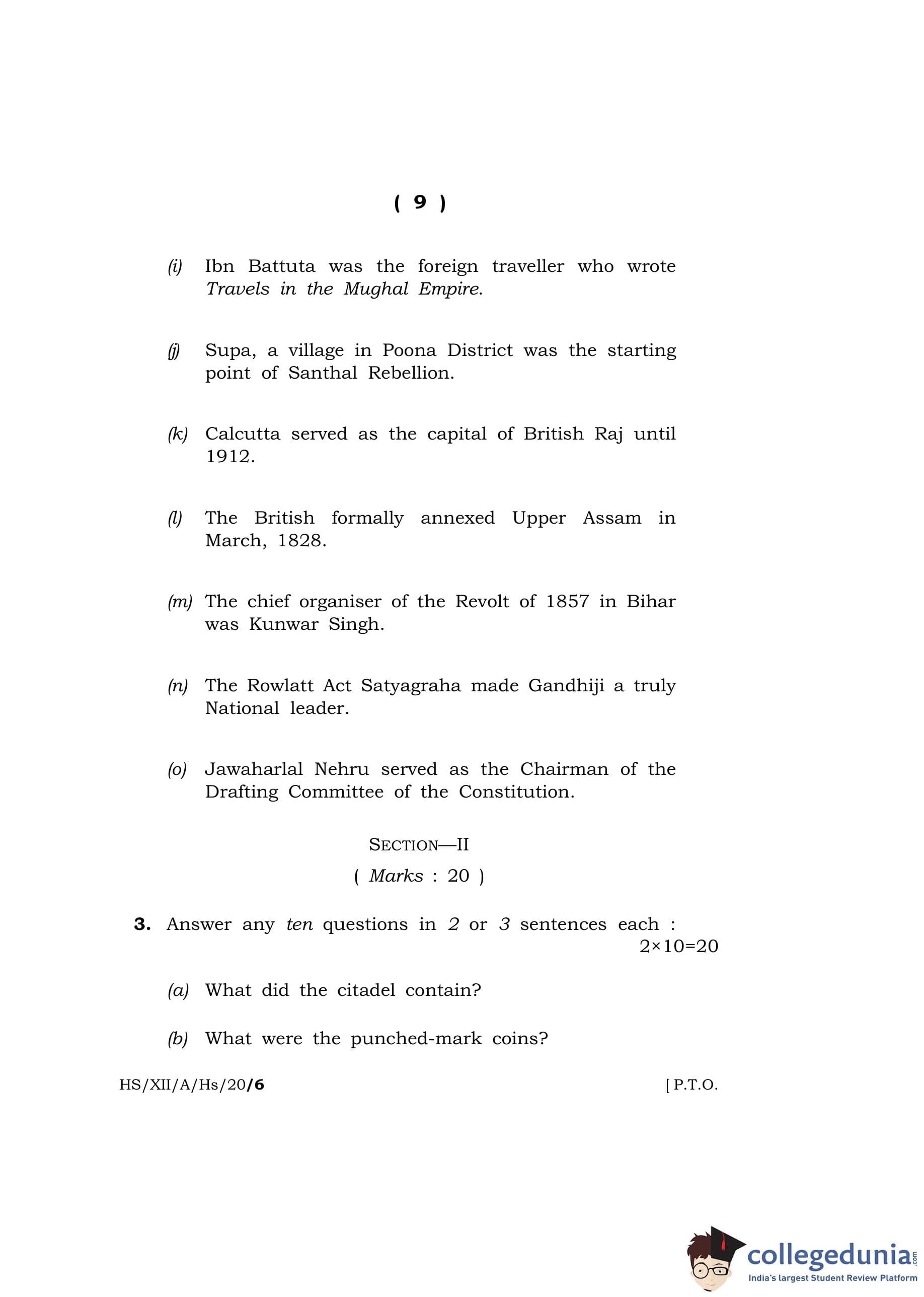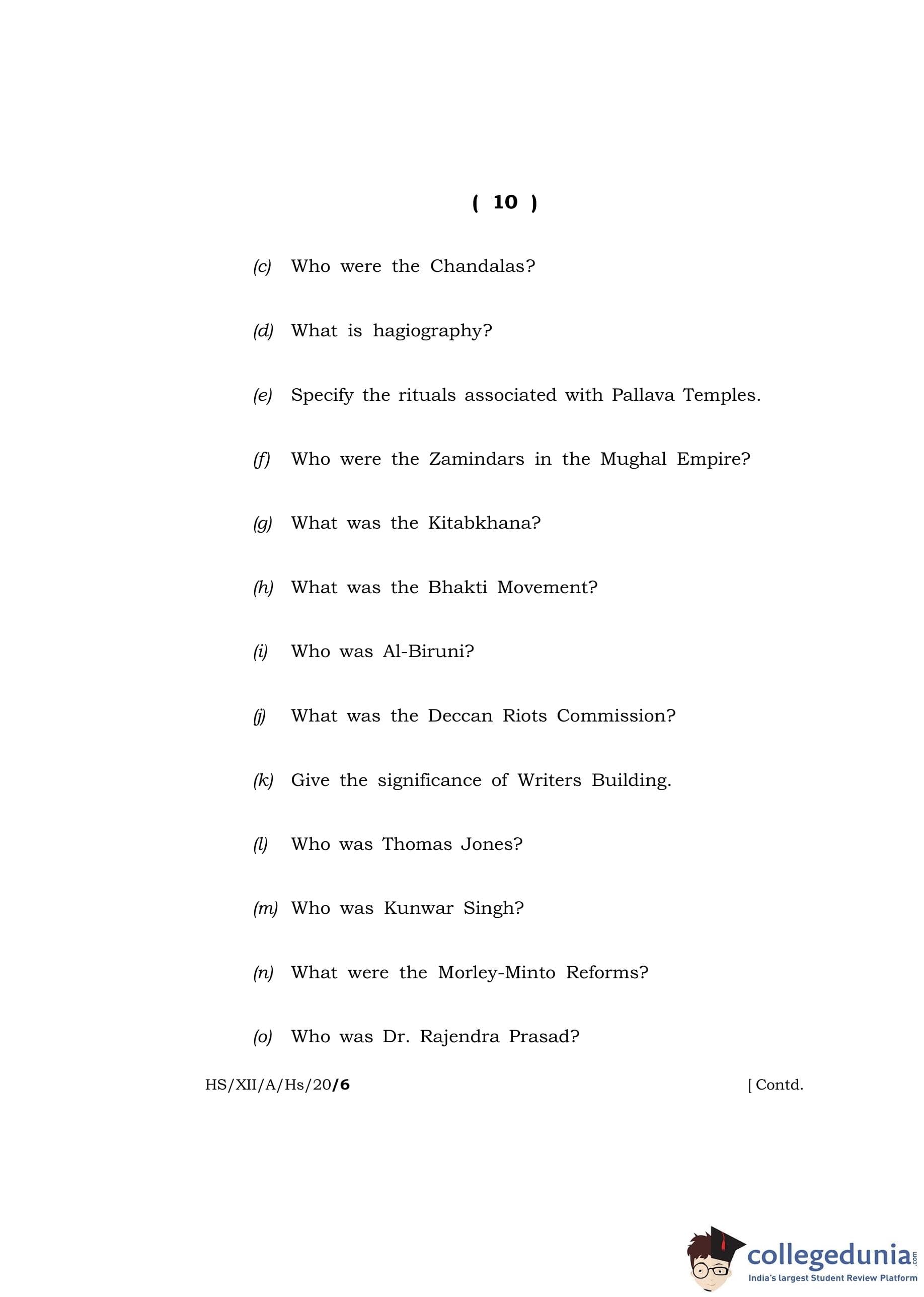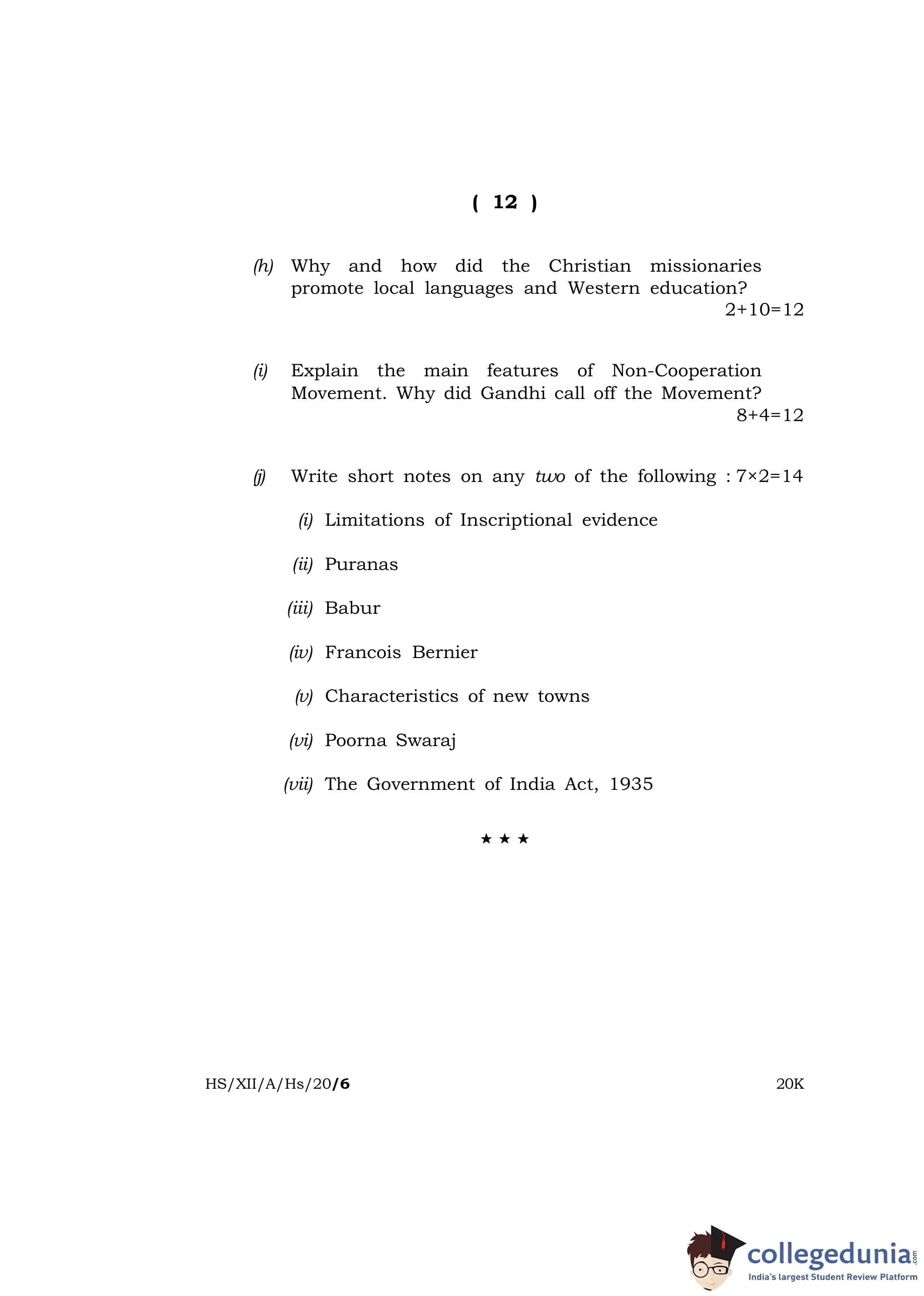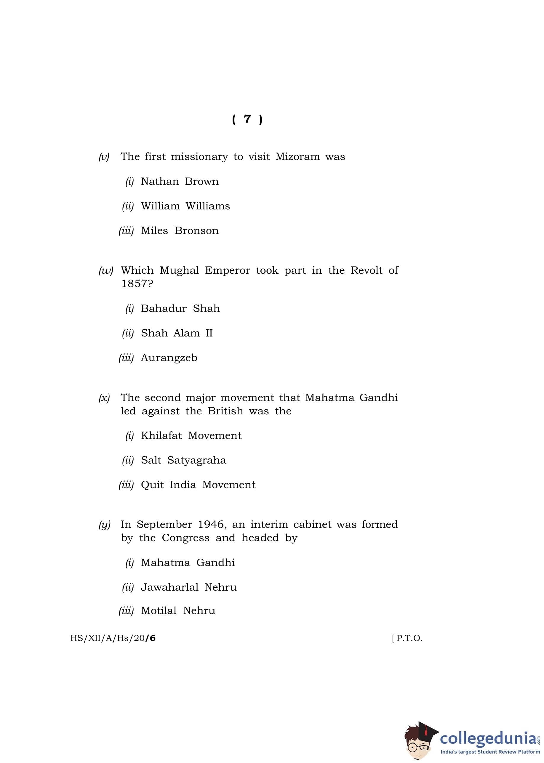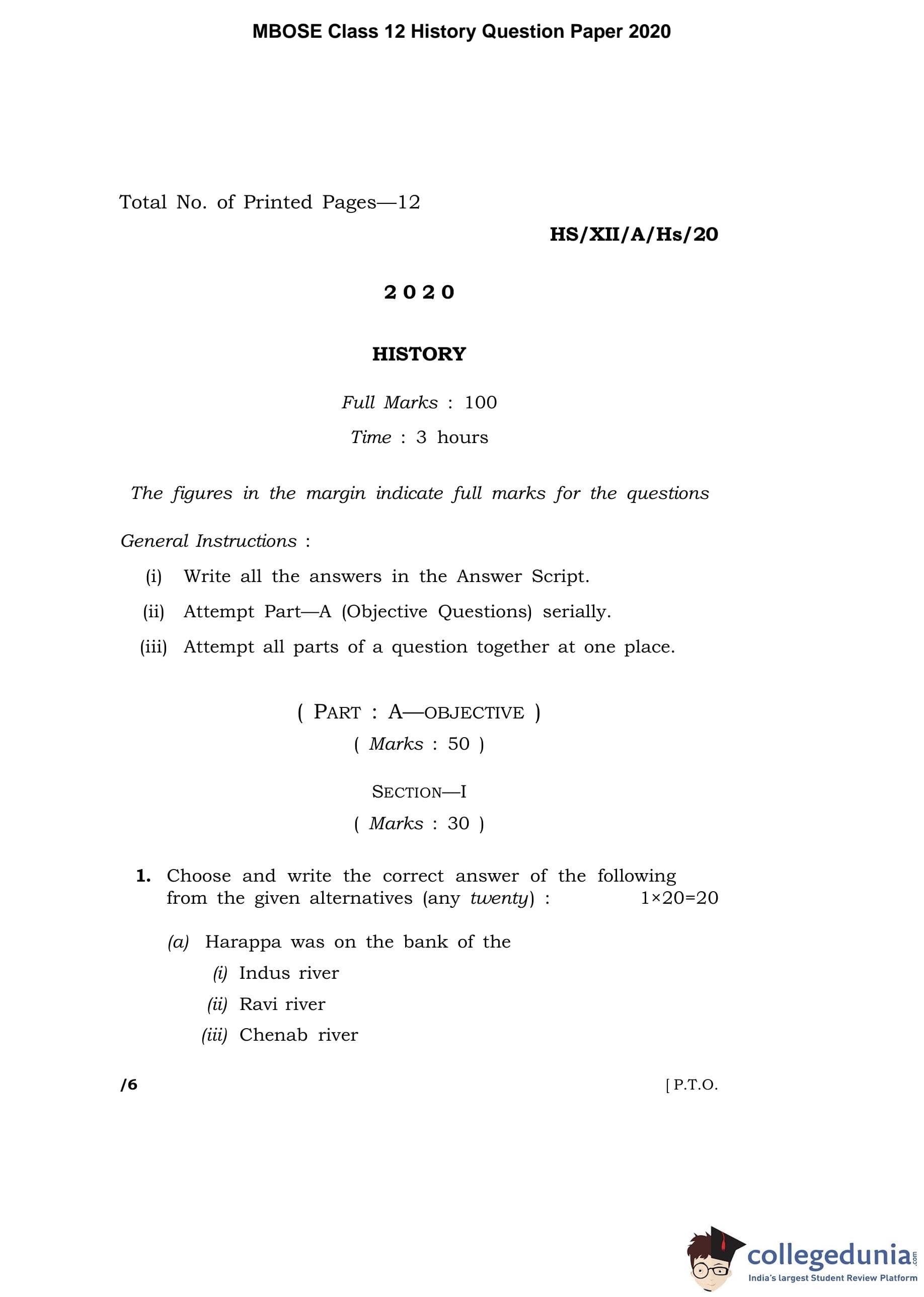 MBOSE Class 12 History Question Paper 2020 with Answer Key
