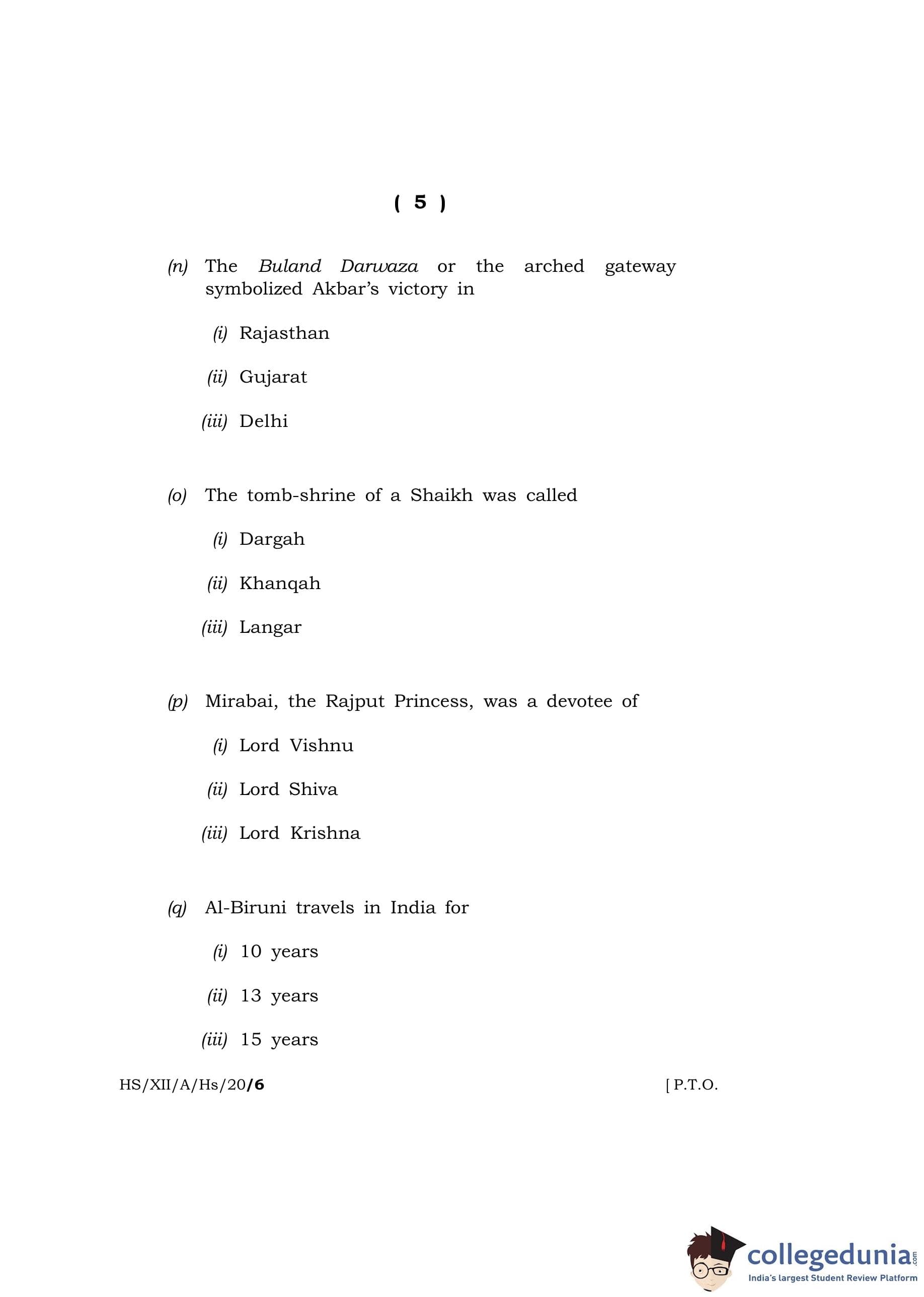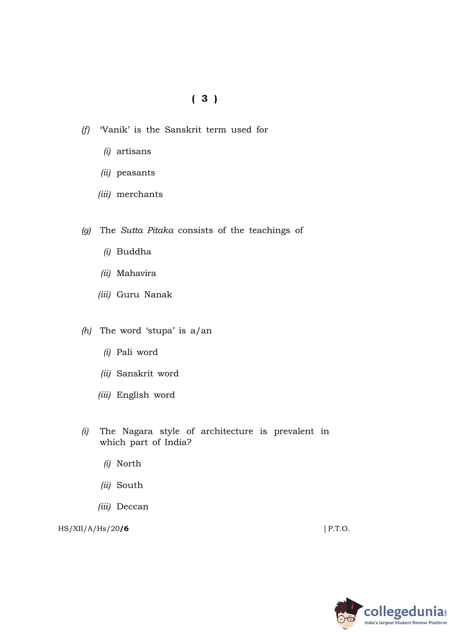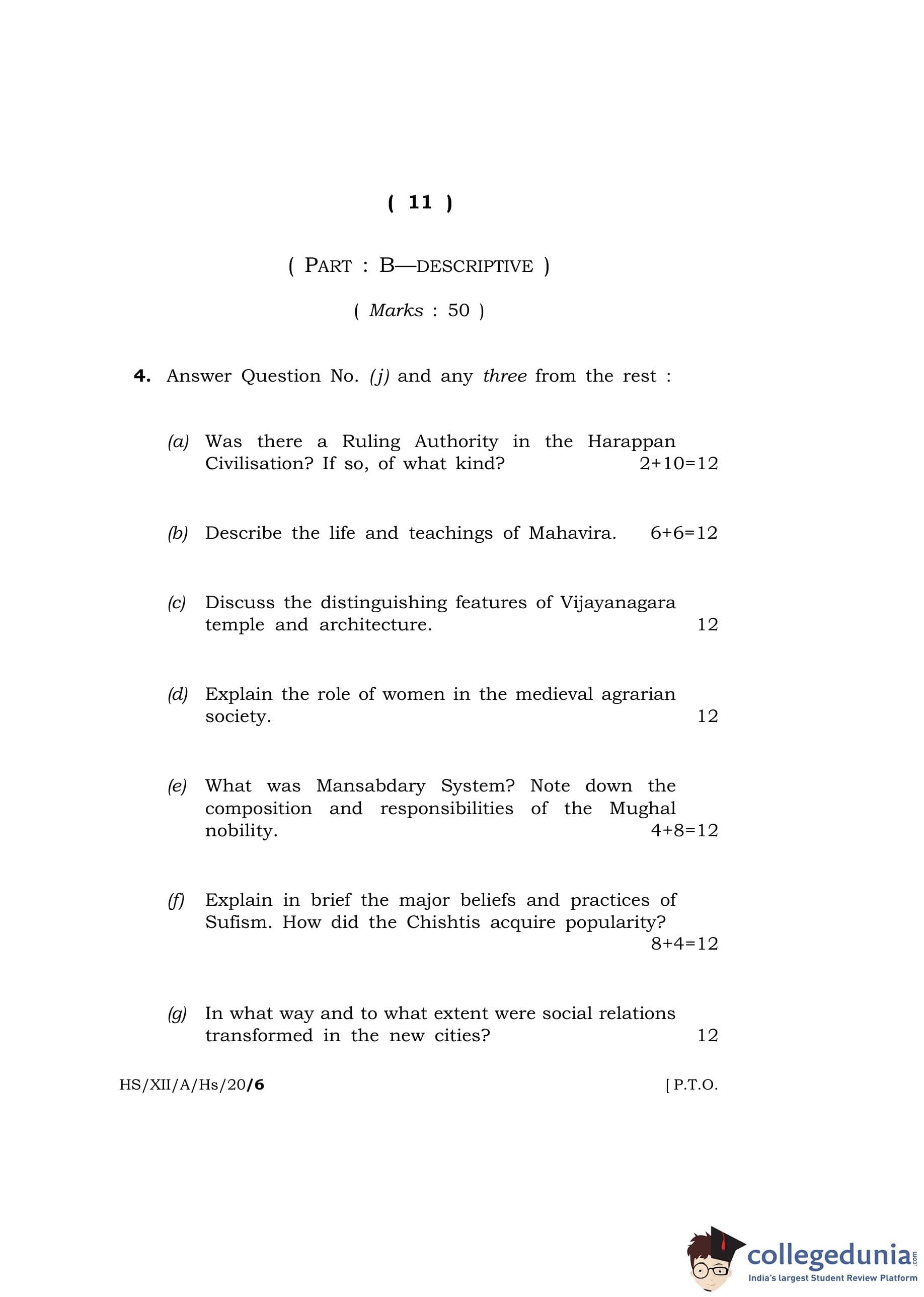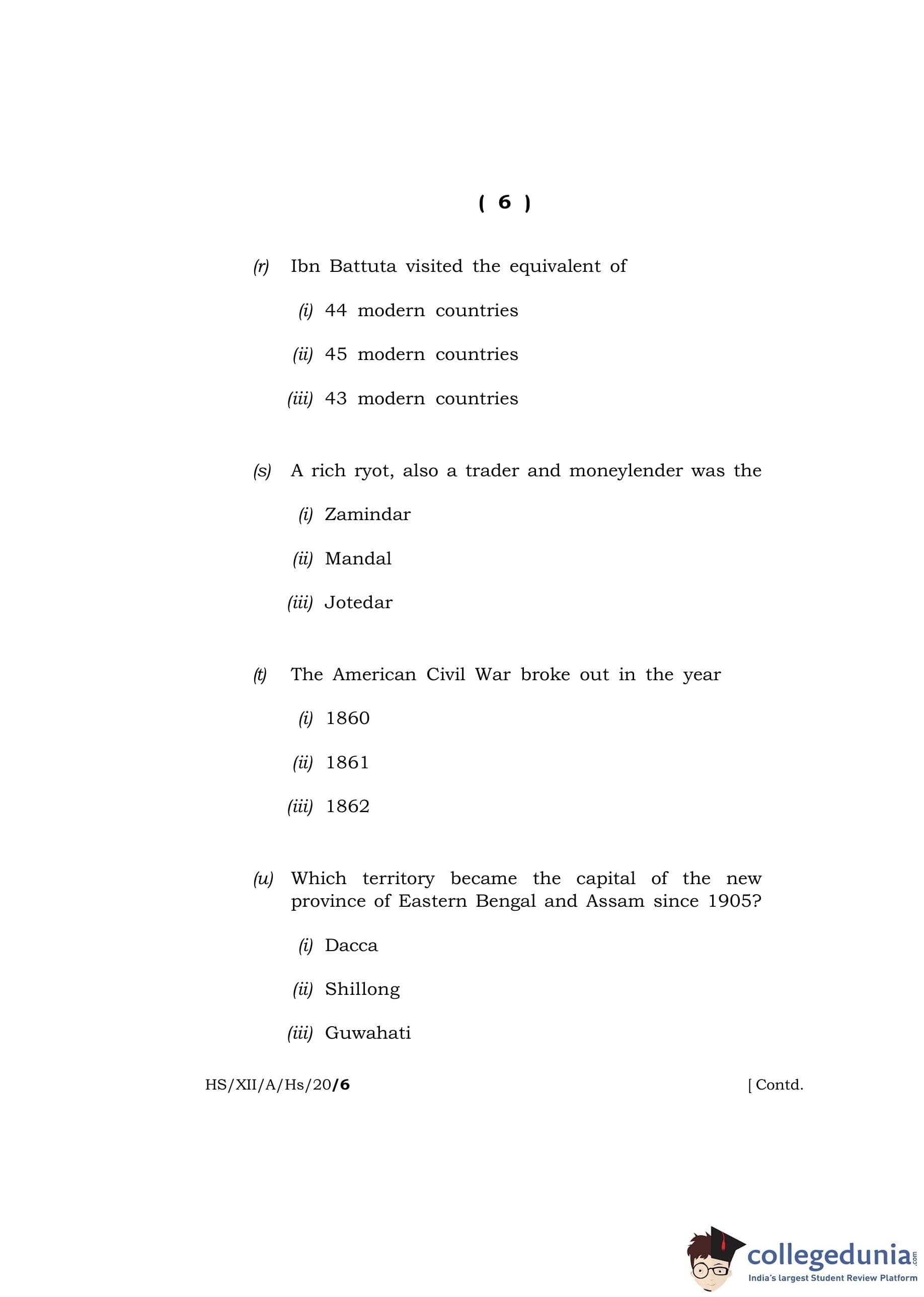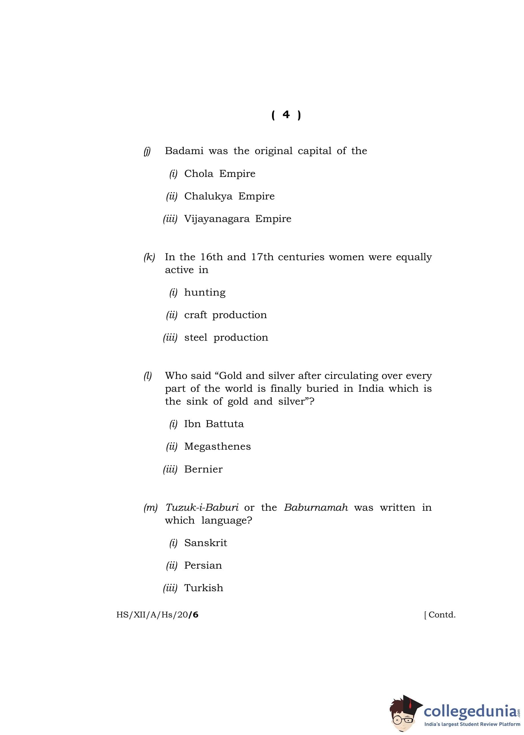 MBOSE Class 12 History Question Paper 2020 with Answer Key